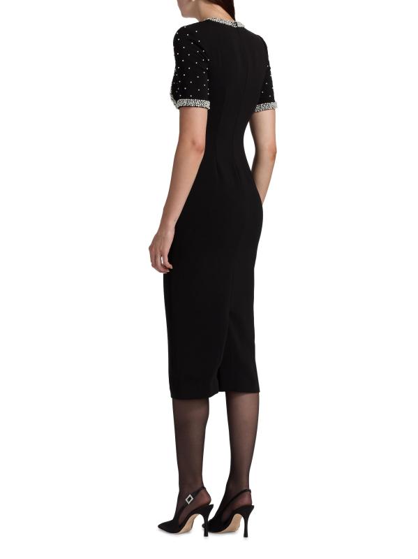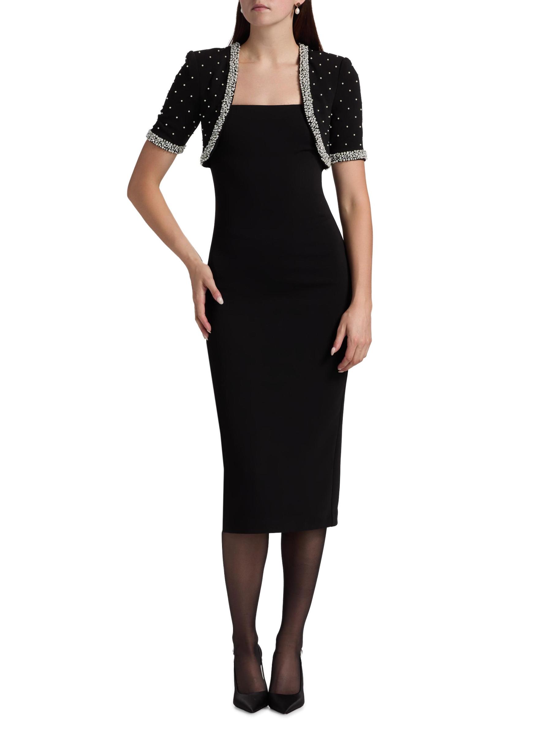 Crafted of stretch fabric, this vintage-inspired cocktail dress from Badgley Mischka is styled with imitation pearls and rhinestones at the bolero-style top.