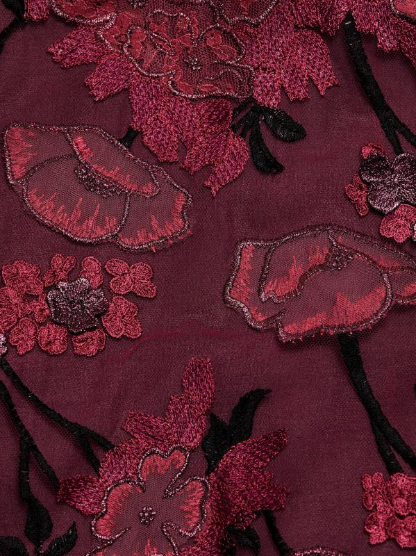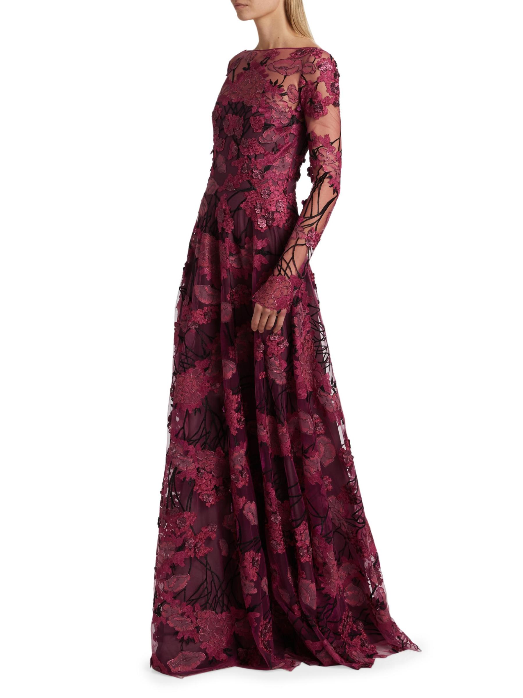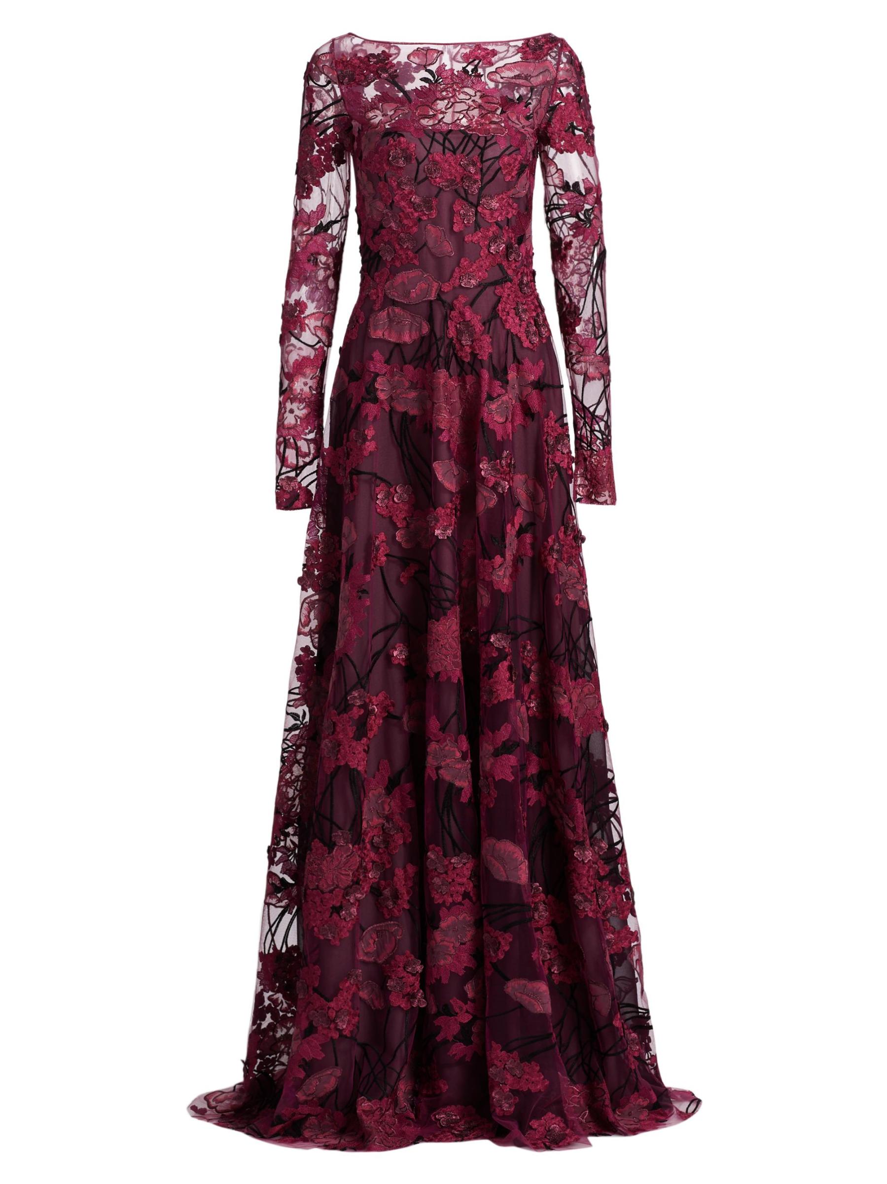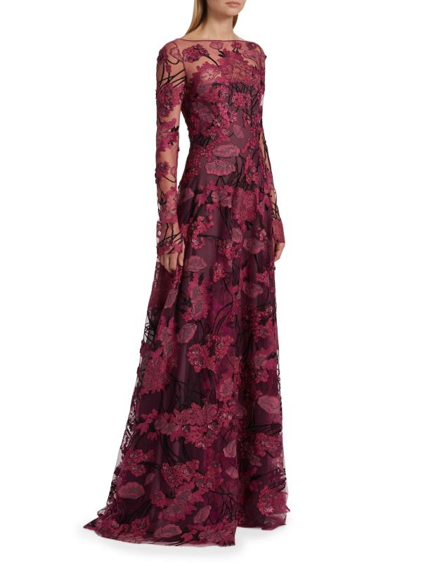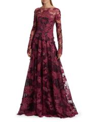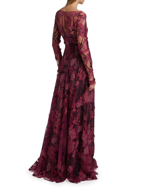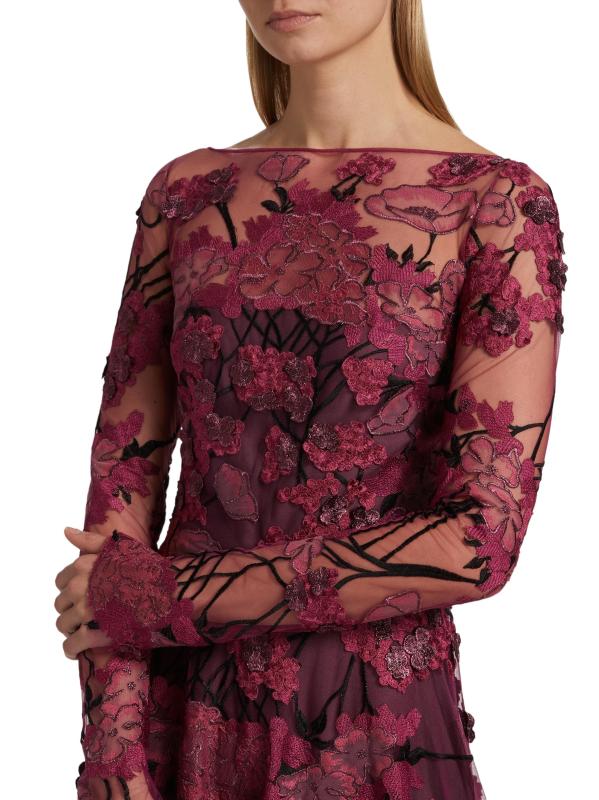 Embroidered Mesh Long-Sleeve Gown