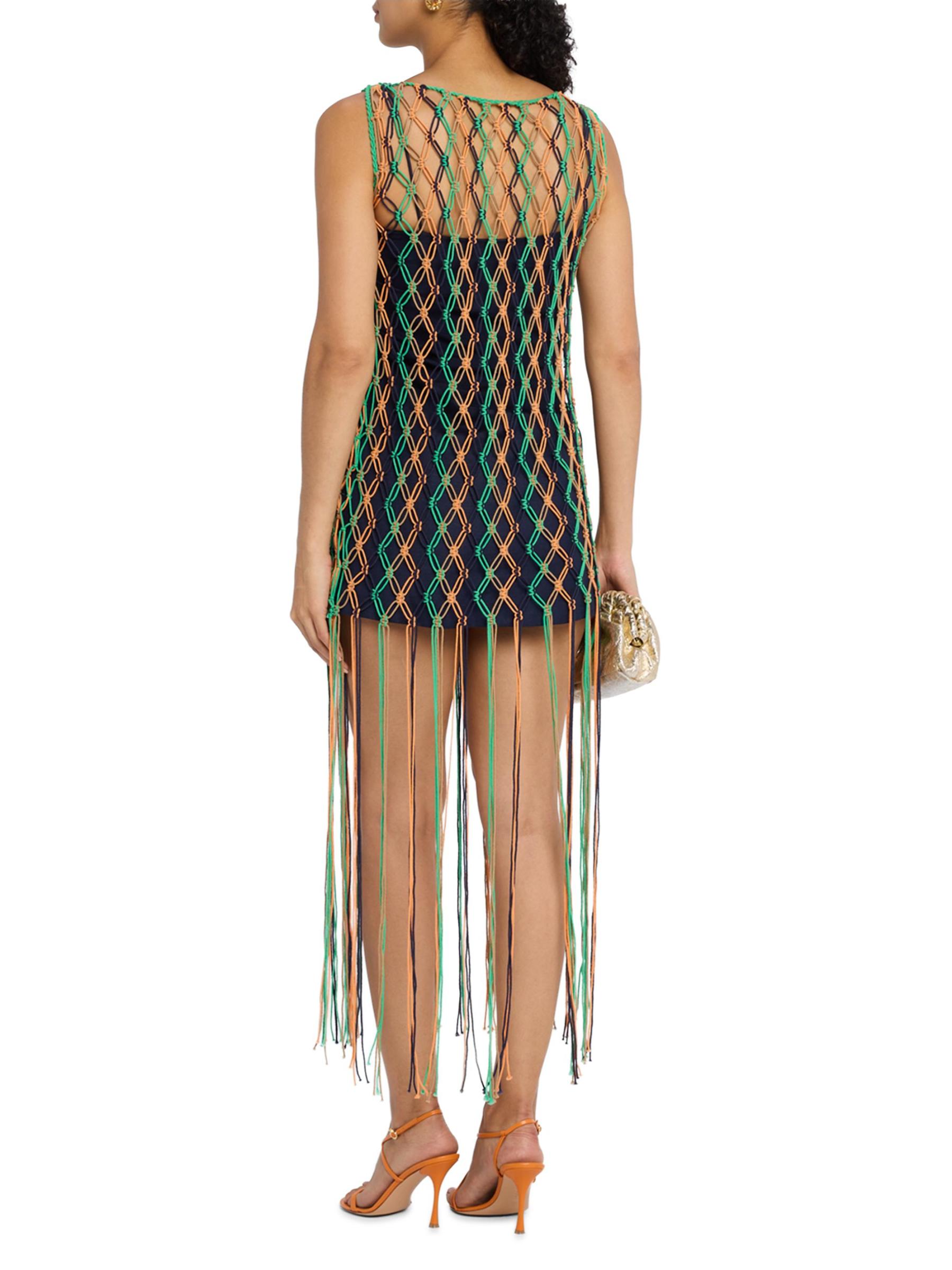 A bold statement piece, the Emelia dress by Significant Other is crafted of woven multi-color macramé finished with a flowing, fringe hem. This style includes a separate slip dress.