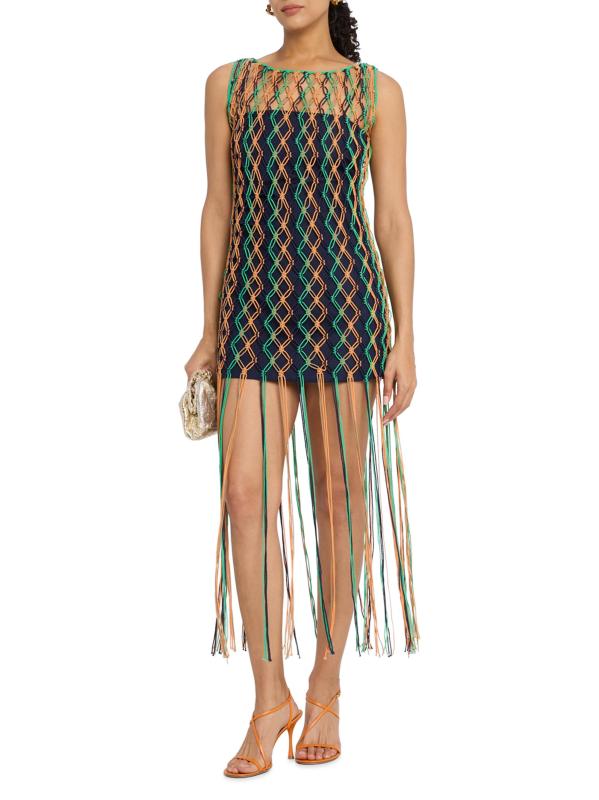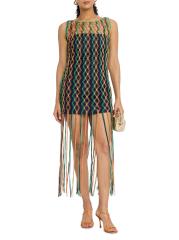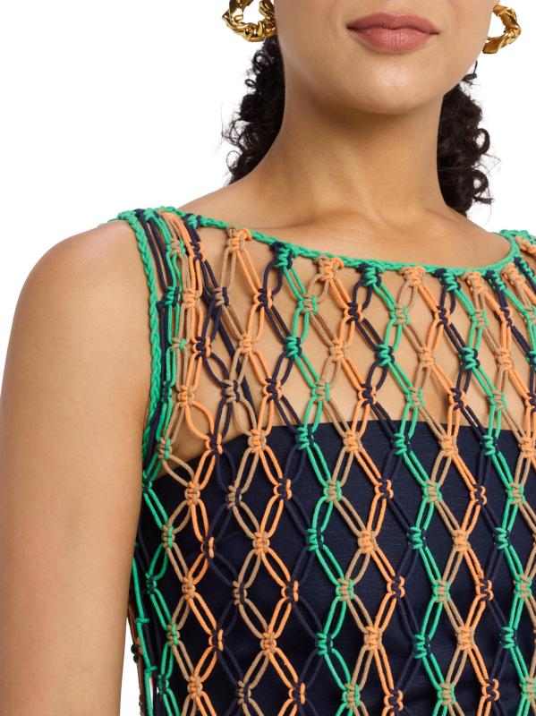 A bold statement piece, the Emelia dress by Significant Other is crafted of woven multi-color macramé finished with a flowing, fringe hem. This style includes a separate slip dress.Jewelneck Sleeveless Back zip closure Viscose/linen Lining: cotton Dry clean Imported