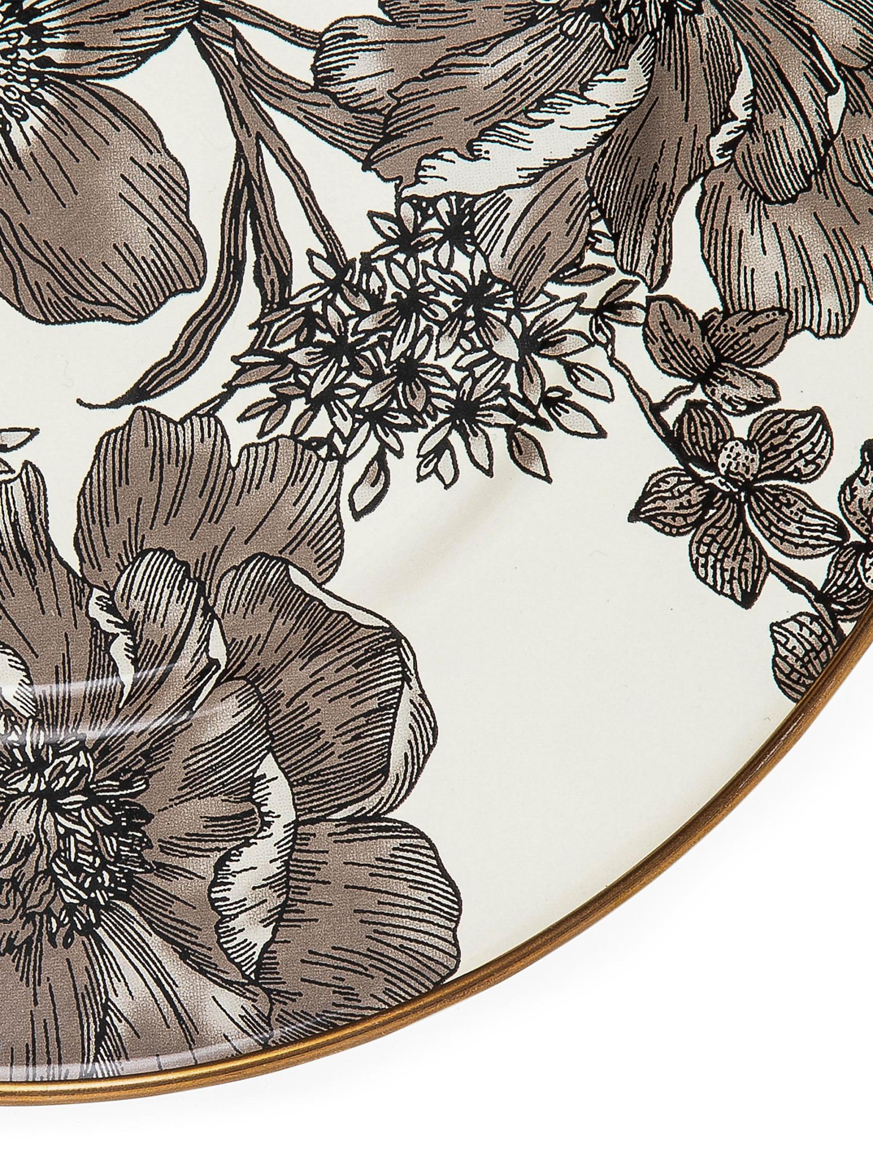 From the English Garden Collection. Serve favorite dishes in style with the floral enamel salad/dessert plate from MacKenzie-Childs. The heavy-gauge steel underbody, meticulously glazed with hand-applied transfers and rimmed in bronzed stainless steel, adds a touch of elegance to every dining experience.