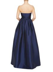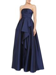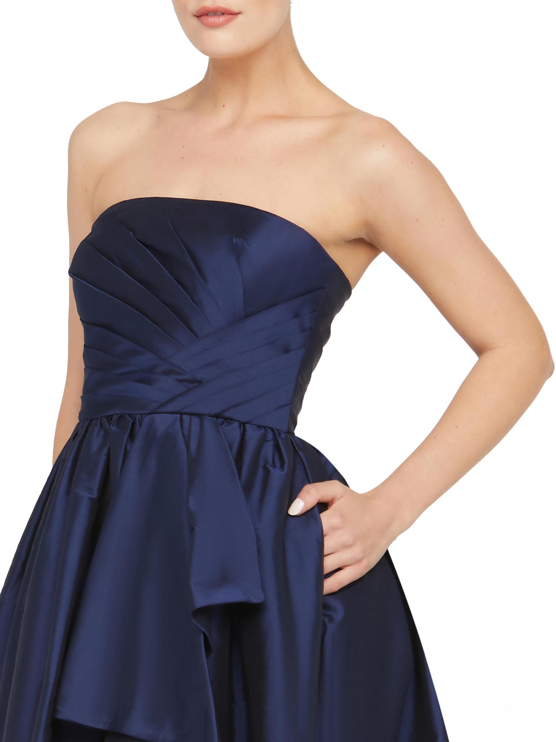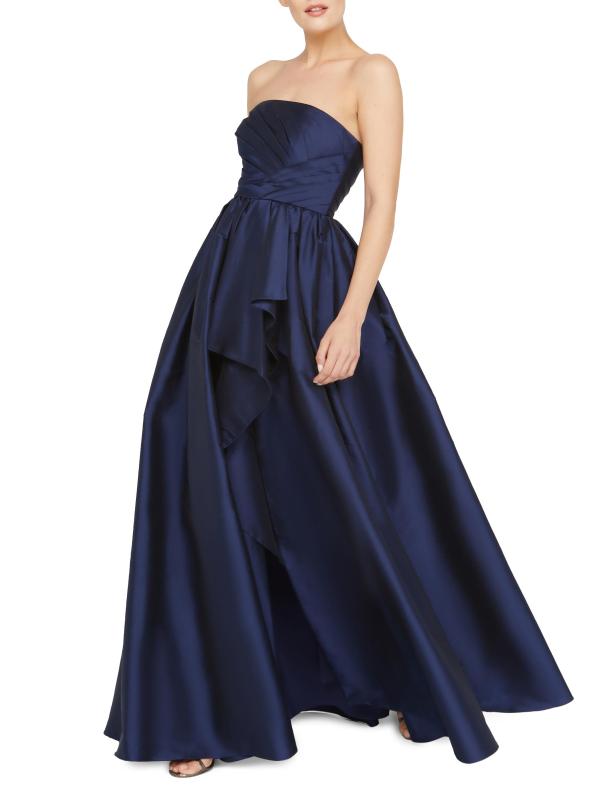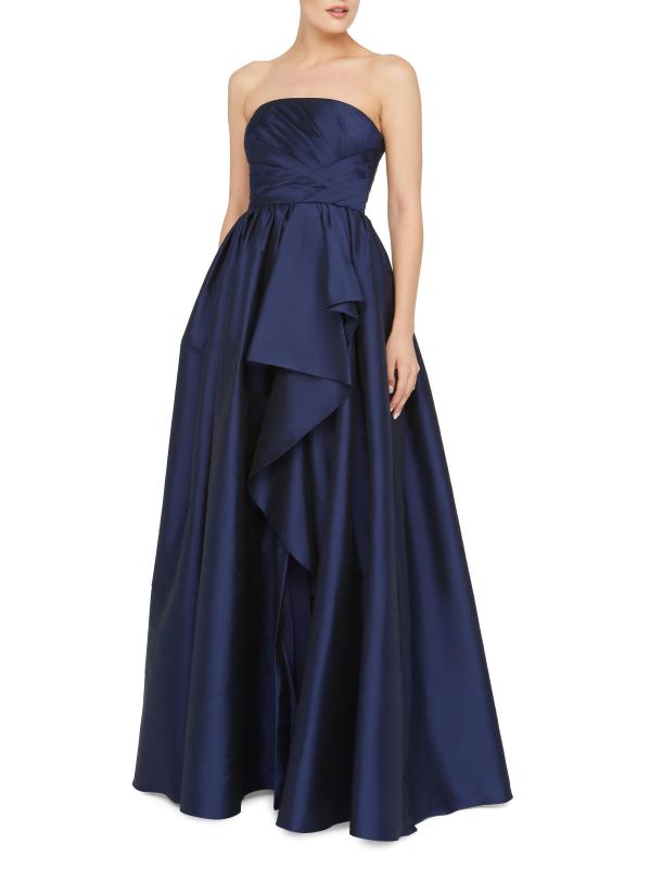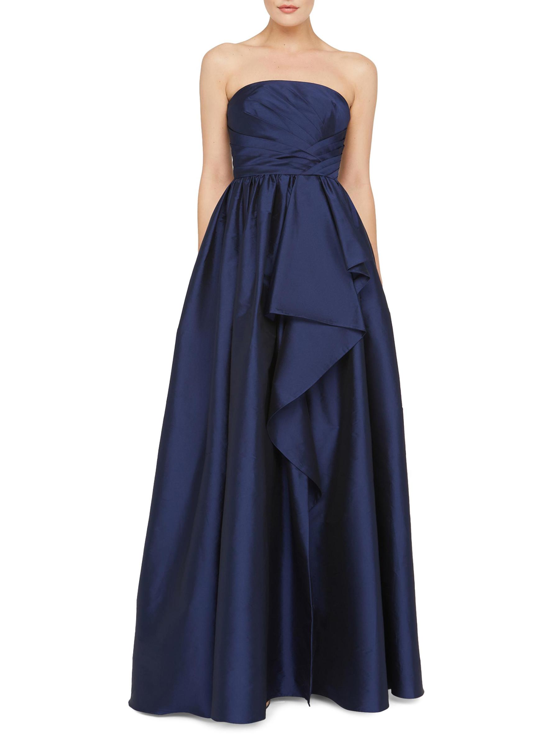 Theia's taffeta Esmerina gown features an asymmetric ruffle bodice detail, a fitted waist, and a voluminous, floor-length, gathered skirt.