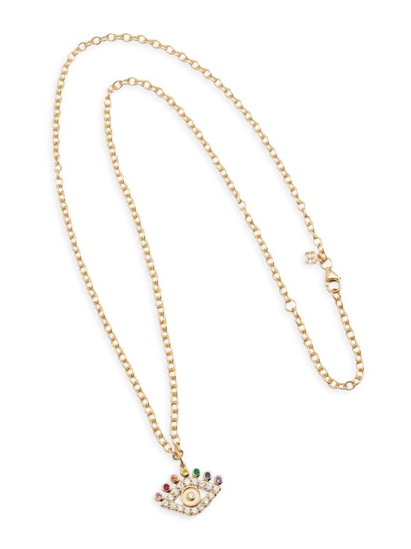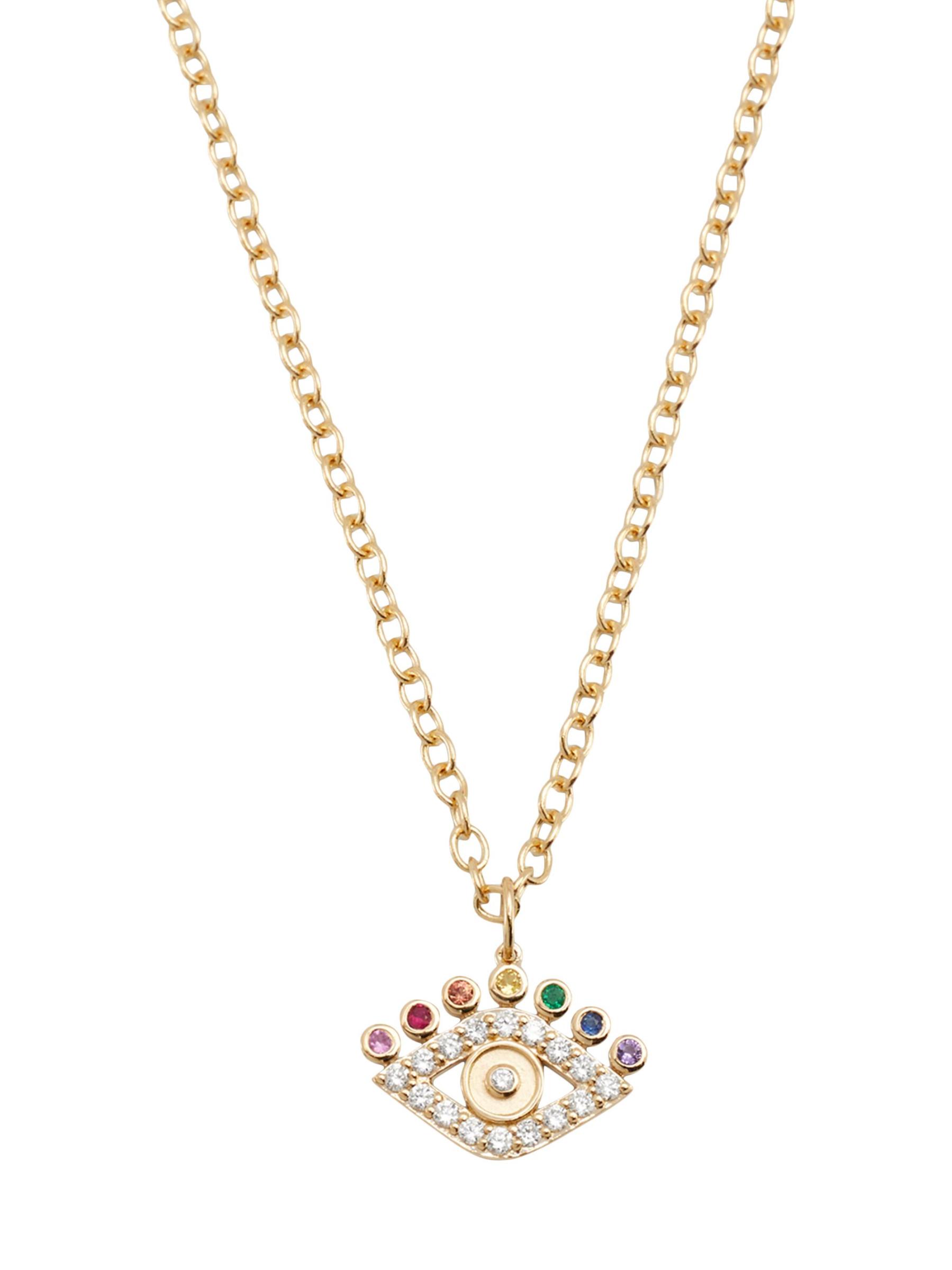 Sydney Evan’s Evil Eye pendant necklace features 14K yellow gold cable chain with a glittering charm set with diamonds, an emerald, an amethyst, a ruby, and rainbow sapphires.