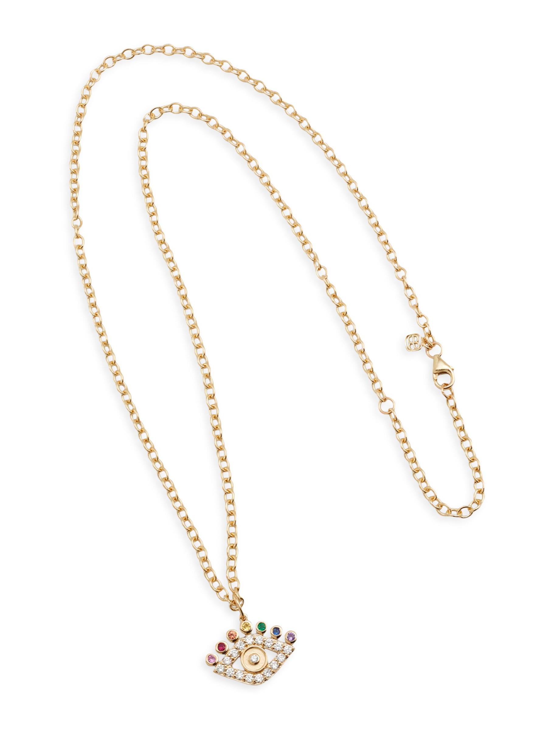 Sydney Evan’s Evil Eye pendant necklace features 14K yellow gold cable chain with a glittering charm set with diamonds, an emerald, an amethyst, a ruby, and rainbow sapphires.Diamonds, X tcw Amethyst Ruby Emerald PINK SAPPHIRE Orange sapphire Yellow sapphire 14K yellow gold Lobster clasp Imported