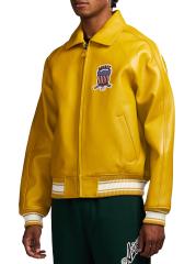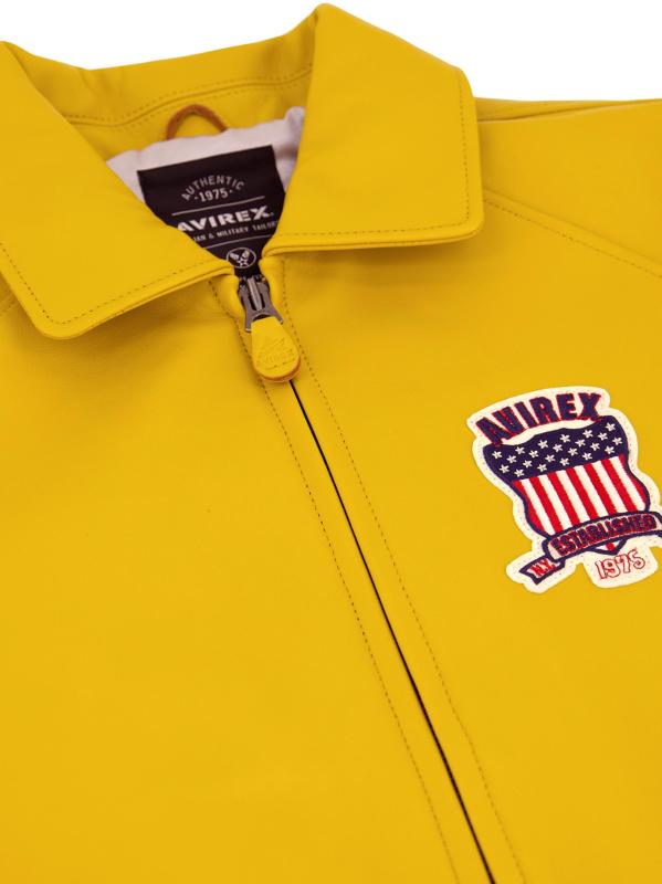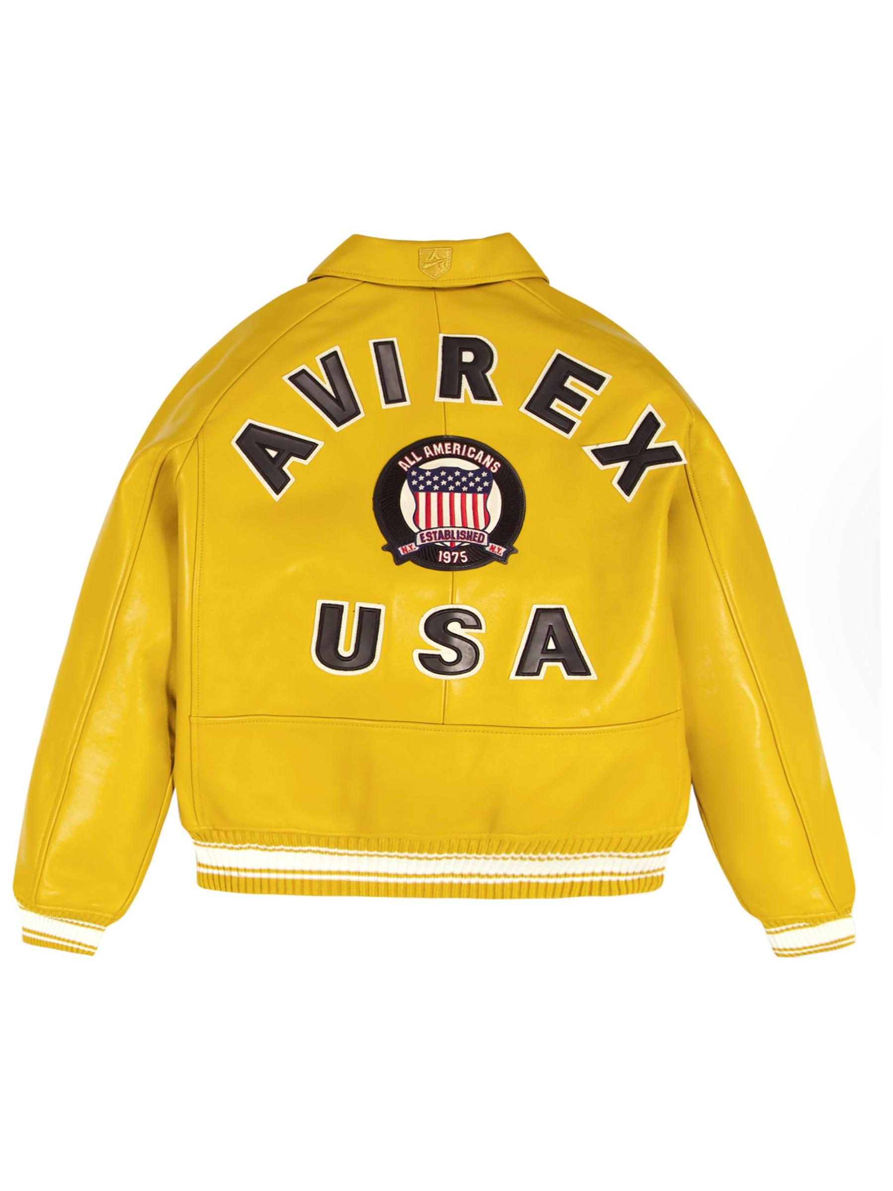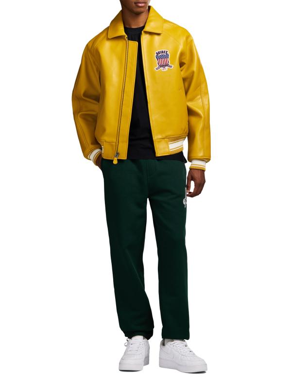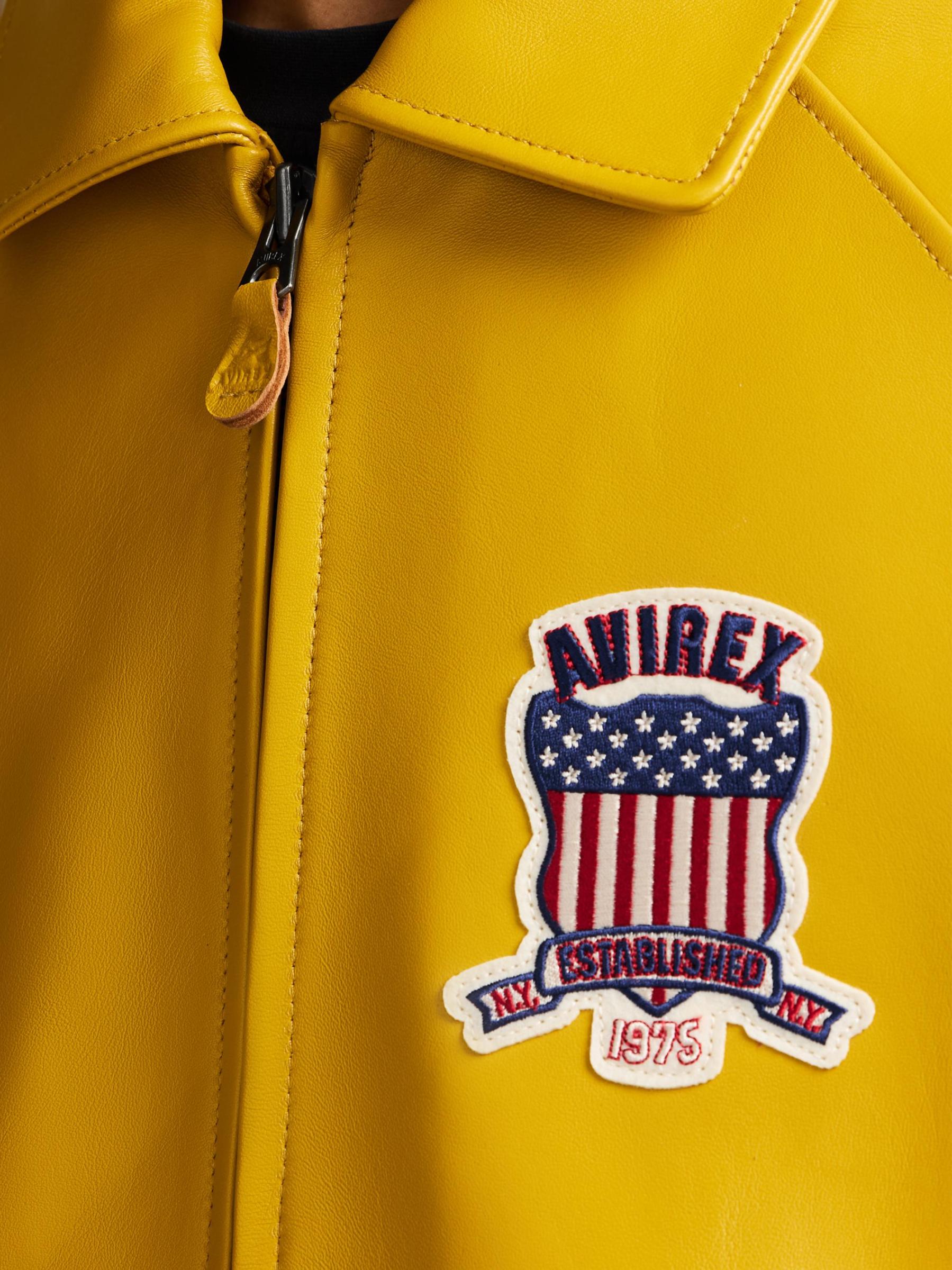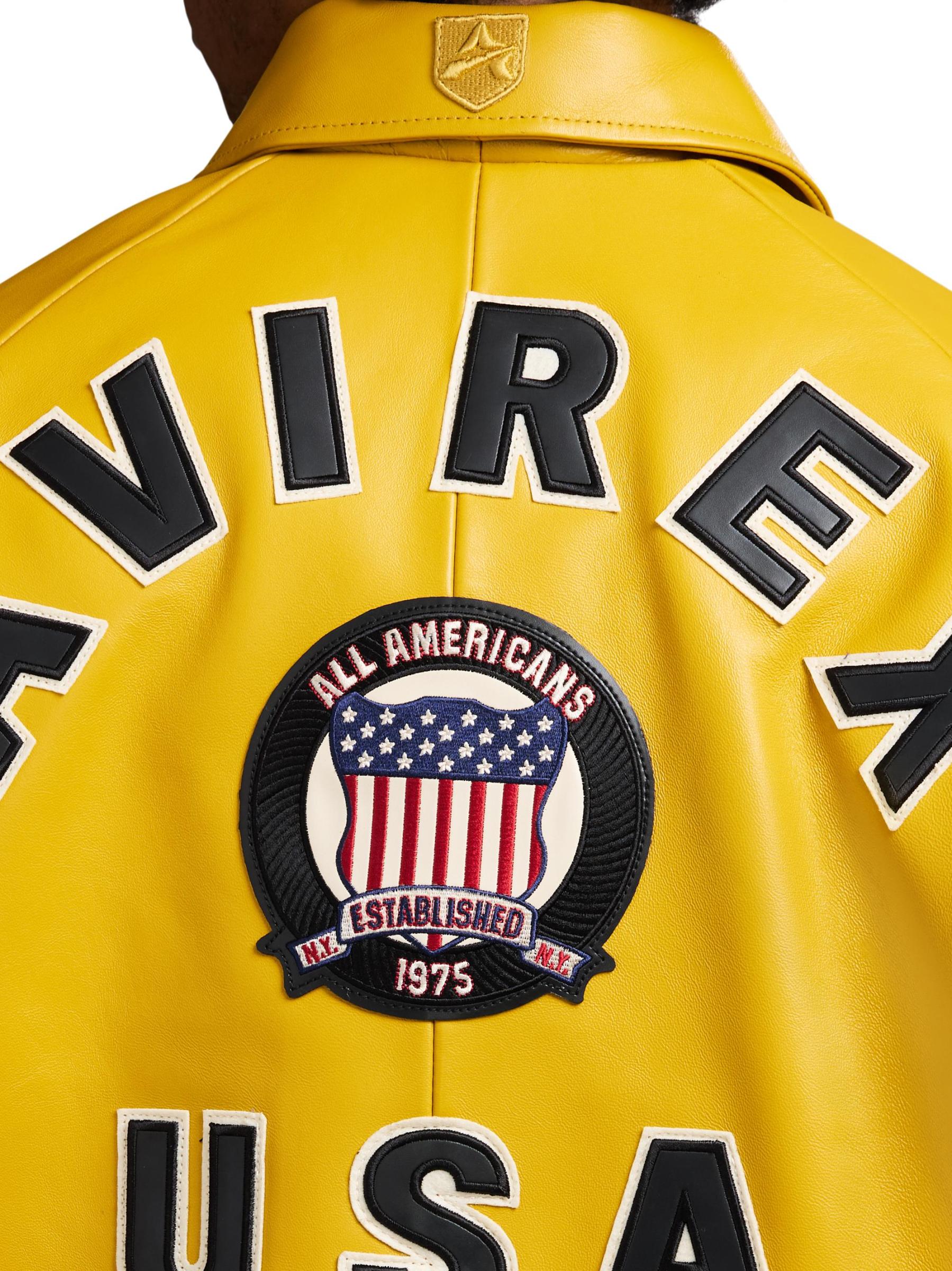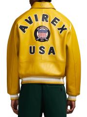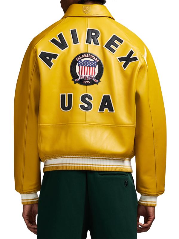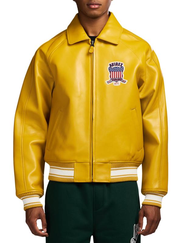 More than 40 years in the making, this Avirex military bomber jacket is crafted of smooth leather with striped rib-knit trim at the cuffs and hem. Signature logo patches detail the chest and reverse.