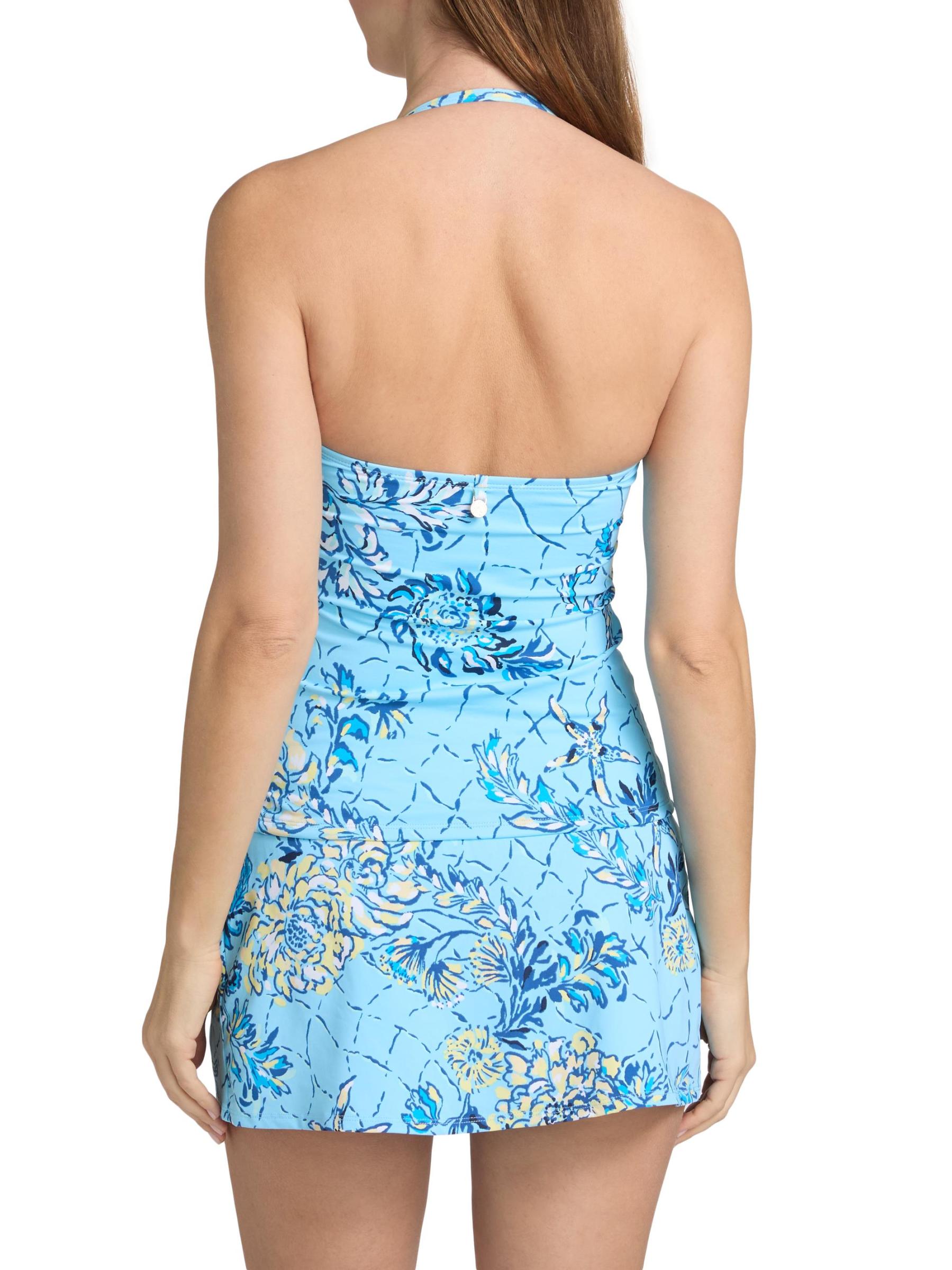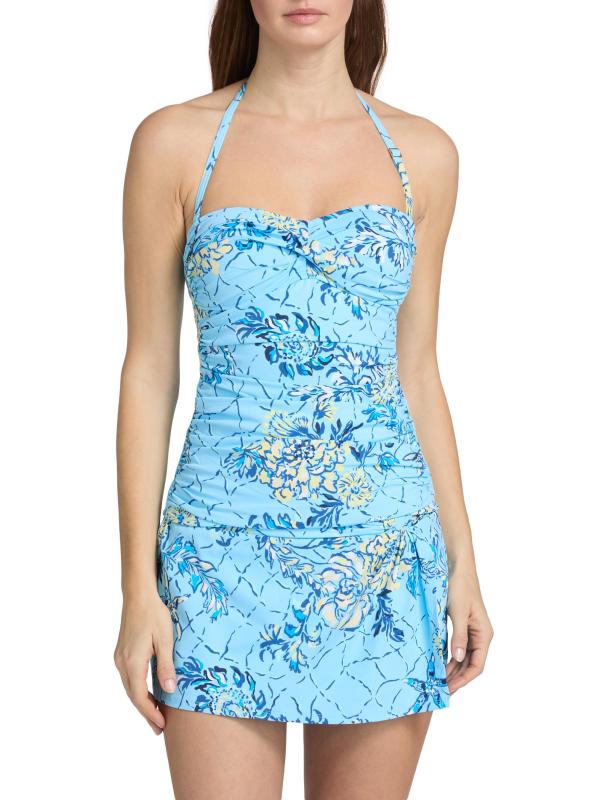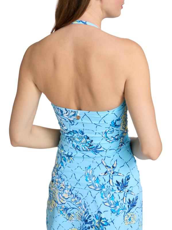The Flamenco tankini top from Lilly Pulitzer features a Bellevue Breakers Beach Print with a twisted front and a removable halter strap