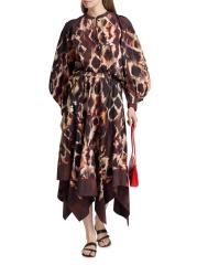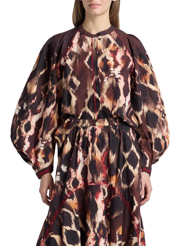 This Fleetwood Andre button-front blouse from Maria Cher, crafted of cotton poplin, is designed with a vibrant abstract print, a band collar, and long balloon sleeves. Colorful topstitching details finish the look.