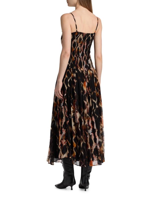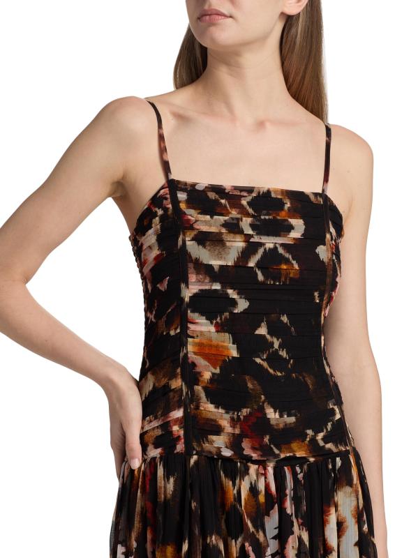 This Fleetwood Jackie midi-dress from Maria Cher is crafted of printed crinkle chiffon with gathered detailing at the bodice. Designed with adjustable thin straps and a smocked back for comfort, the piece is cut in an A-line silhouette.Square neck Adjustable shoulder straps Side zip closure 100% Viscose Lining: 100% Viscose Hand wash Imported