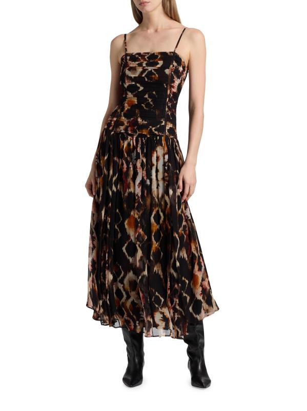 This Fleetwood Jackie midi-dress from Maria Cher is crafted of printed crinkle chiffon with gathered detailing at the bodice. Designed with adjustable thin straps and a smocked back for comfort, the piece is cut in an A-line silhouette.