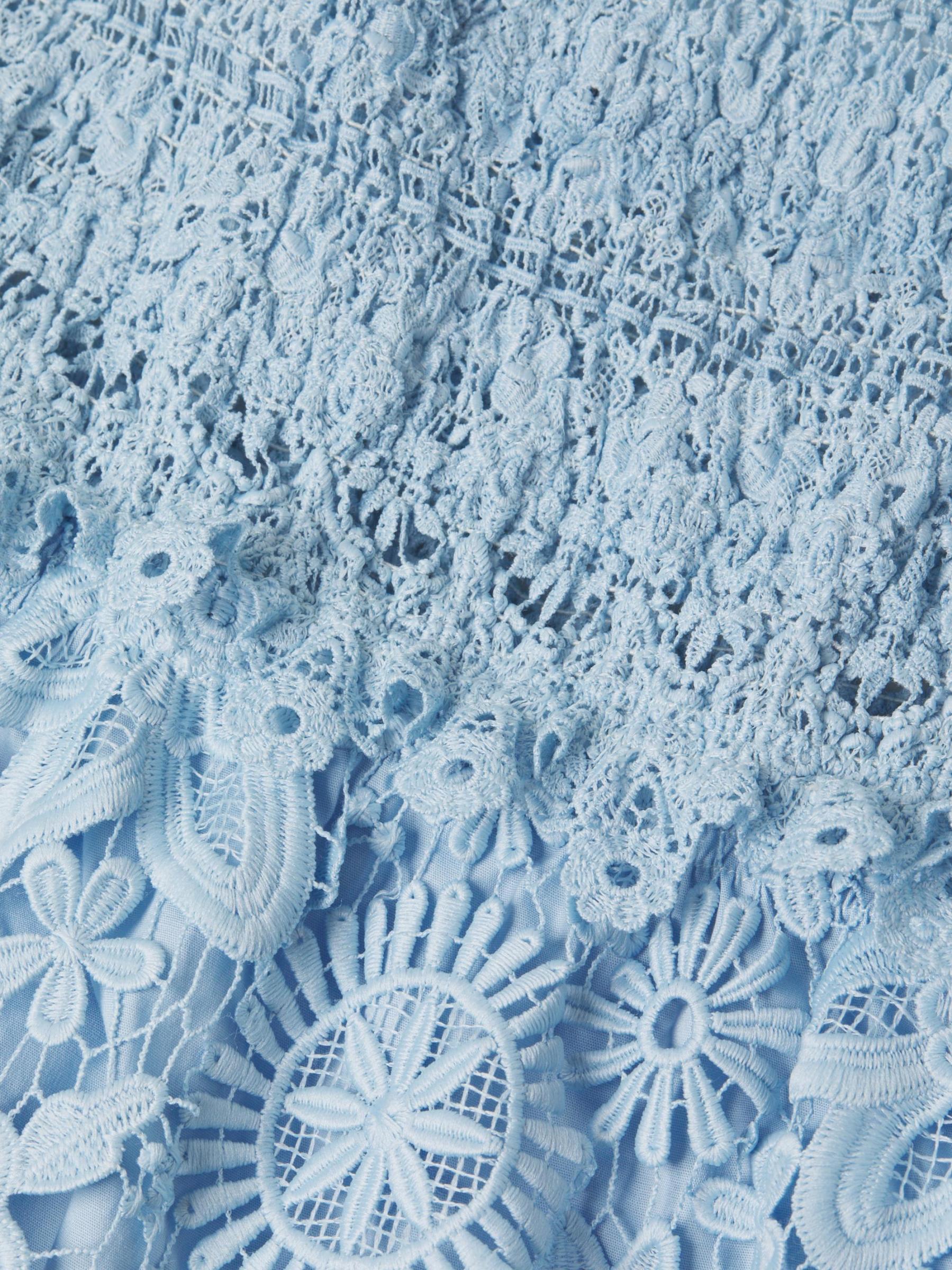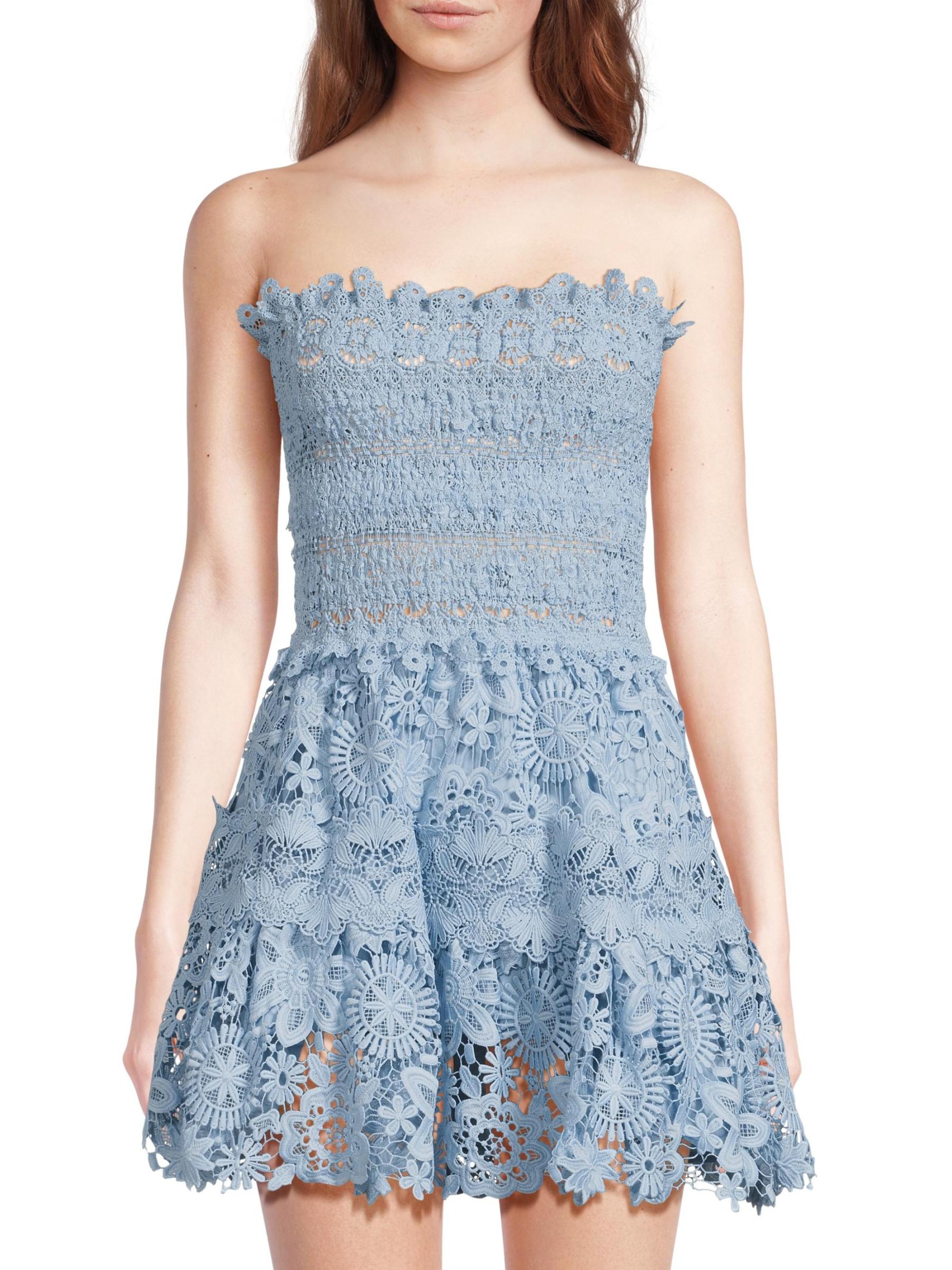 From the Flor Del Viento Collection. This Opal strapless lace minidress from Waimari is designed with a fit-and-flare silhouette, bandeau neck, and tiered skirt.Bandeau neck Strapless Pulls over 100% polyester Lining: 100% Cotton Trim: 100% Polyester Hand wash Imported