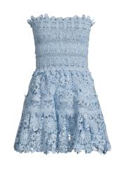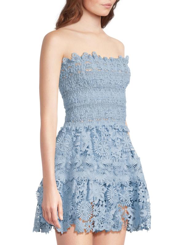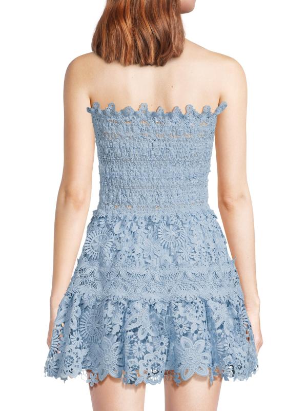 From the Flor Del Viento Collection. This Opal strapless lace minidress from Waimari is designed with a fit-and-flare silhouette, bandeau neck, and tiered skirt.