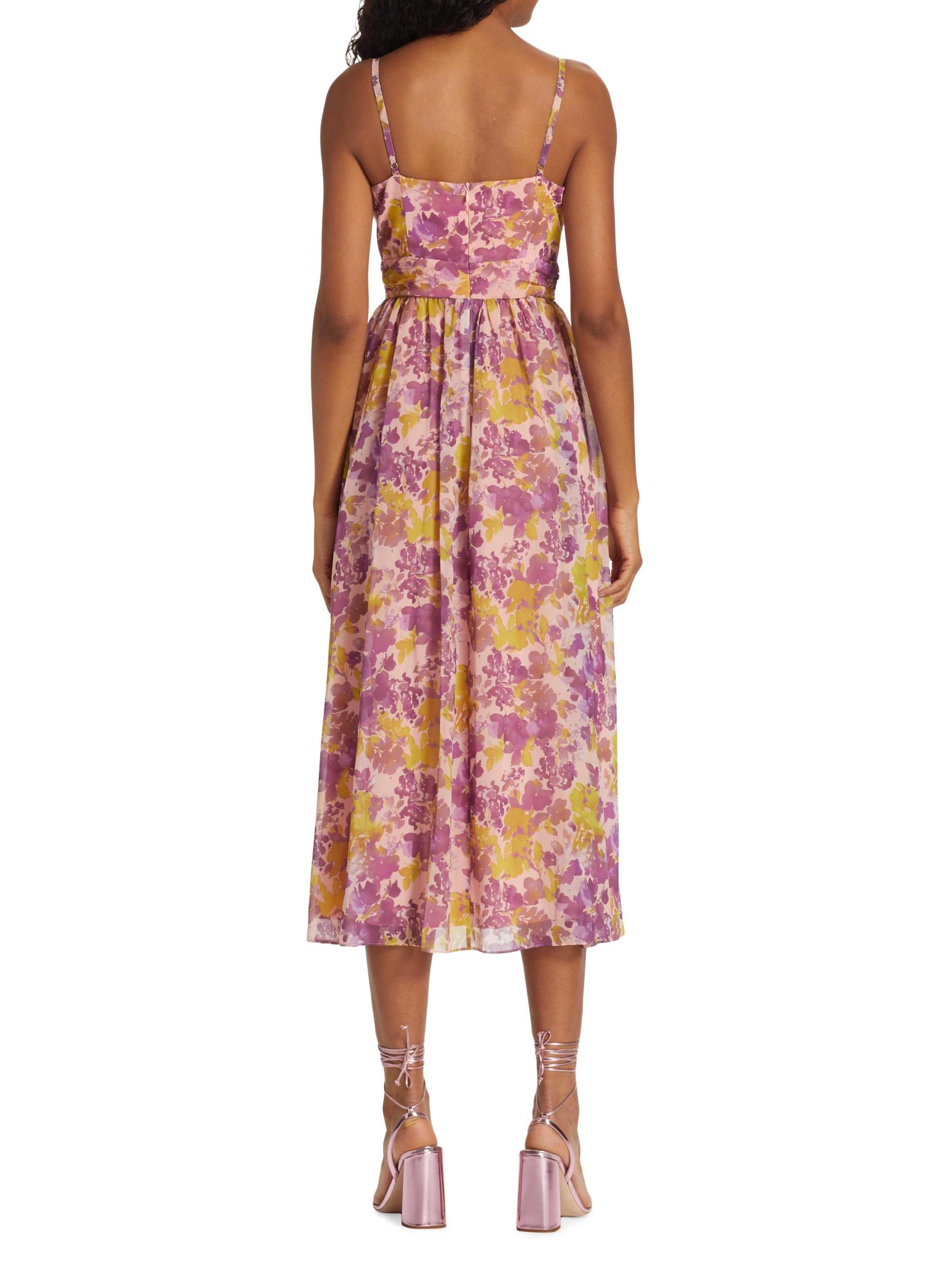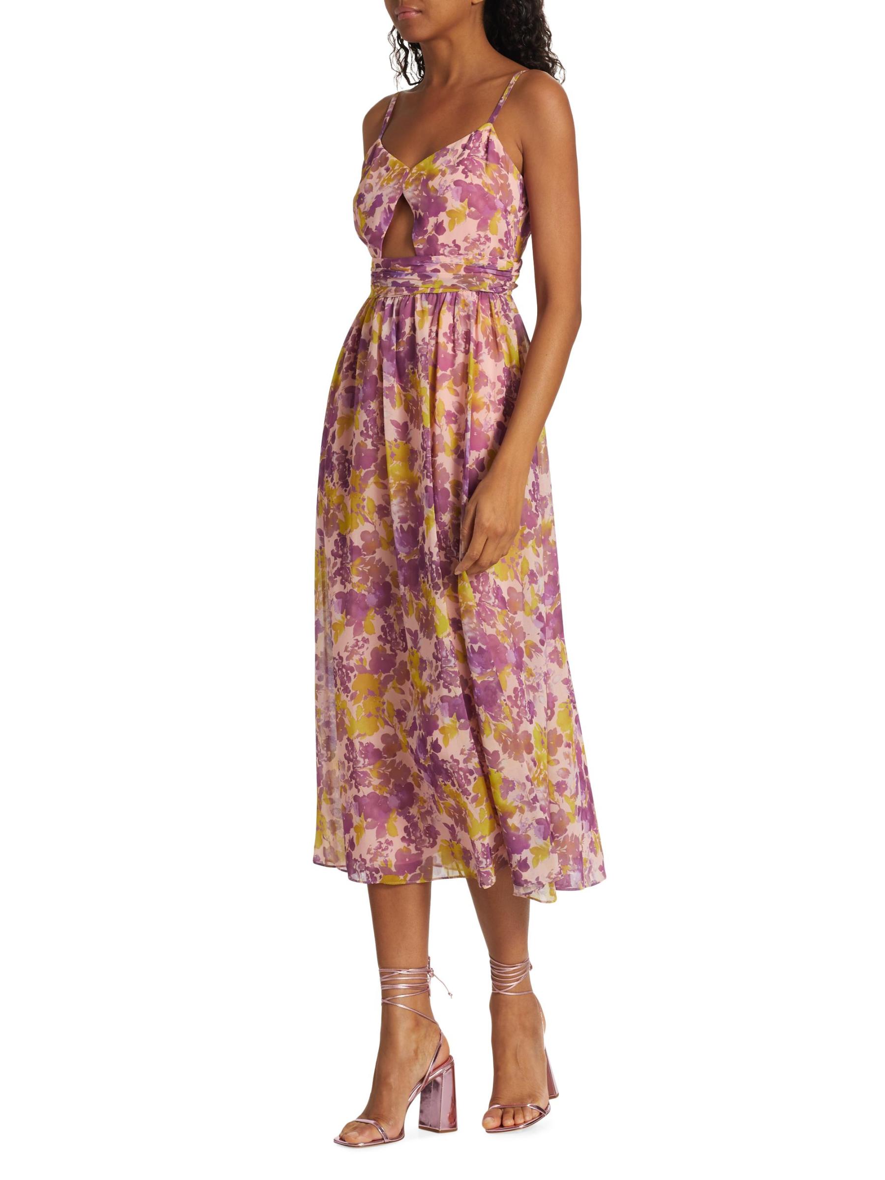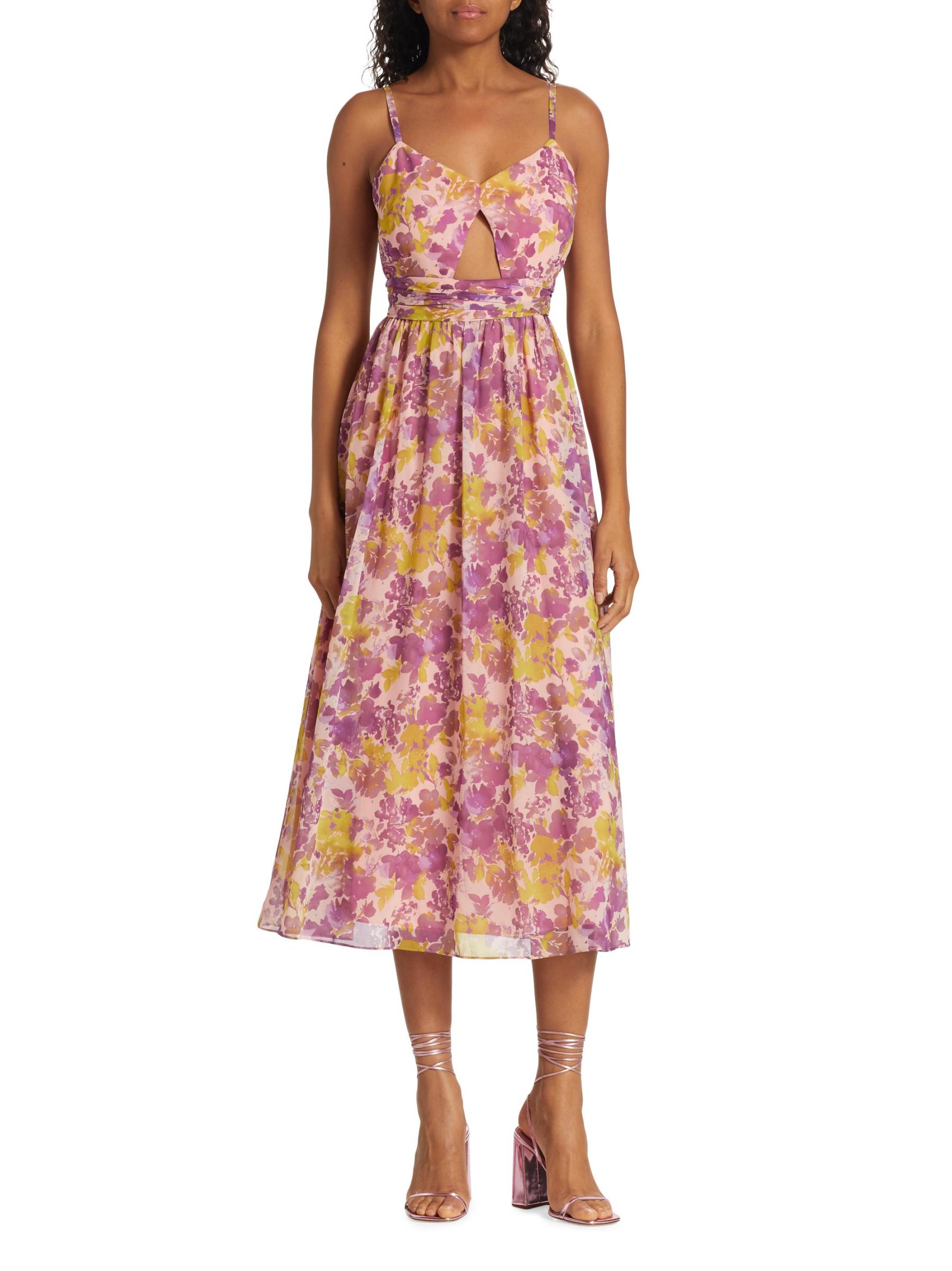 LDT's sleeveless floral midi-dress is elevated by a sleek chest cut-out and a wide pleated banded waist.