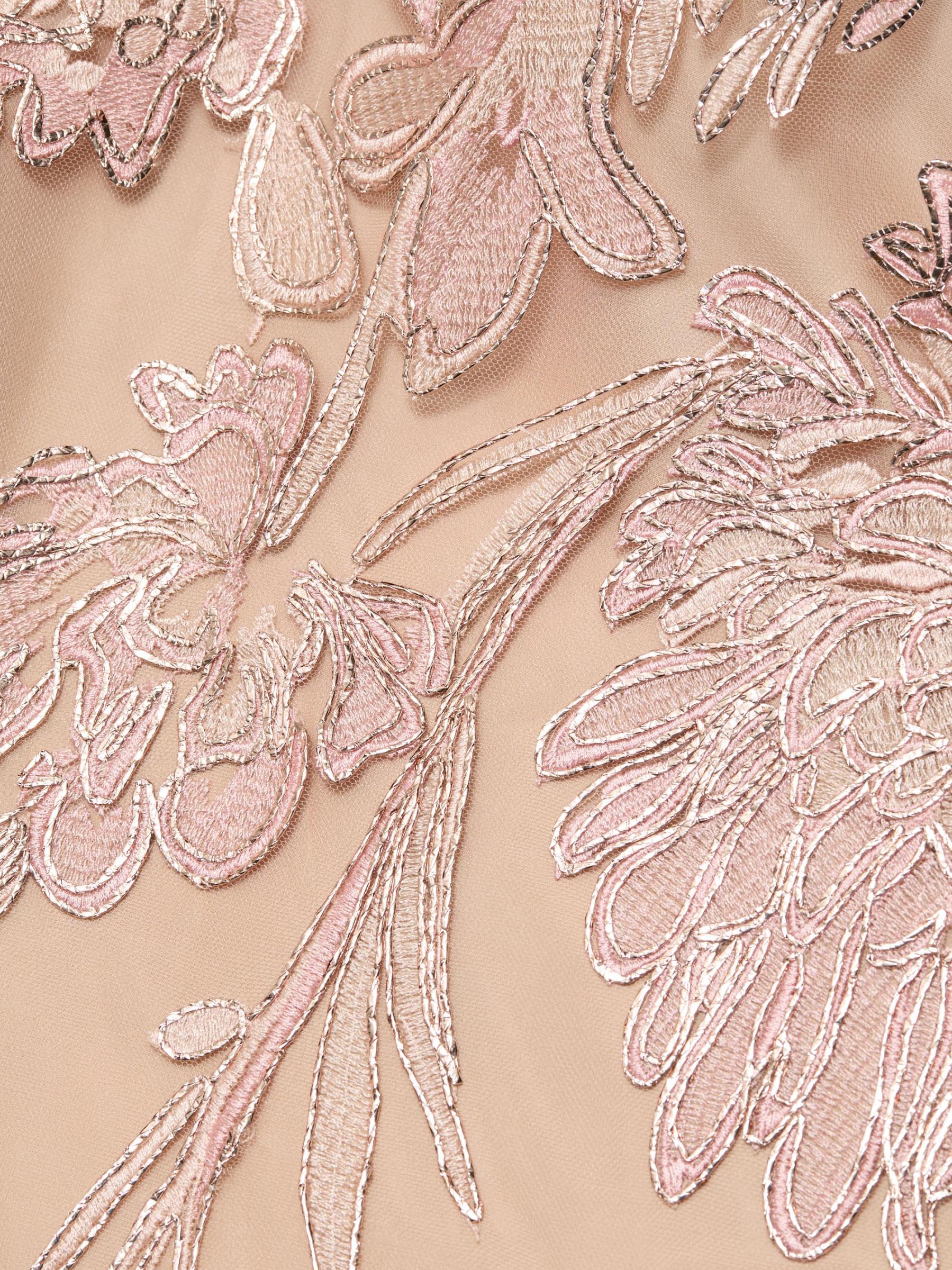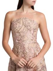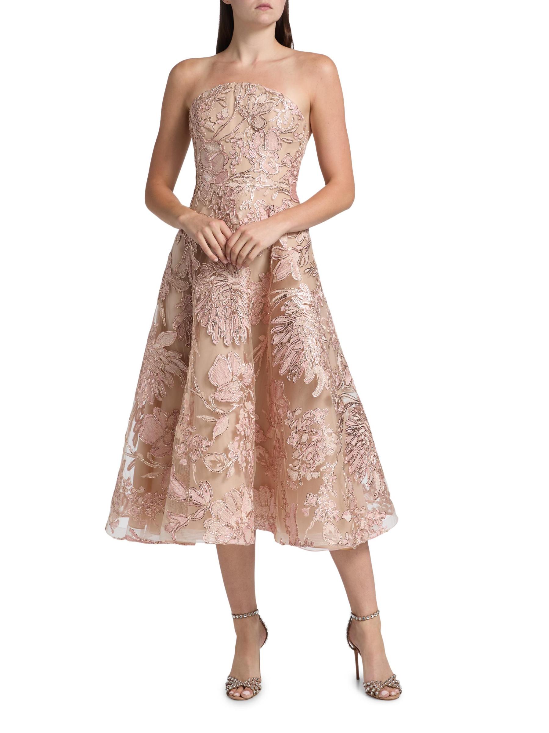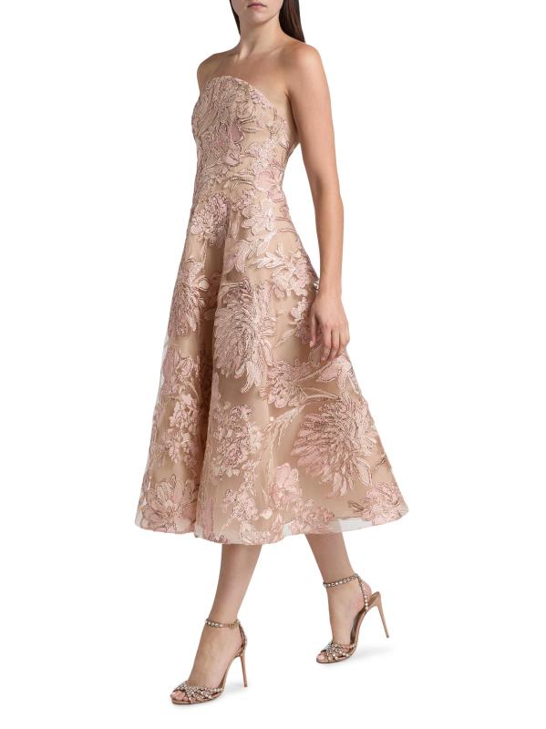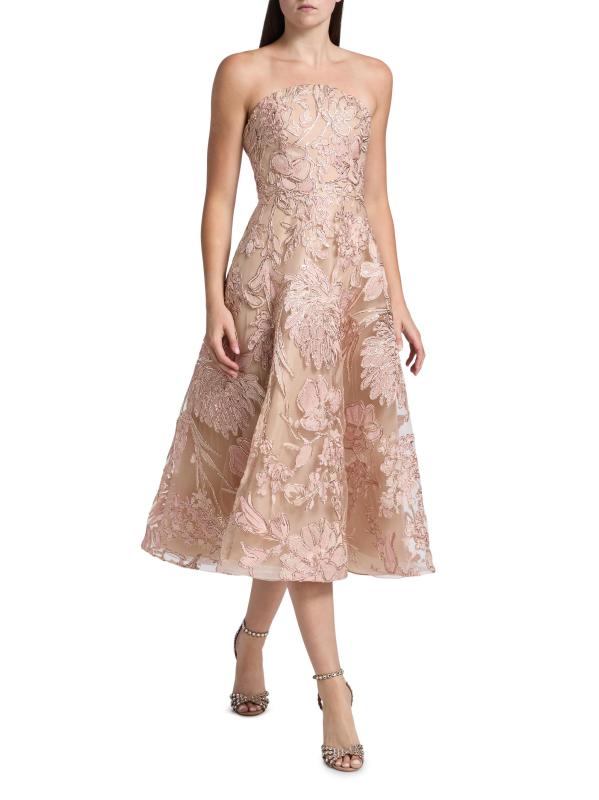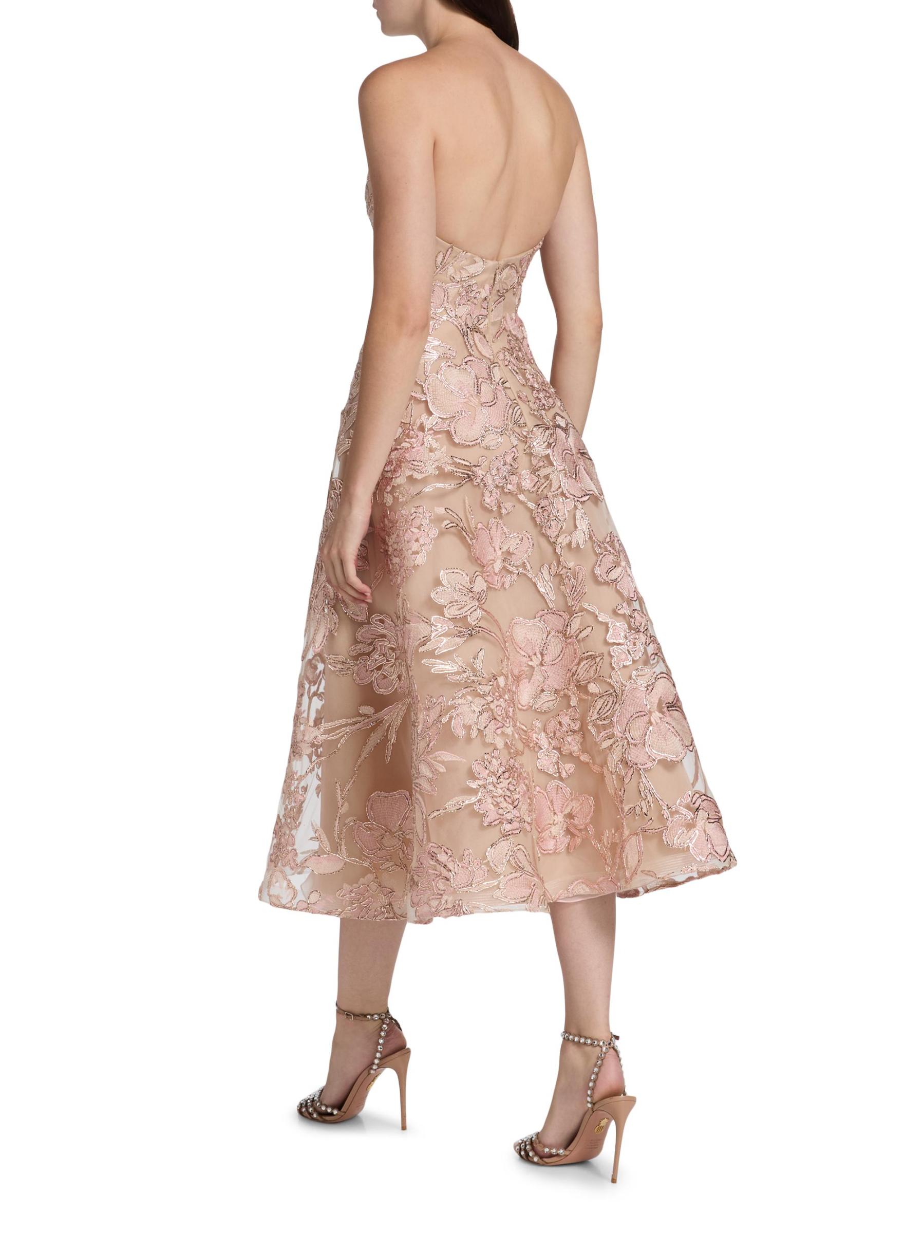 This strapless cocktail dress from Naeem Khan flaunts delicate floral embroidery and a curved neckline.