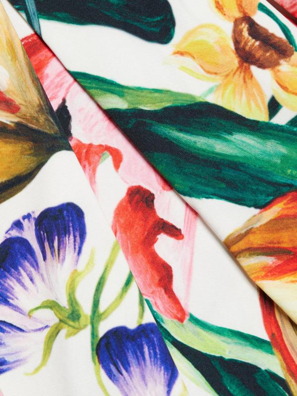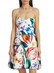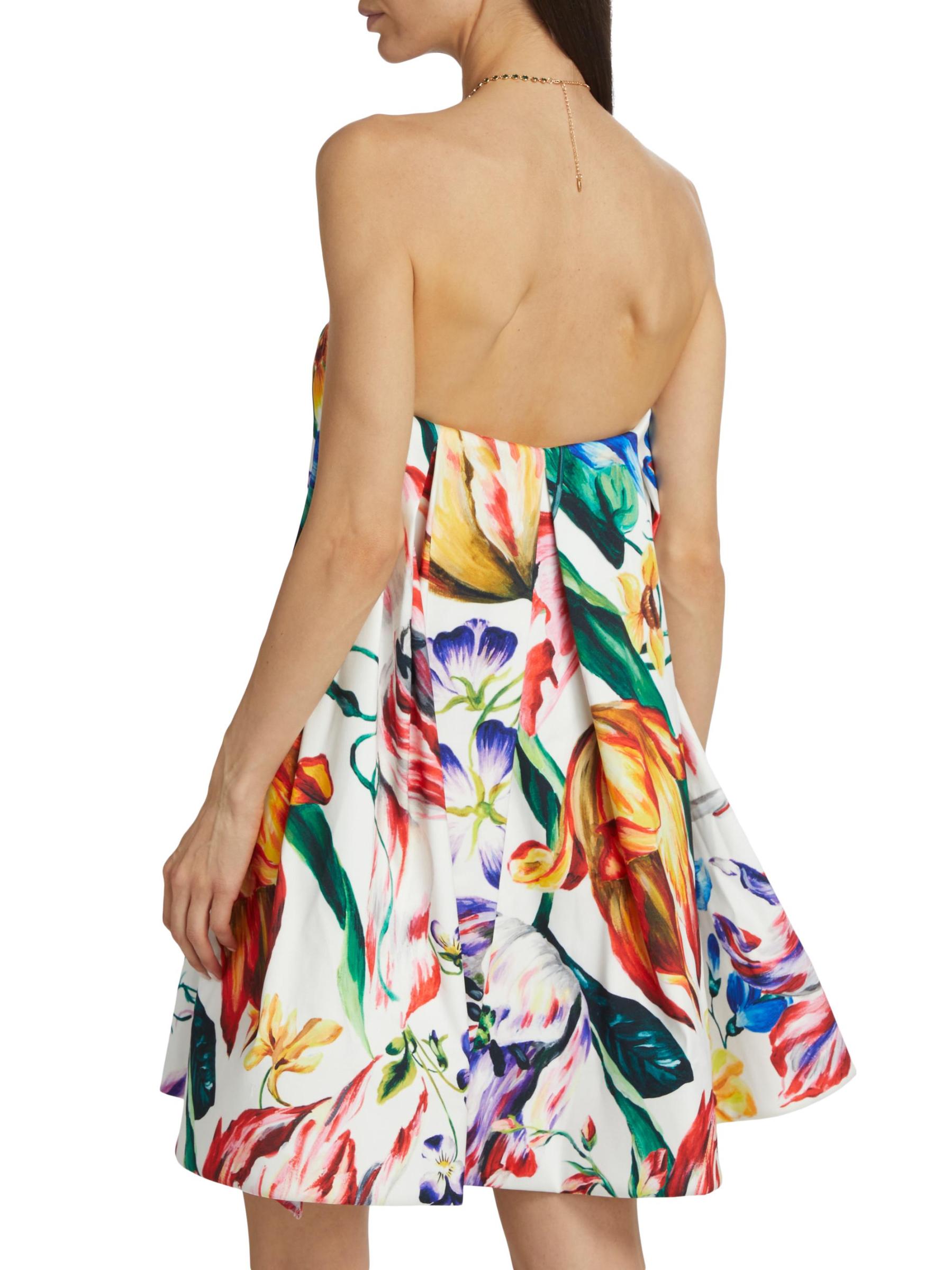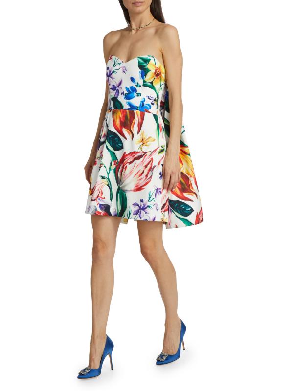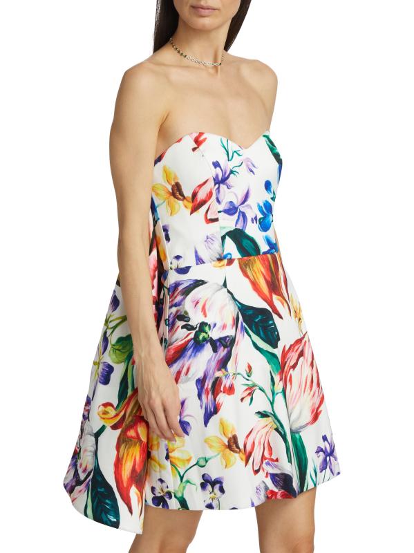 The Marchesa Notte dress showcases a captivating display of floral print on mikado fabric, featuring a mini silhouette with a sweetheart neckline and sleeveless design, complemented by an elegant cape.Sweetheart neck Strapless Back zip closure 100% polyester Dry clean only Imported