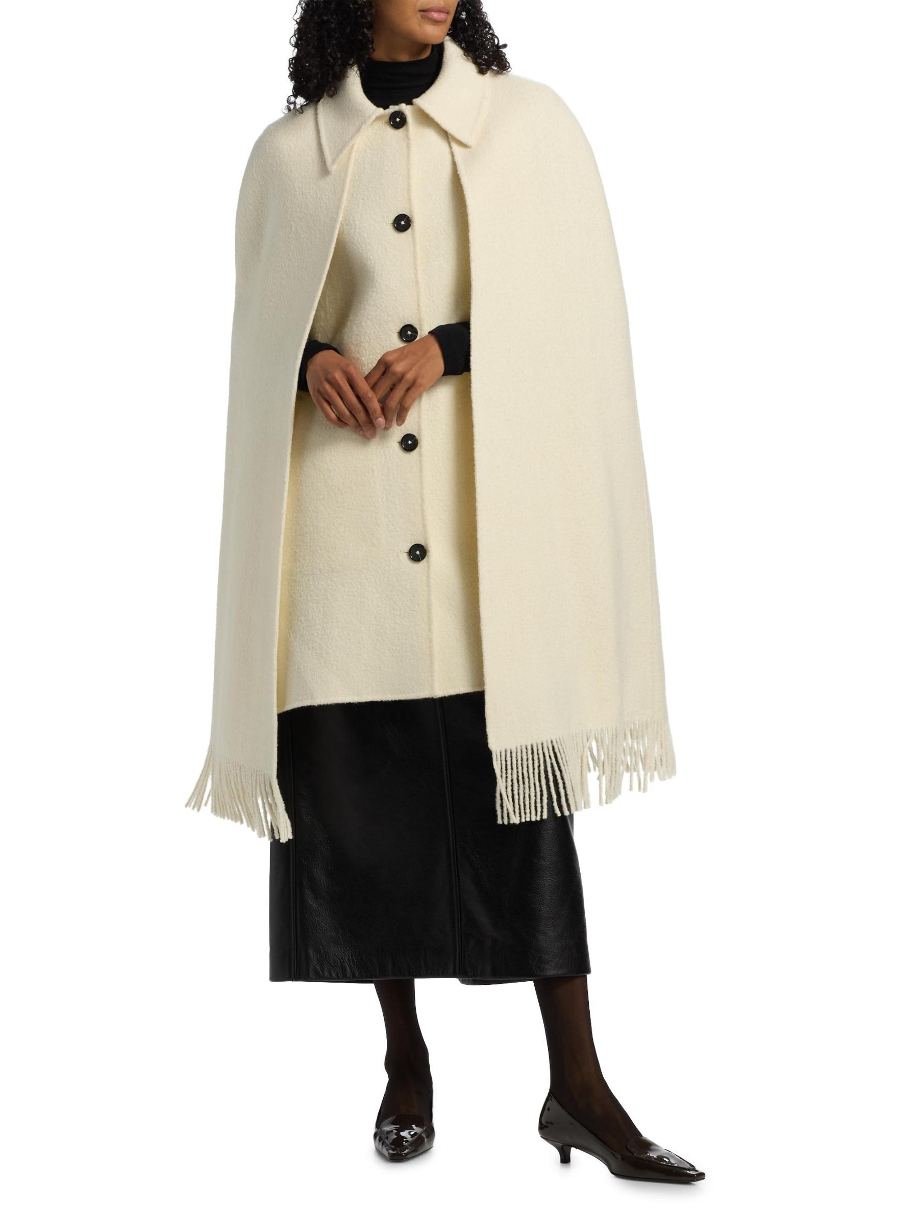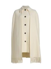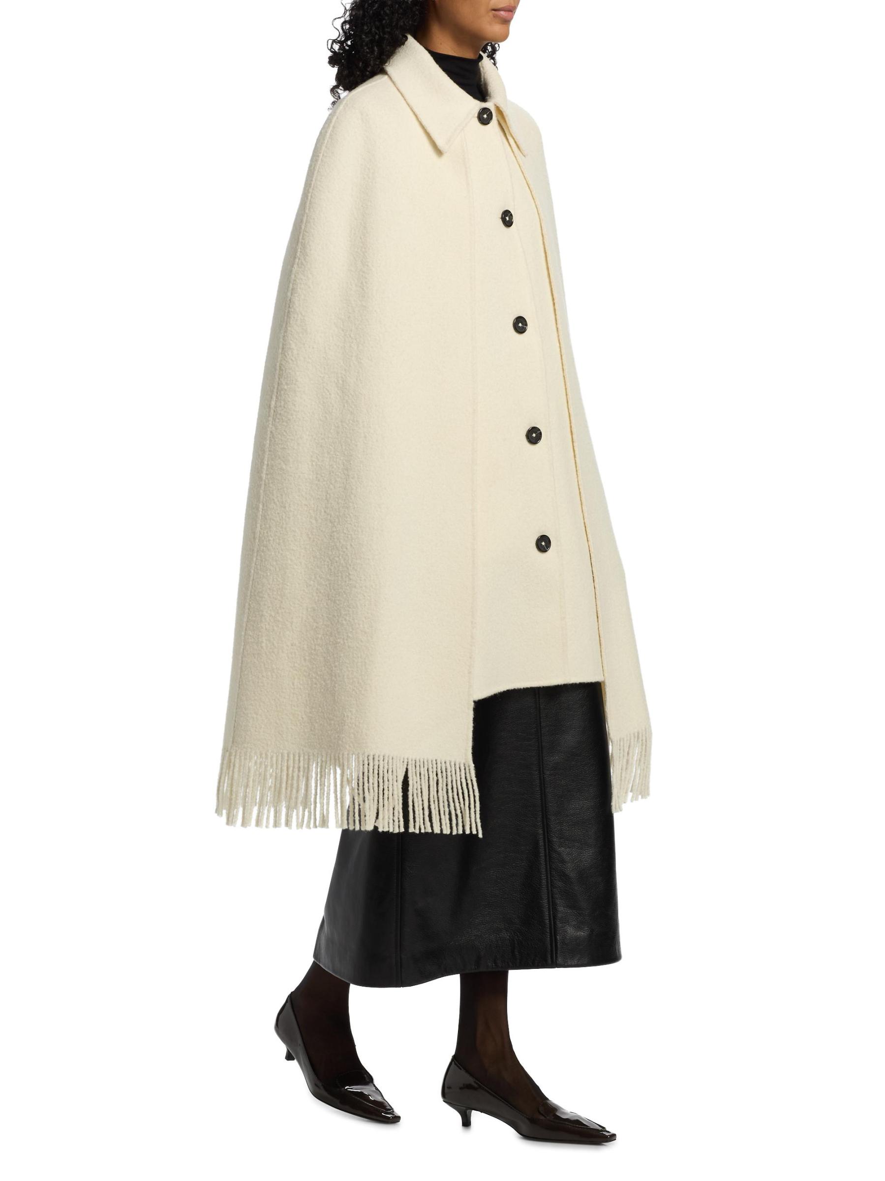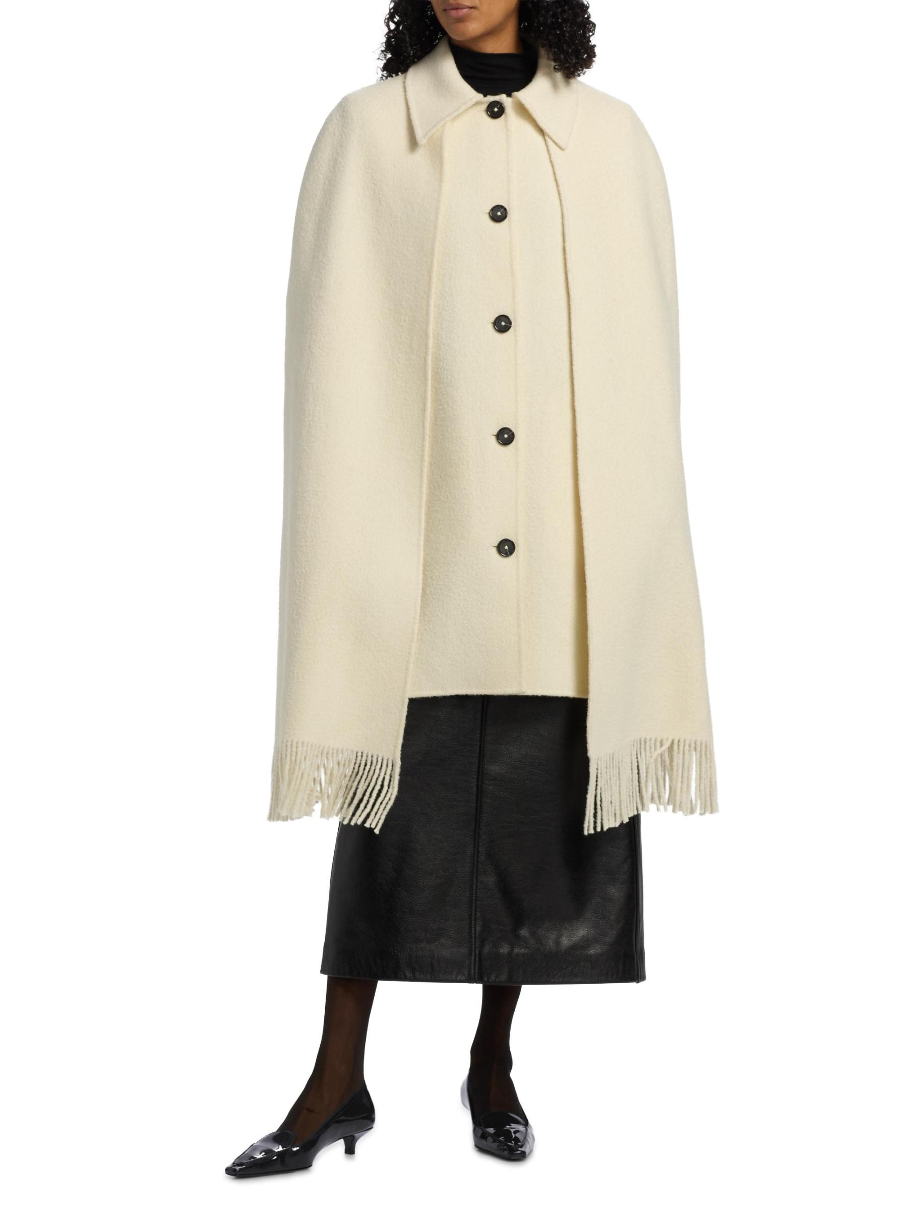 Crafted of textured bouclé wool, this cape coat from Toteme features a warm layered design, spread collar, and button-front closure. The piece is finished with fringe trim