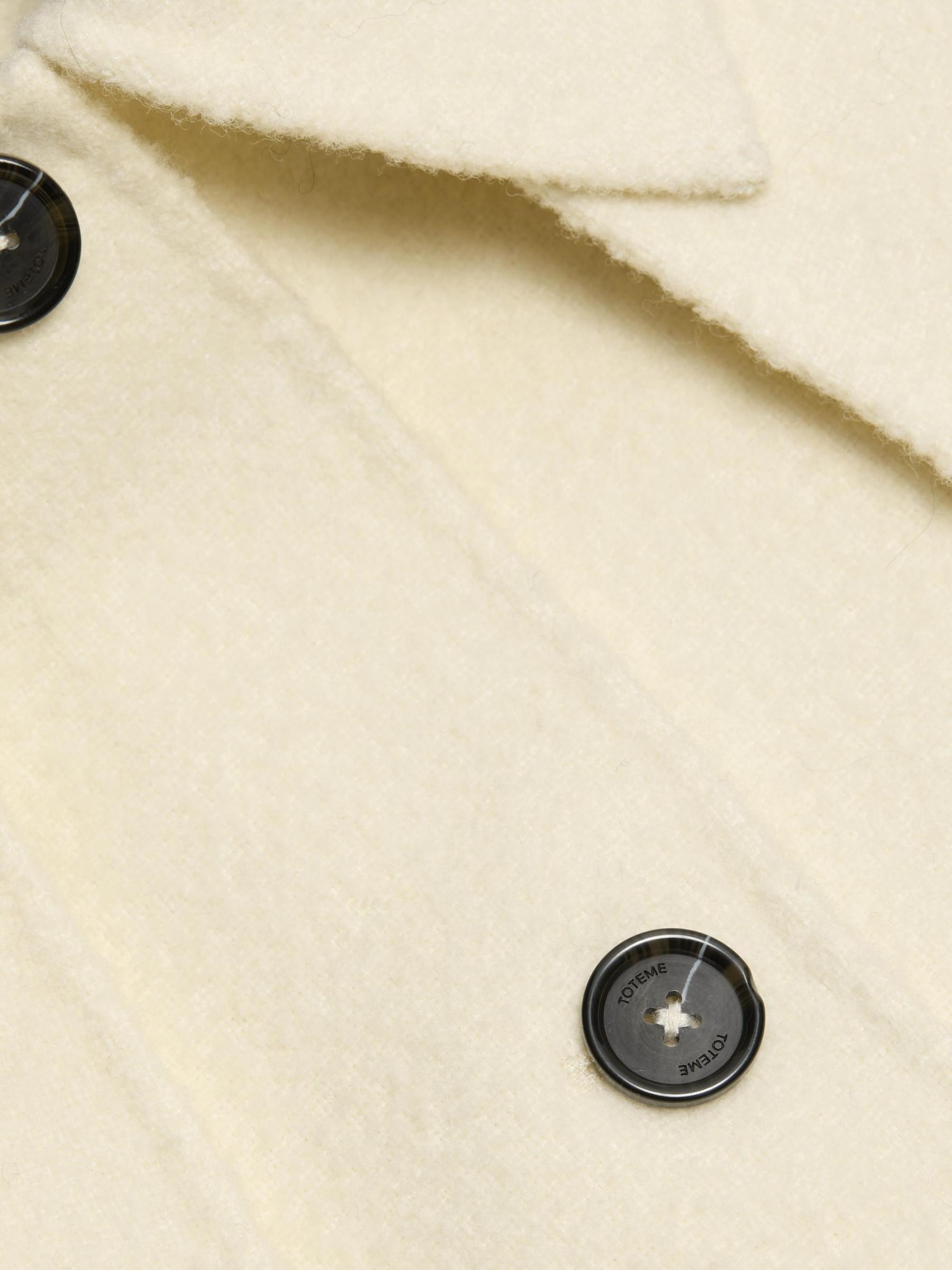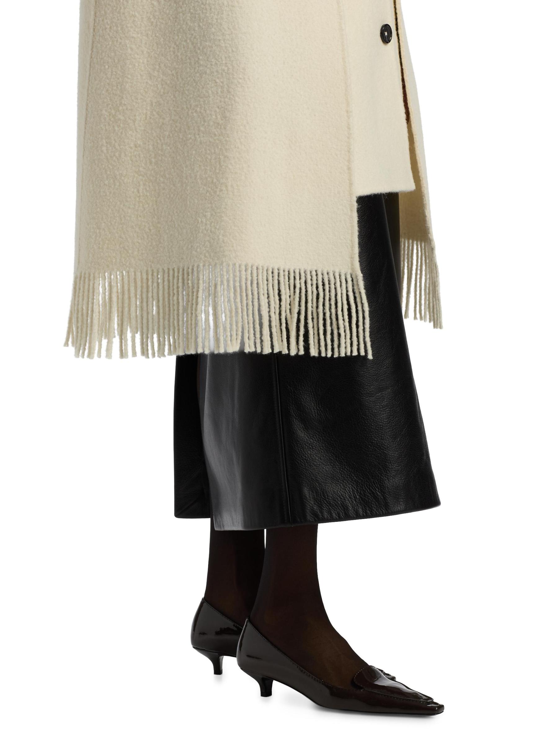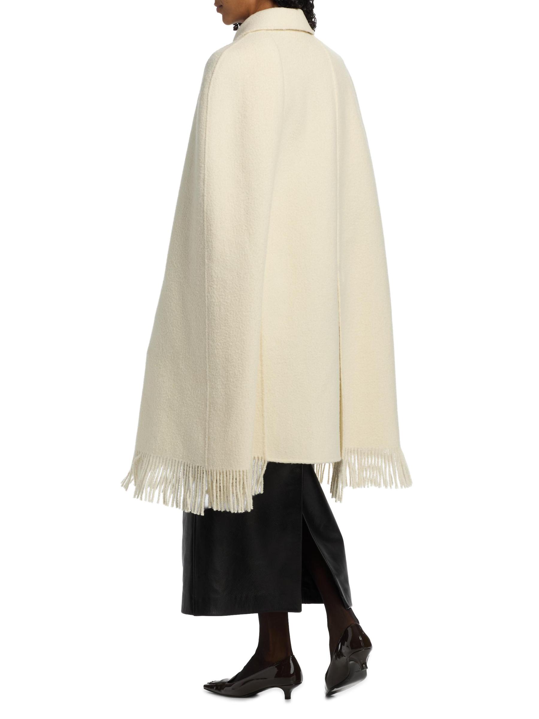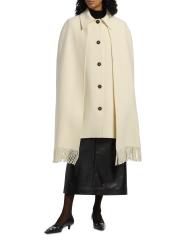 Crafted of textured bouclé wool, this cape coat from Toteme features a warm layered design, spread collar, and button-front closure. The piece is finished with fringe trim
