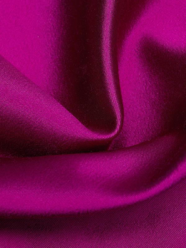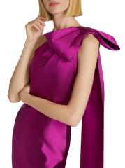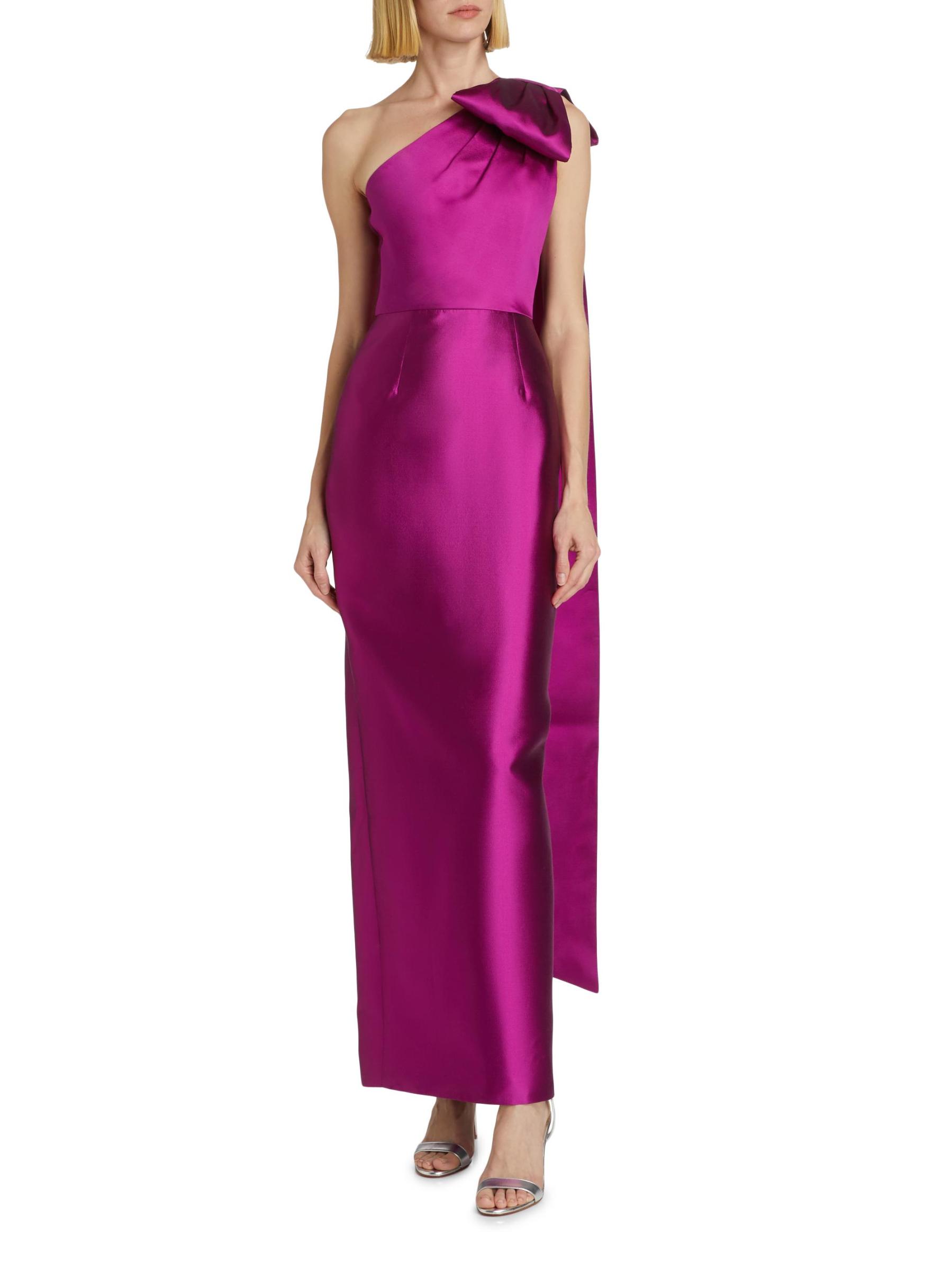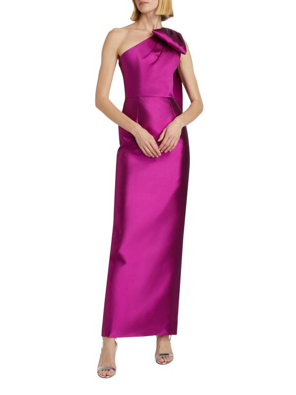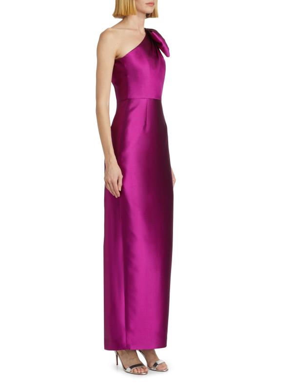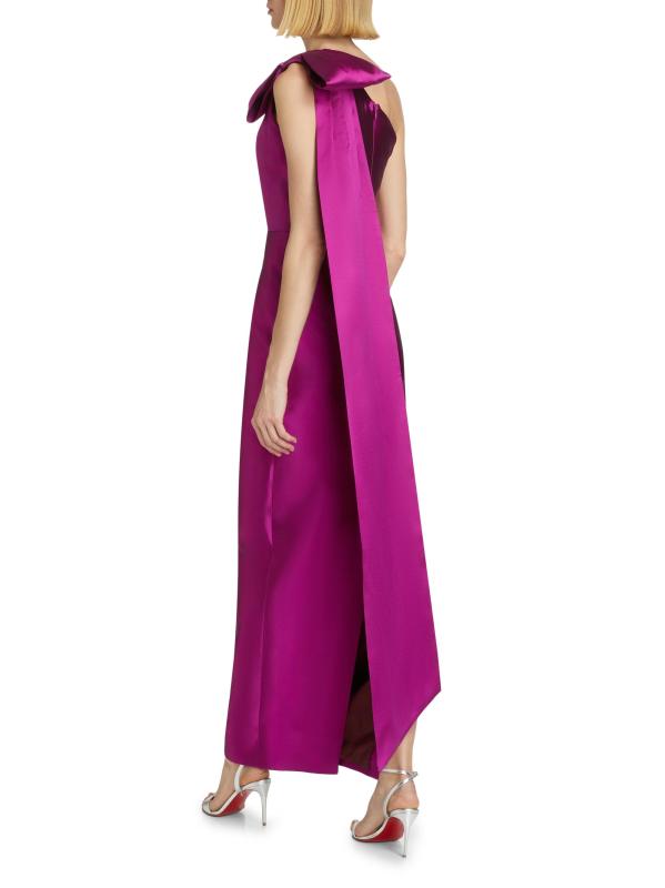 Column gown with a fitted bodice with boning for support, pleated one-shoulder neckline, bow shoulder detail with floor-length sash, and a fitted full-length column skirt with back slit.
