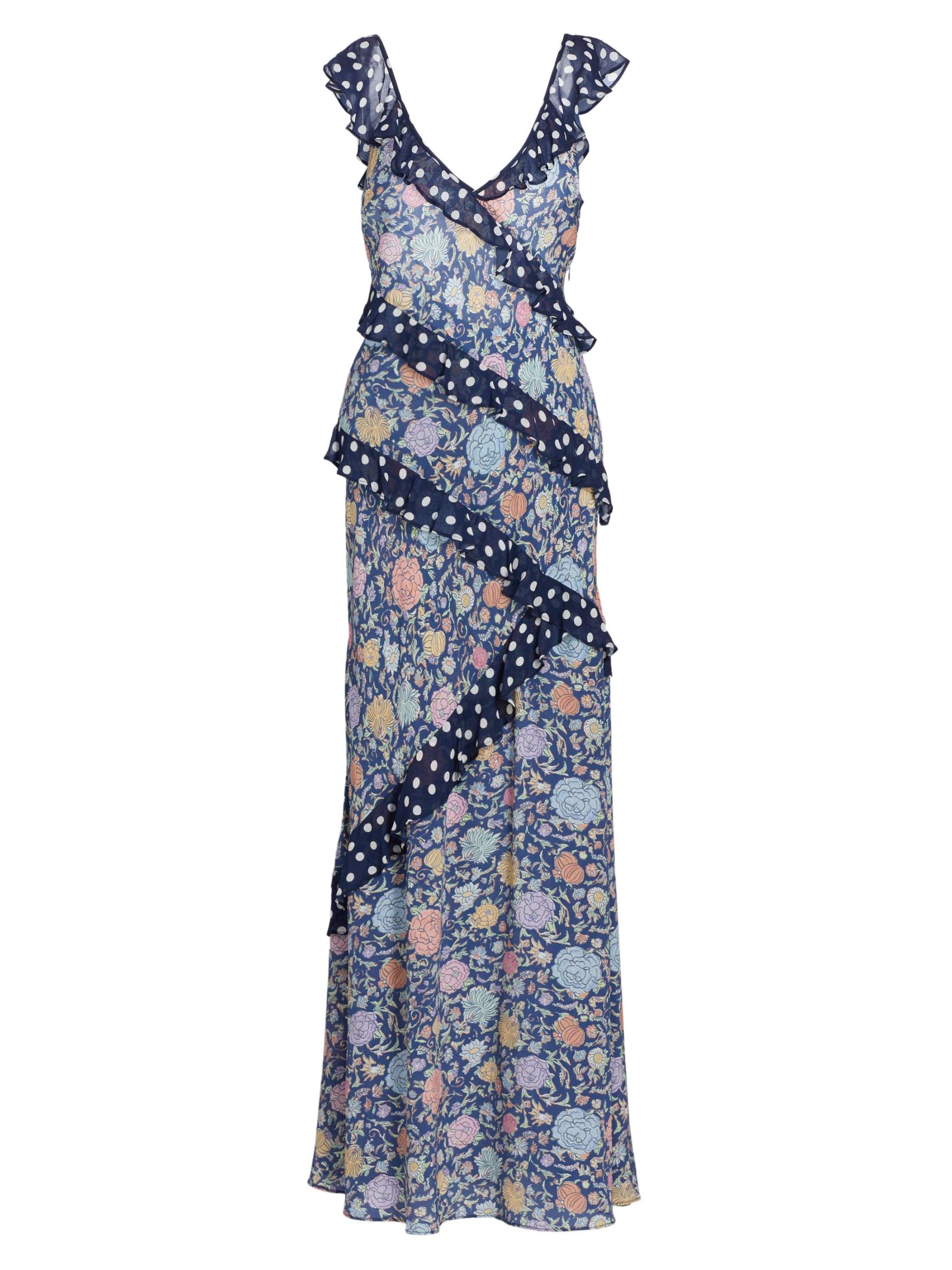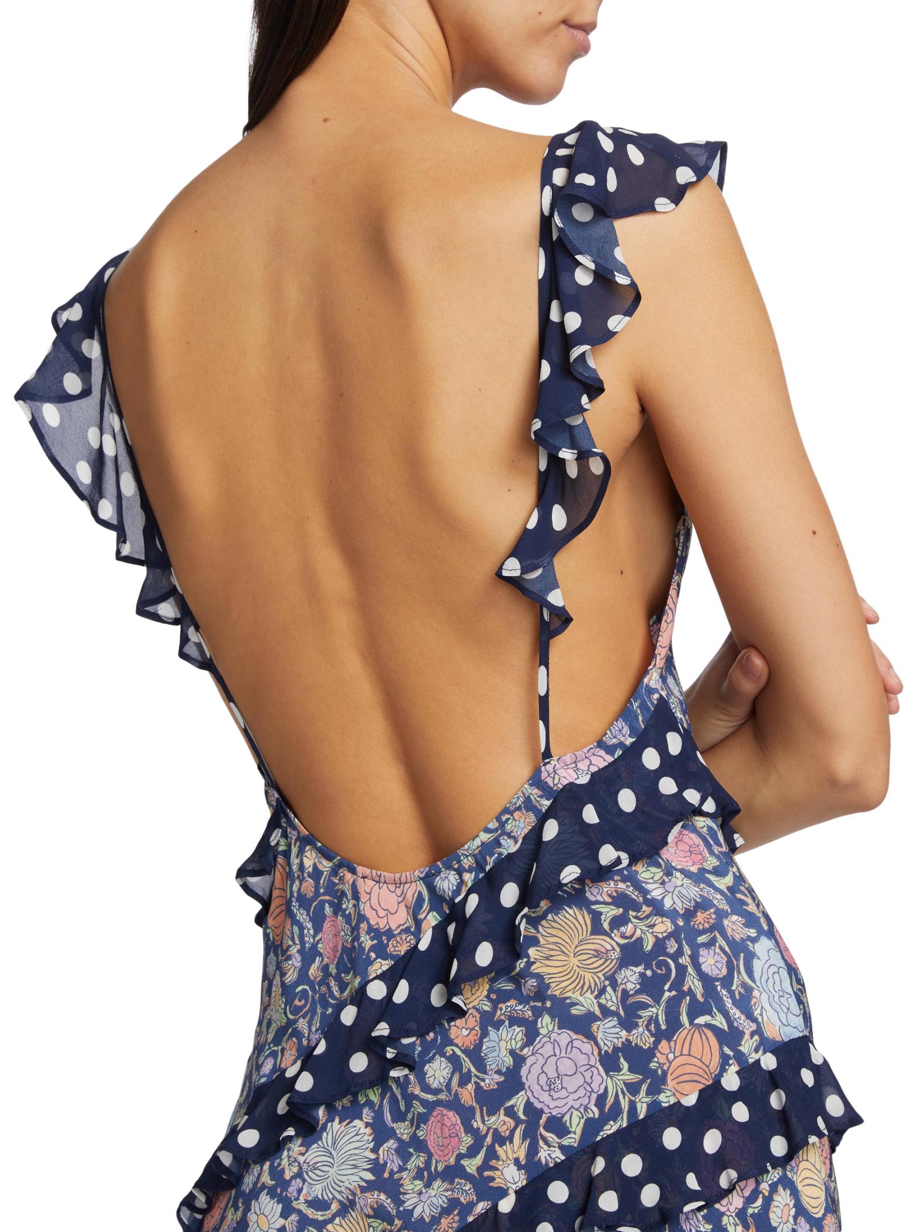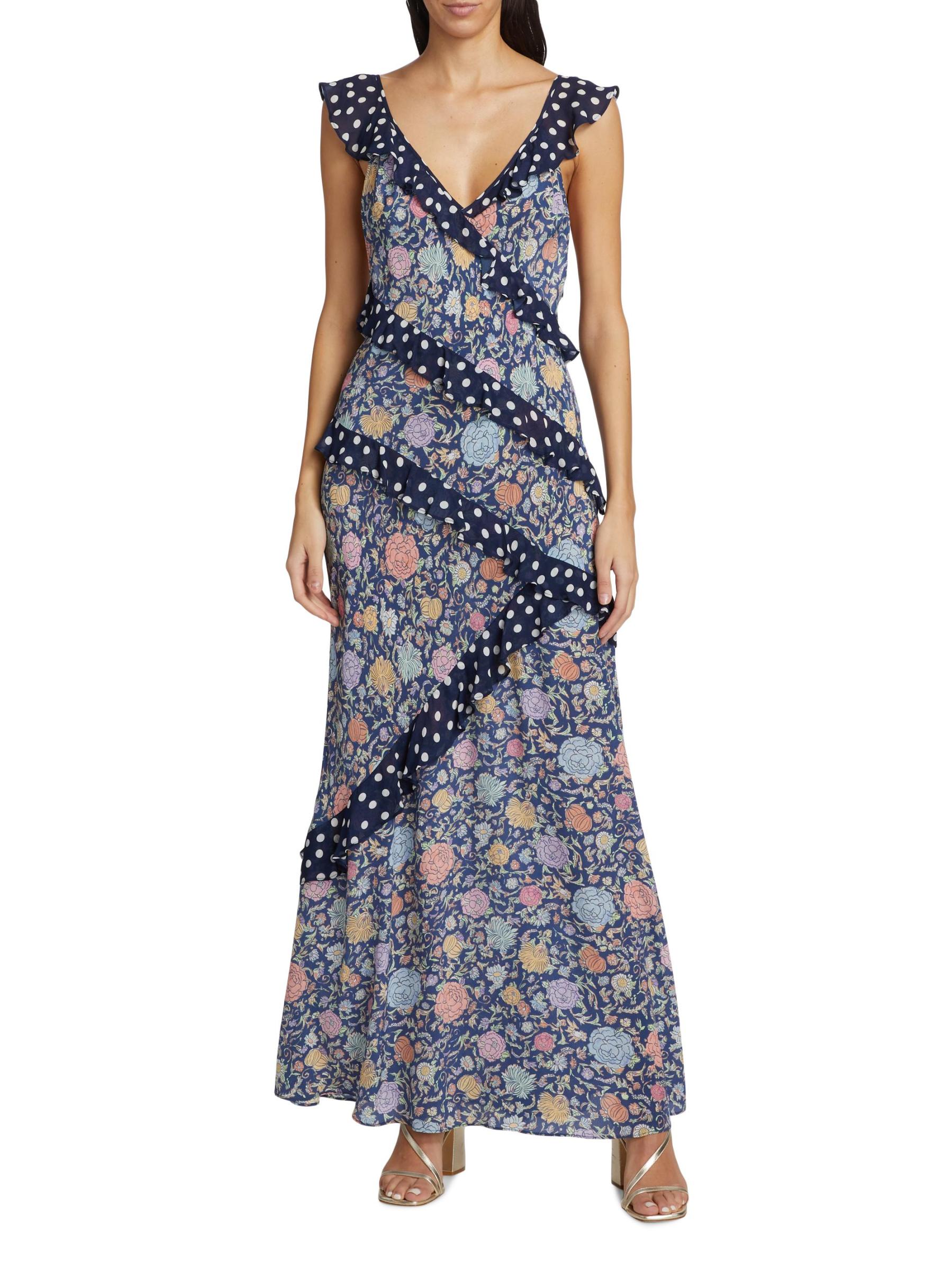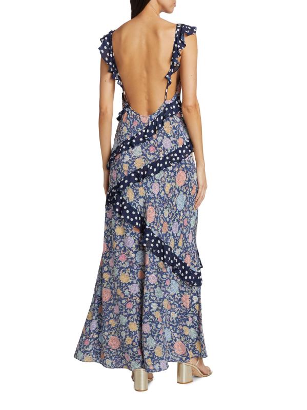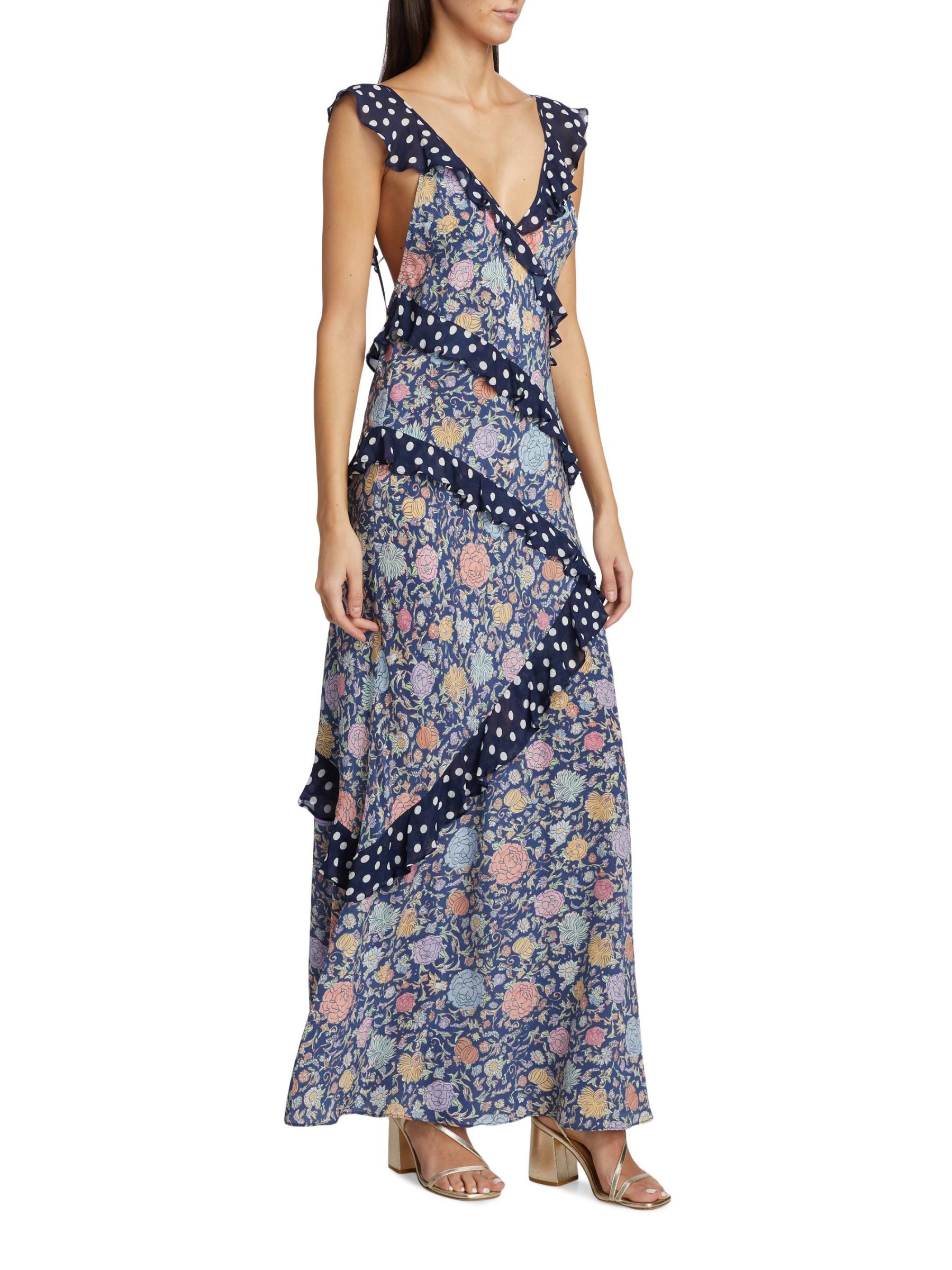 Printed with a romantic floral motif, Rixo's Gail maxi dress showcases a deep V-neck and adjustable straps. This style features a ruffled trim and backless silhouette.V-neck Adjustable straps Ruffled trim Concealed side-zip closure 100% Silk Dry clean Imported