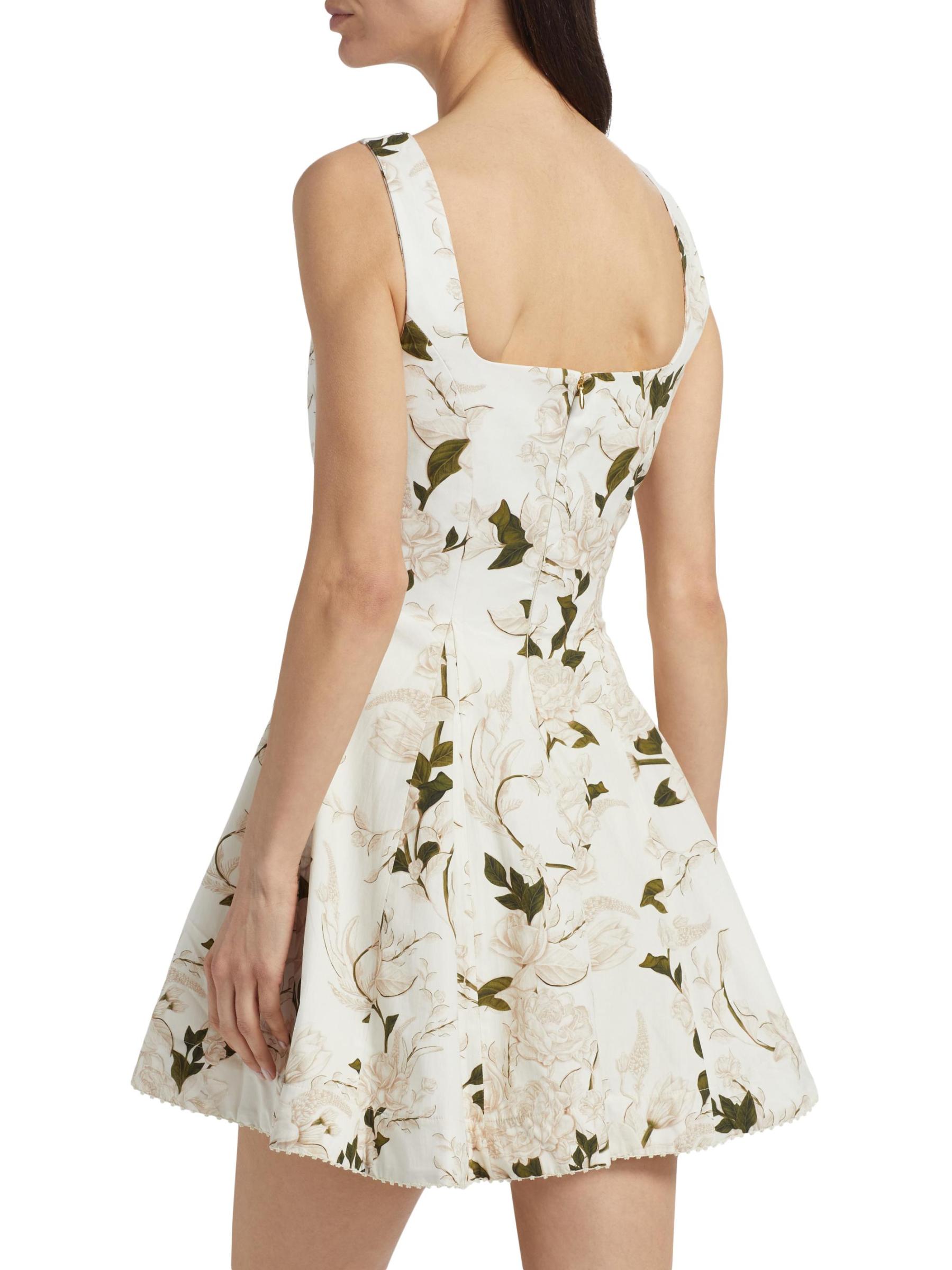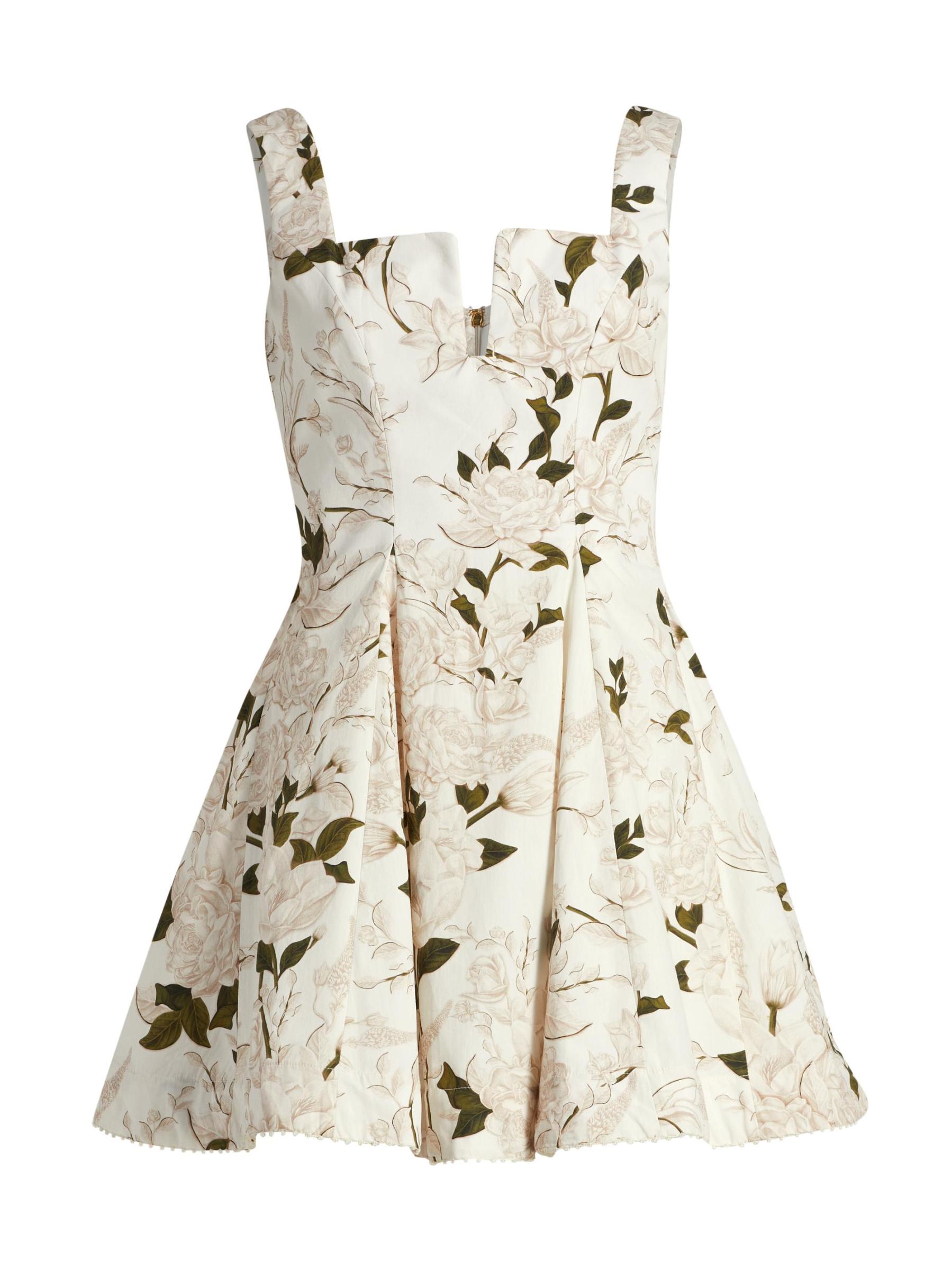 Agua by Agua Bendita's Gardenia minidress features a sharp square neck, notch detail, floral embroidery, and a fit-and-flare silhouette.