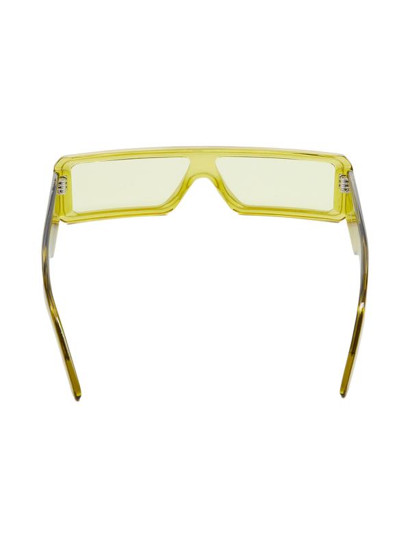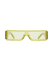 Rick Owen's sleek sunglasses feature slim rectangular frames and the signature trip of silvertone riverts on each temple.