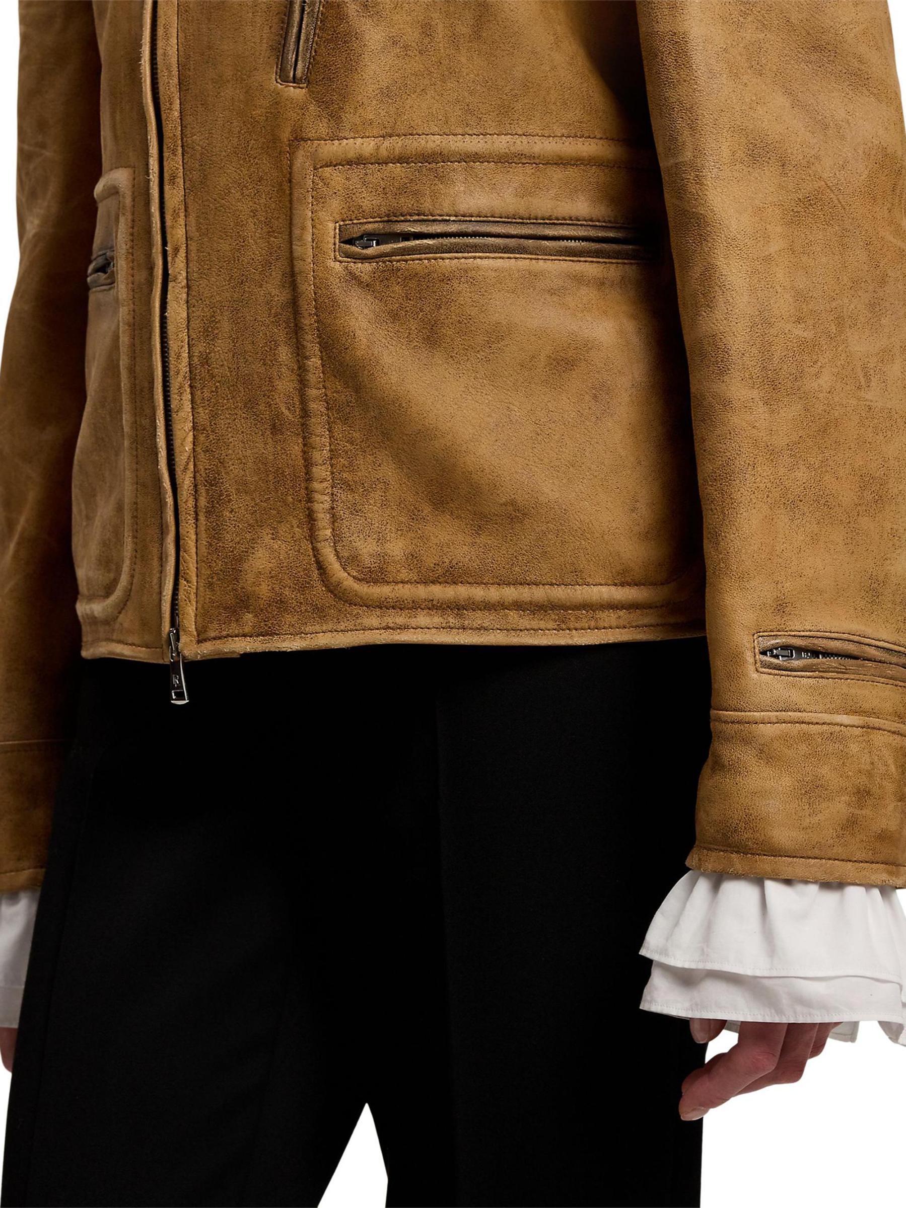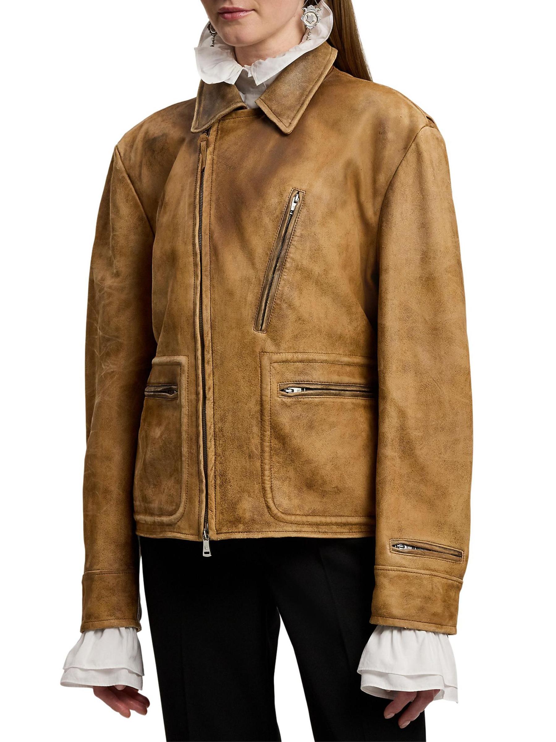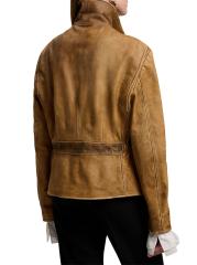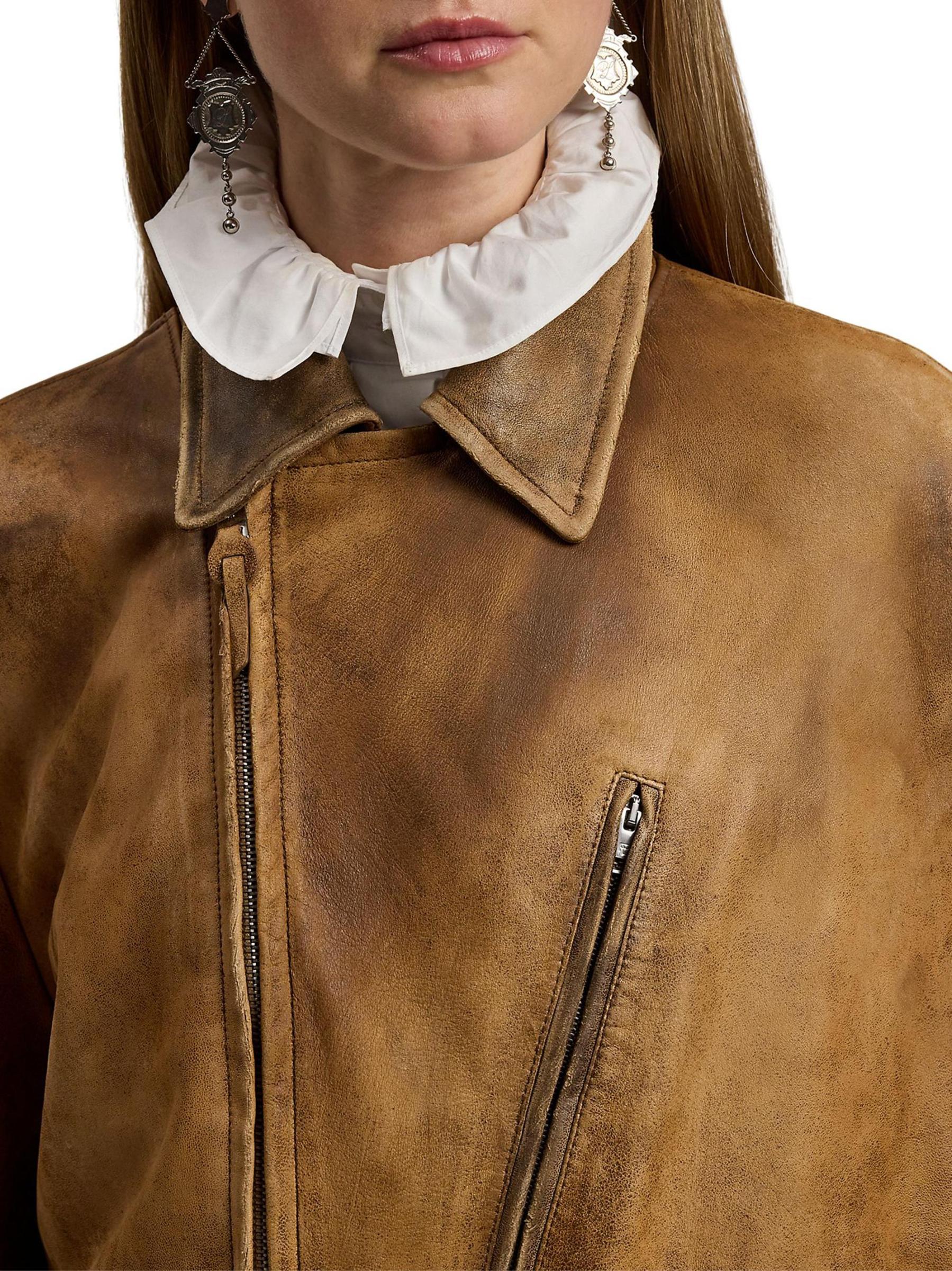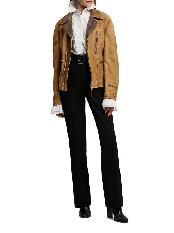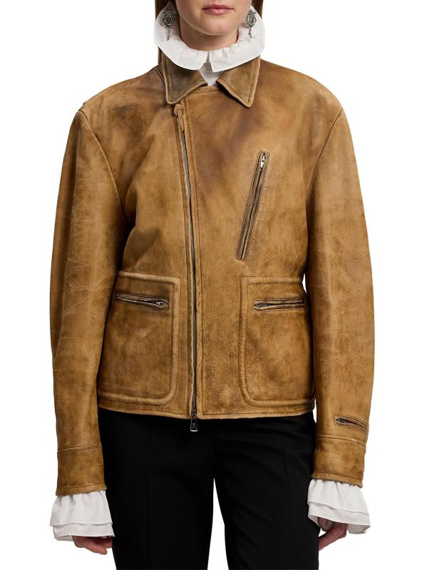 This Gibbons moto jacket from Ralph Lauren, crafted of leather, features a notch collar, multiple zip pockets, and a back strap for a comfortable fit.Notch collar Long sleeves Side zip pockets Front zip closure 100% leather Lining: 100% cupro Fill: 100% polyester Dry clean by leather specialist Made in Italy