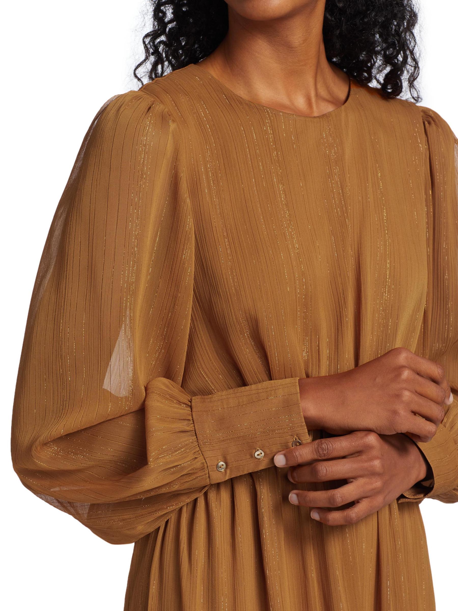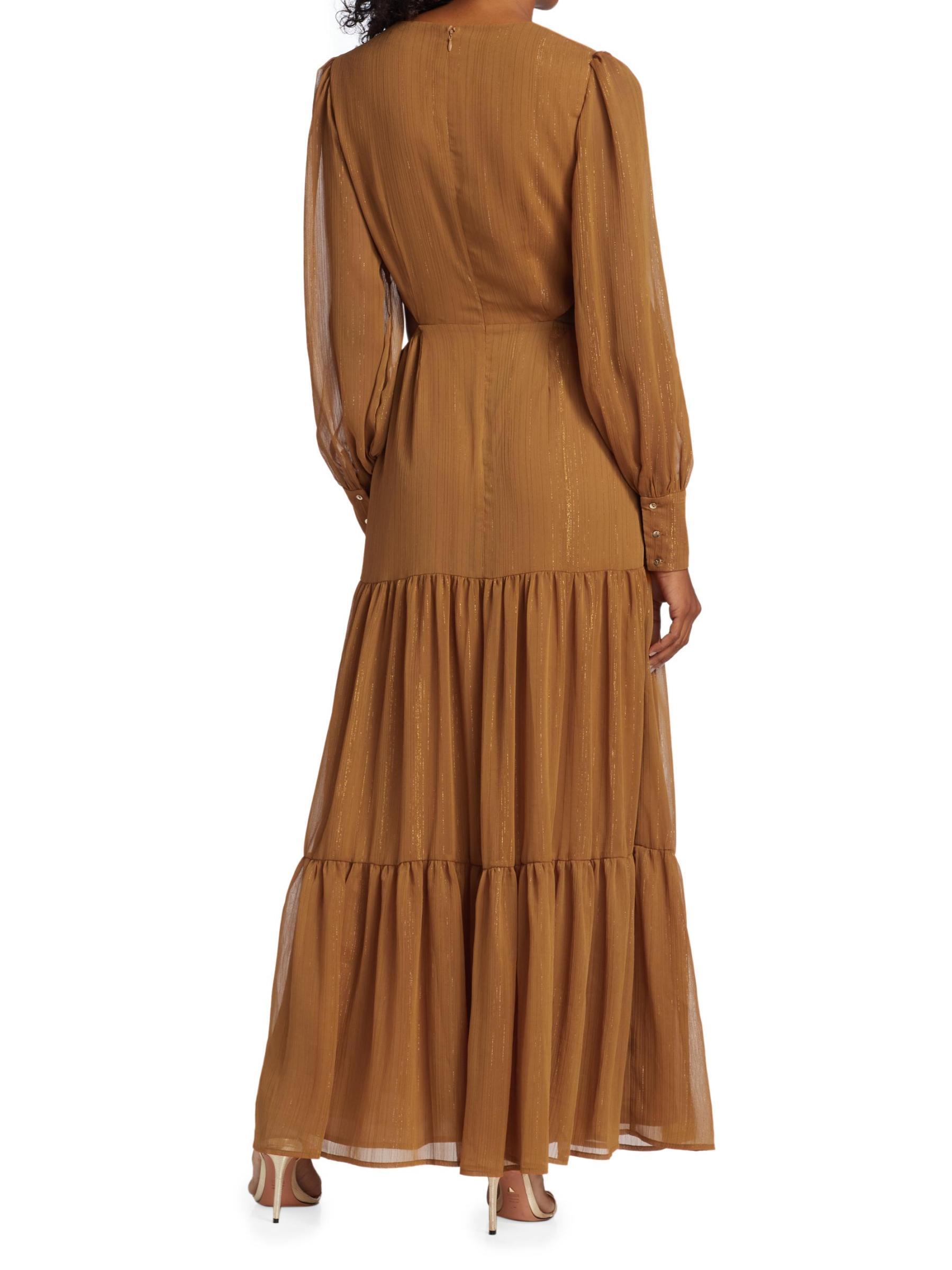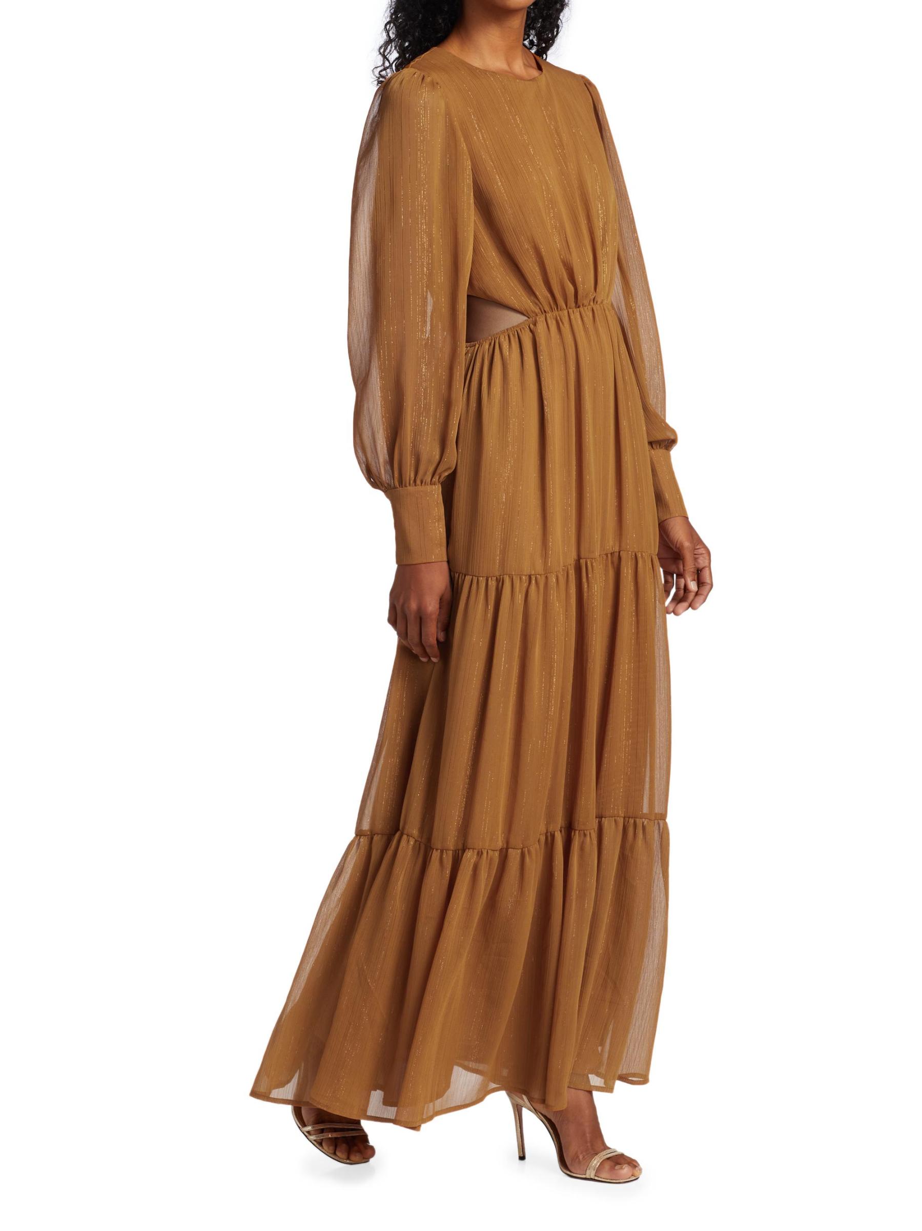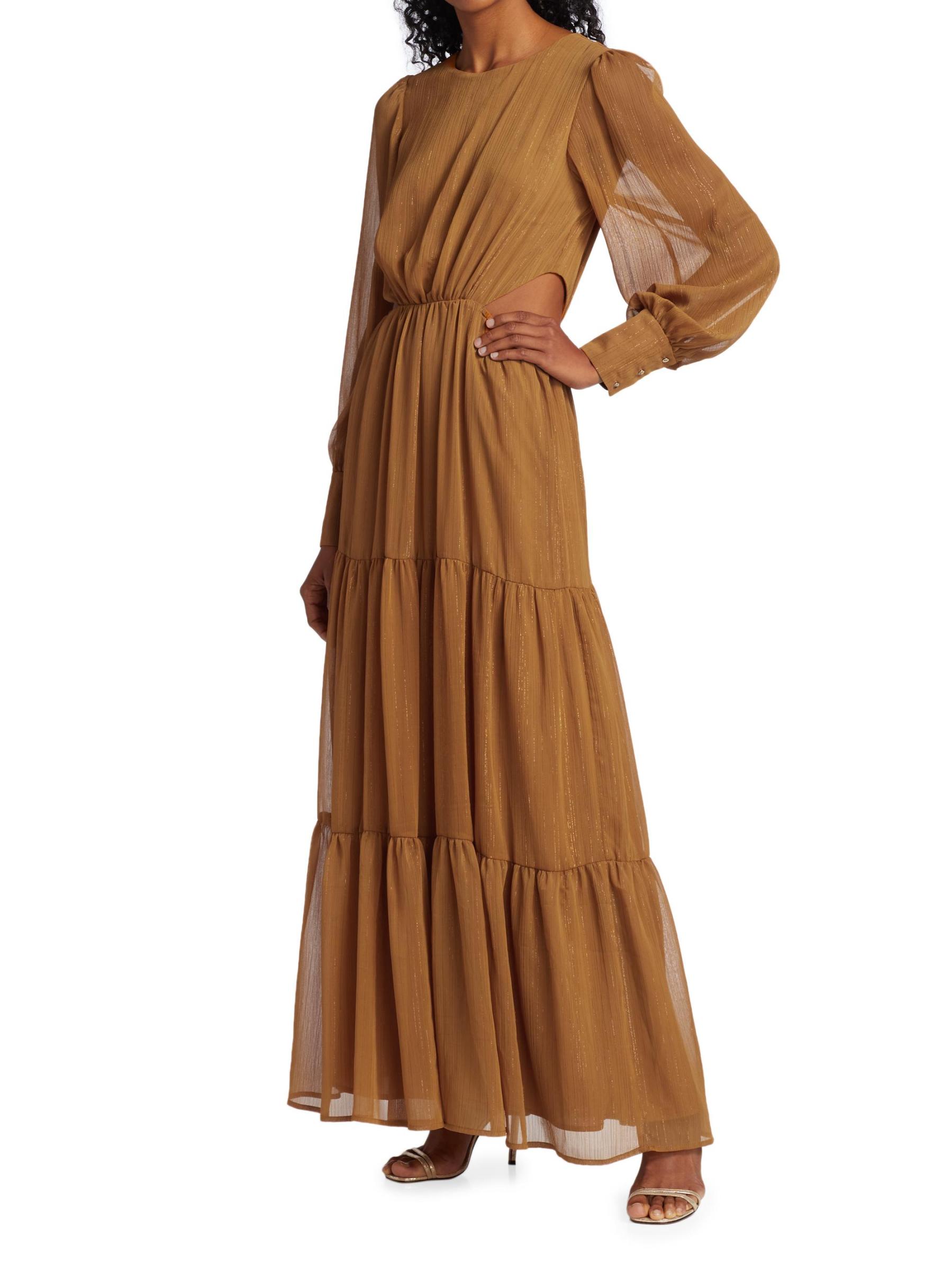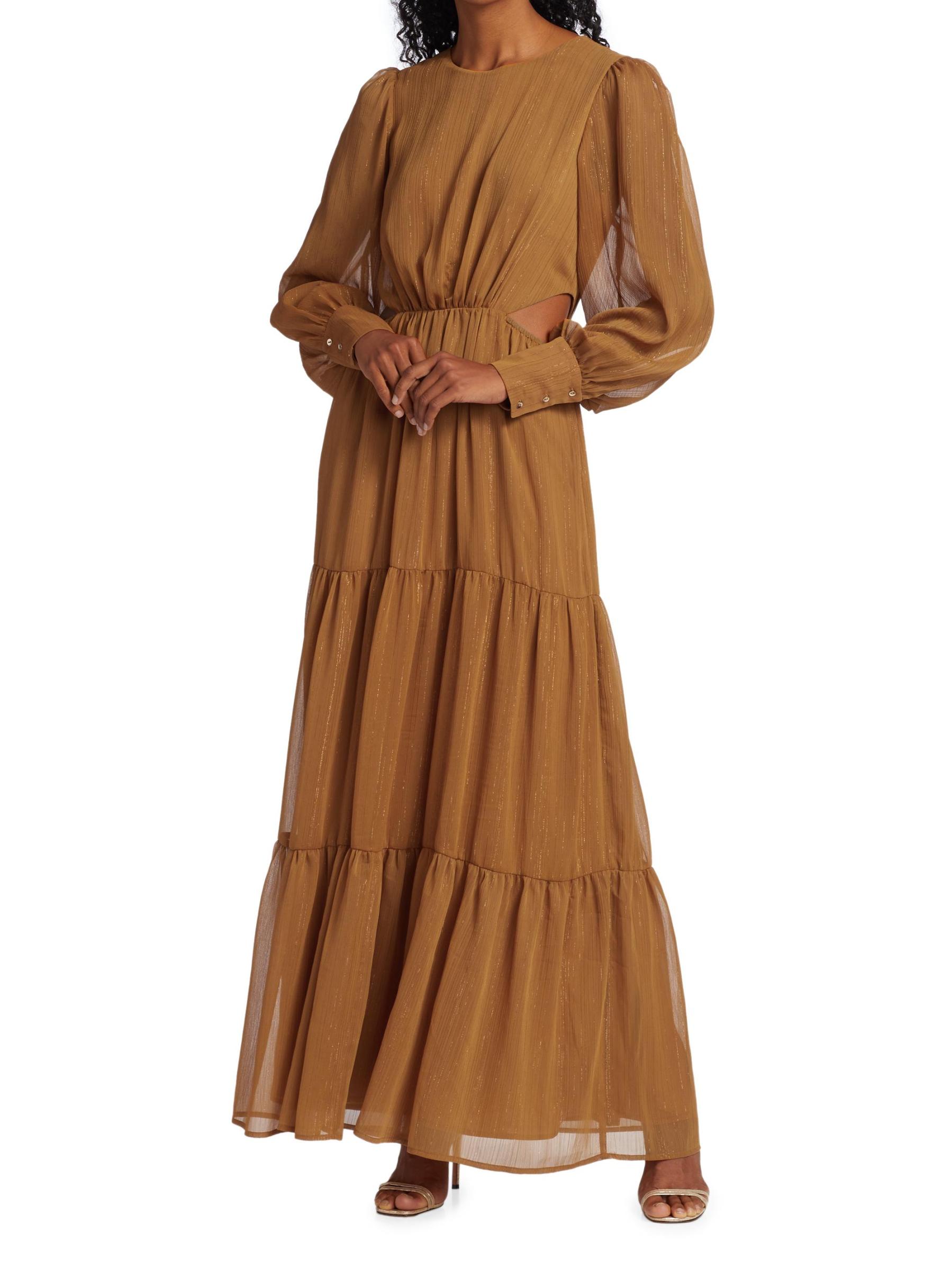 From the Wayf Collection. This dramatic maxi dress features billowy puff-sleeves ending in tailored button cuffs, with pops of shine with metallic threading on sheer fabrication and edgy cutouts at sides.Round neck Long sleeves Button cuffs Back zip closure Tiered skirt 95% polyester/5% metallic Lining: 100% polyester Hand wash Imported