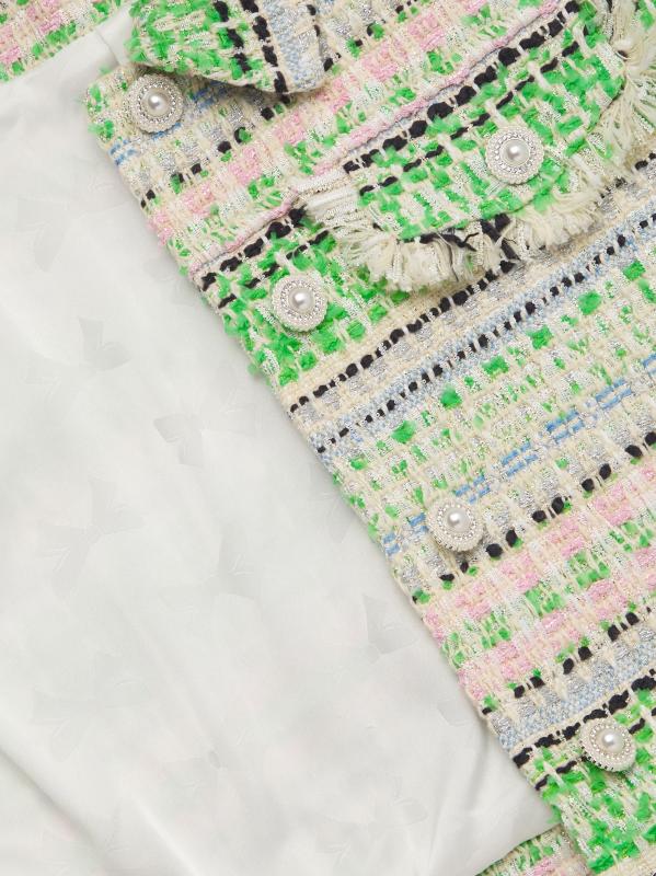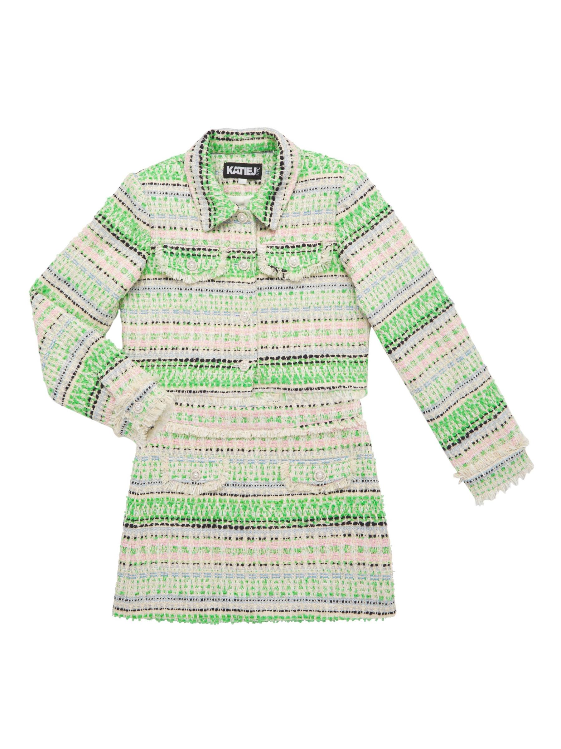 Crafted of textured tweed, the Charlize jacket from KatieJ NYC features a structured cropped silhouette. Pocket flap detailing, rhinestone/pearl buttons, and frayed edging complete the tailored piece.