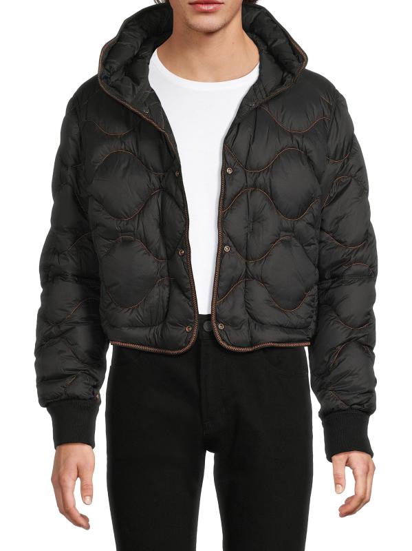 flap pockets Side zip pockets Rib-knit trim Interior quilted shell Front zip closure SHELL: 100% Nylon Lining: 100% Nylon Mesh lining: 100% polyester Dry clean Imported