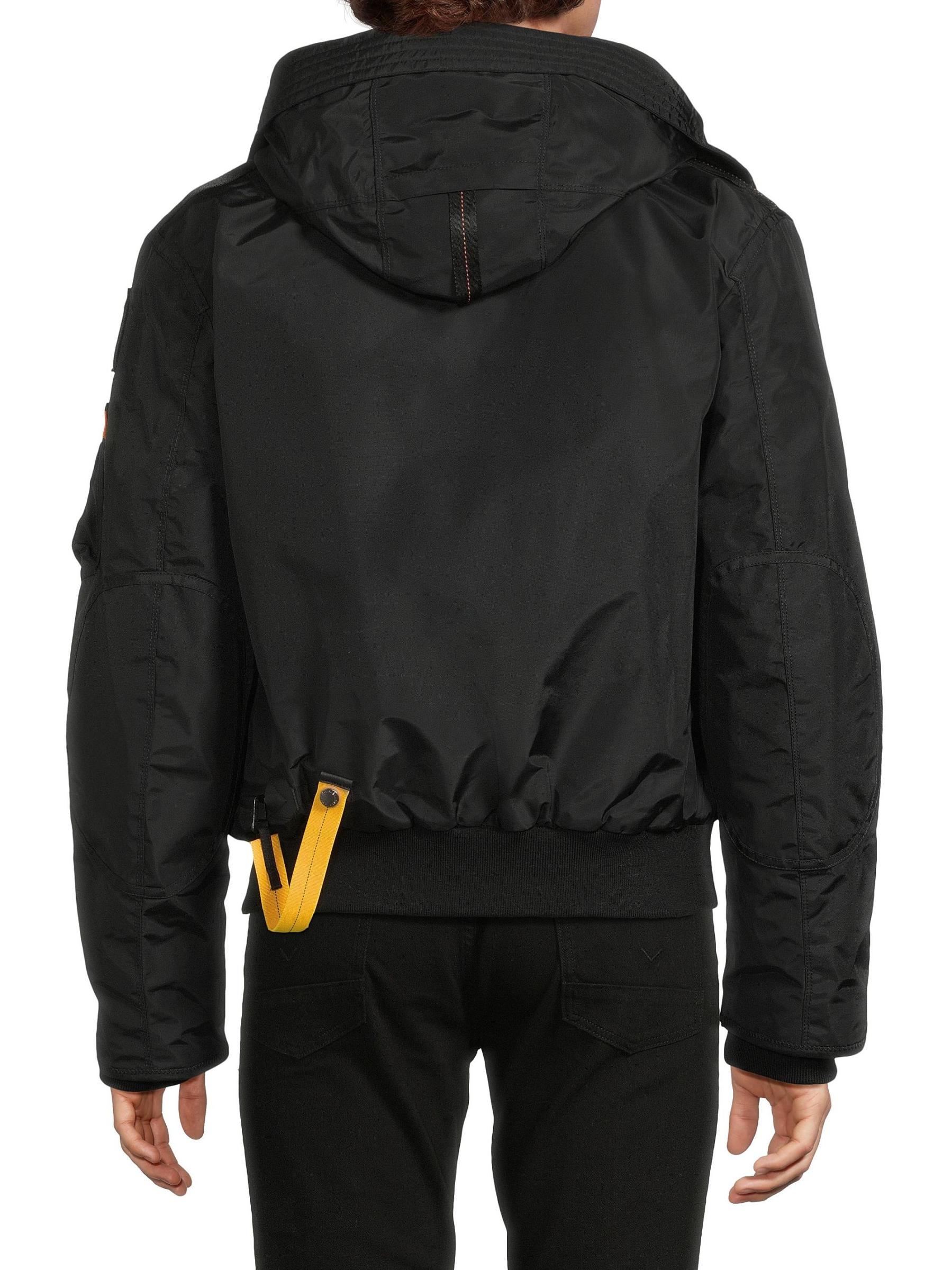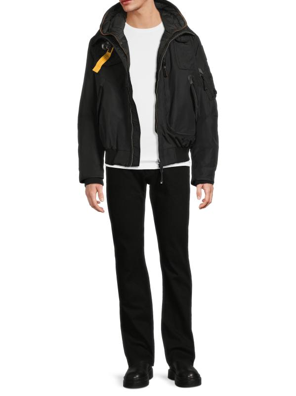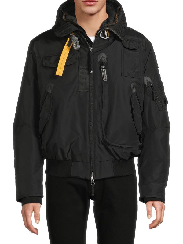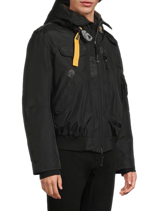 Made of laminated nylon, Parajumpers's Gobi hooded bomber jacket is styled with six outer pockets, the label's patch on the sleeve, and the iconic yellow tape closure at the neck.