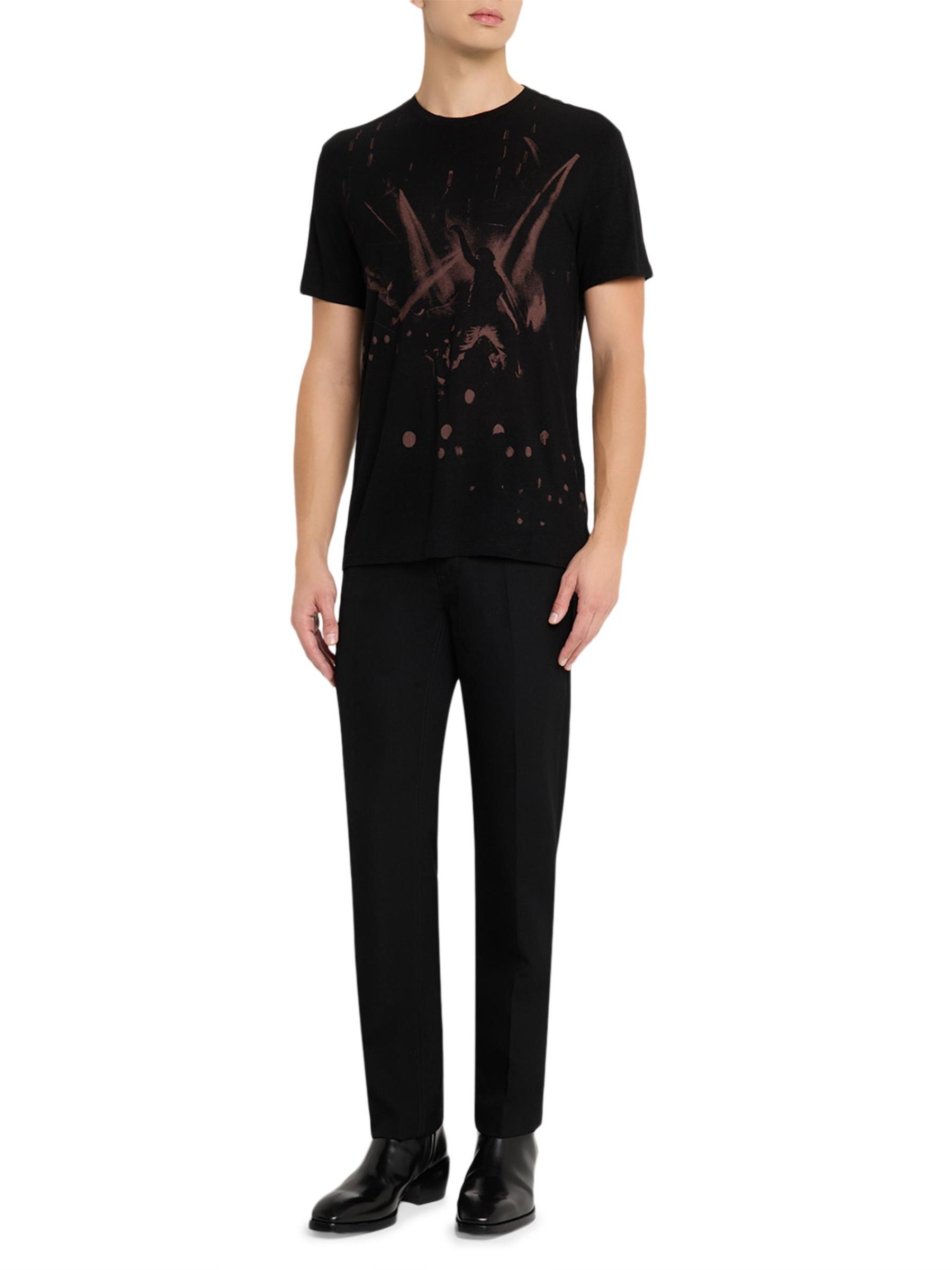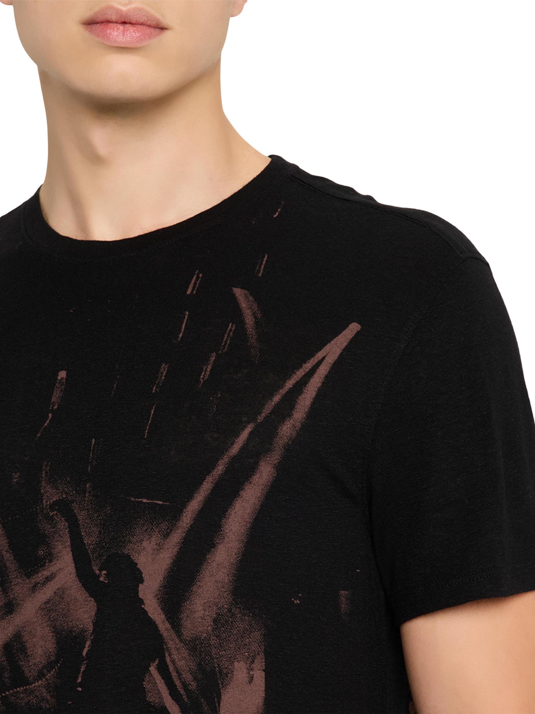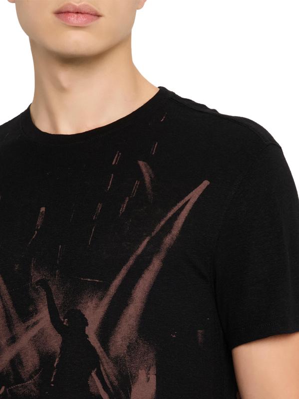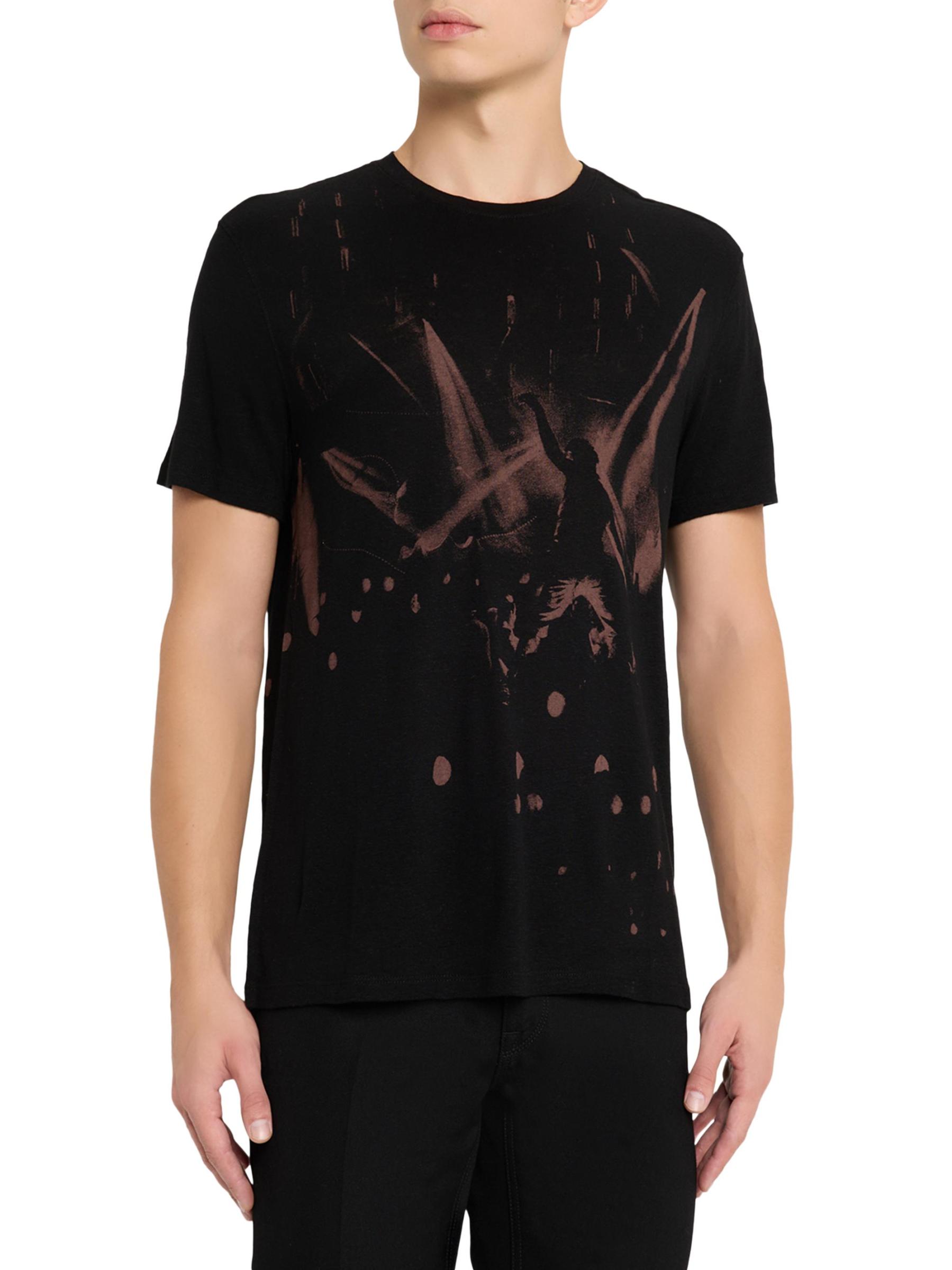 Crafted of a linen-blend, this crewneck T-shirt from John Varvatos showcases a graffiti-inspired concert scene printed on the front.