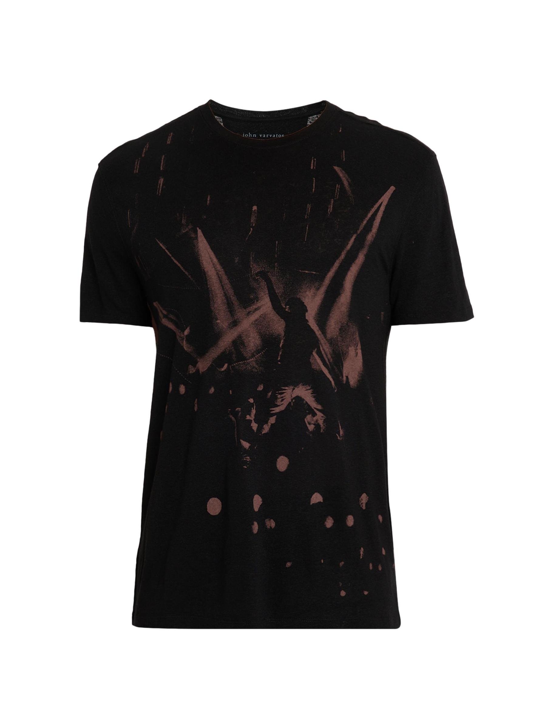 Crafted of a linen-blend, this crewneck T-shirt from John Varvatos showcases a graffiti-inspired concert scene printed on the front.Crewneck Short sleeves Pulls over Linen/modal Machine wash Imported