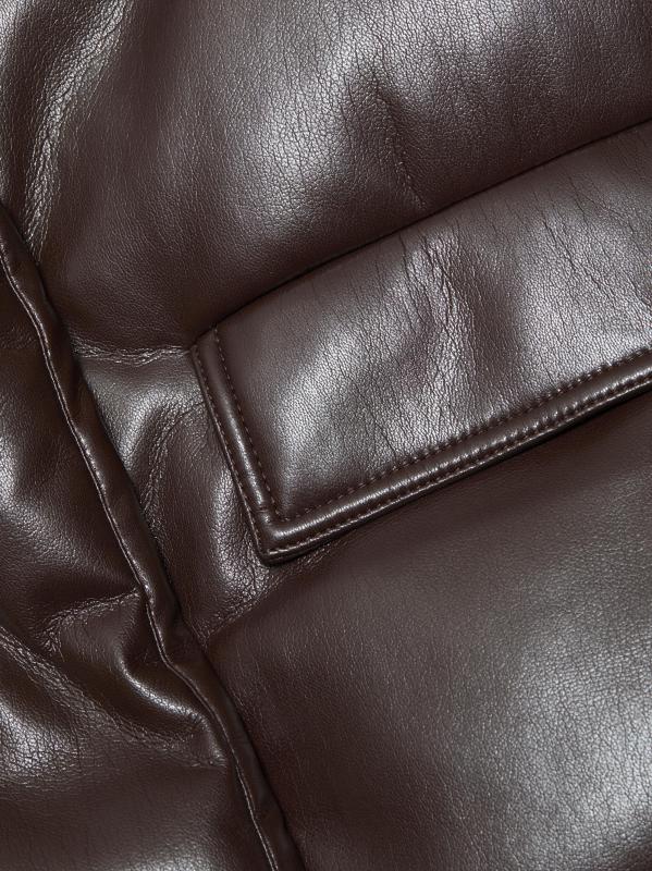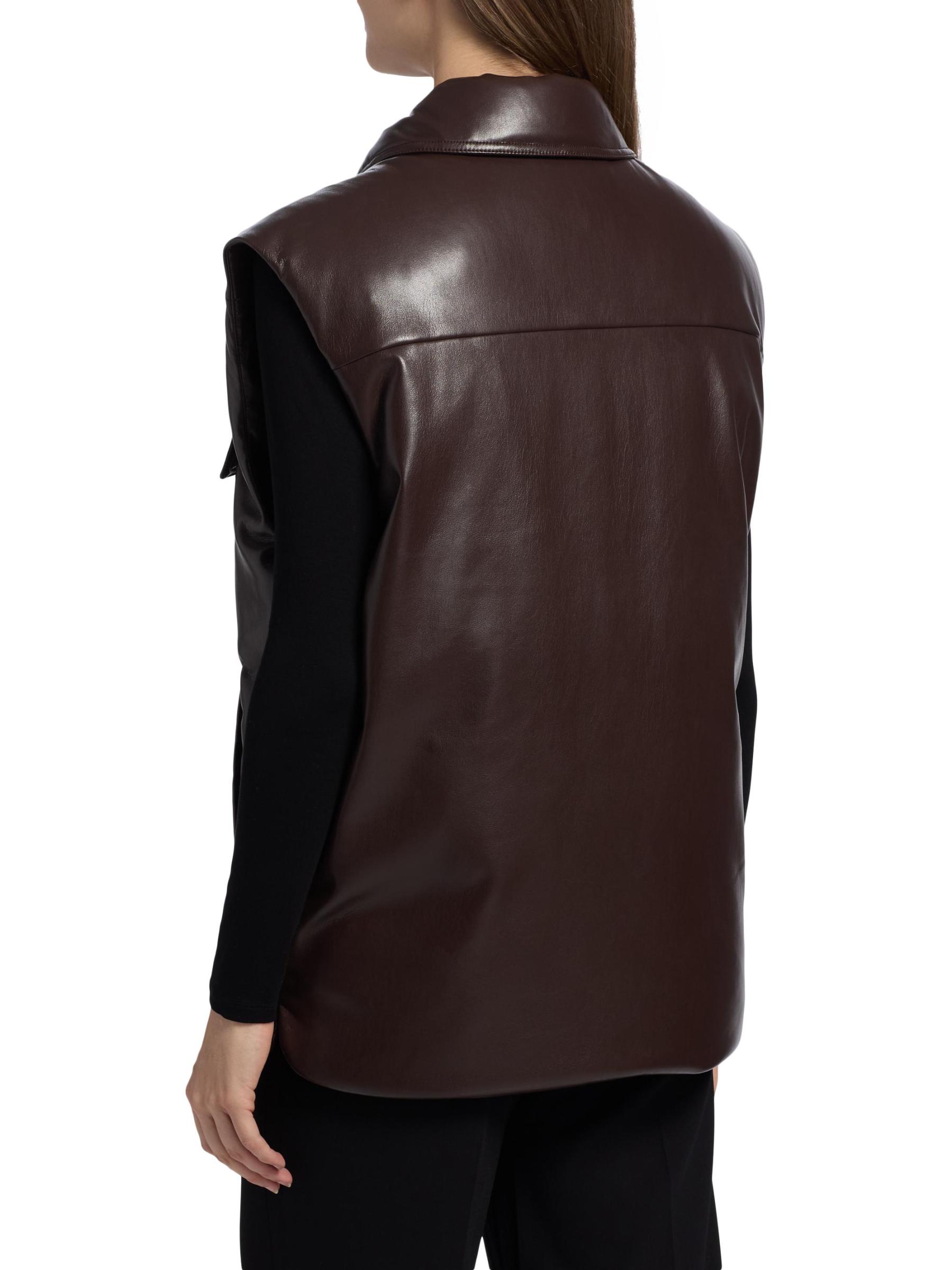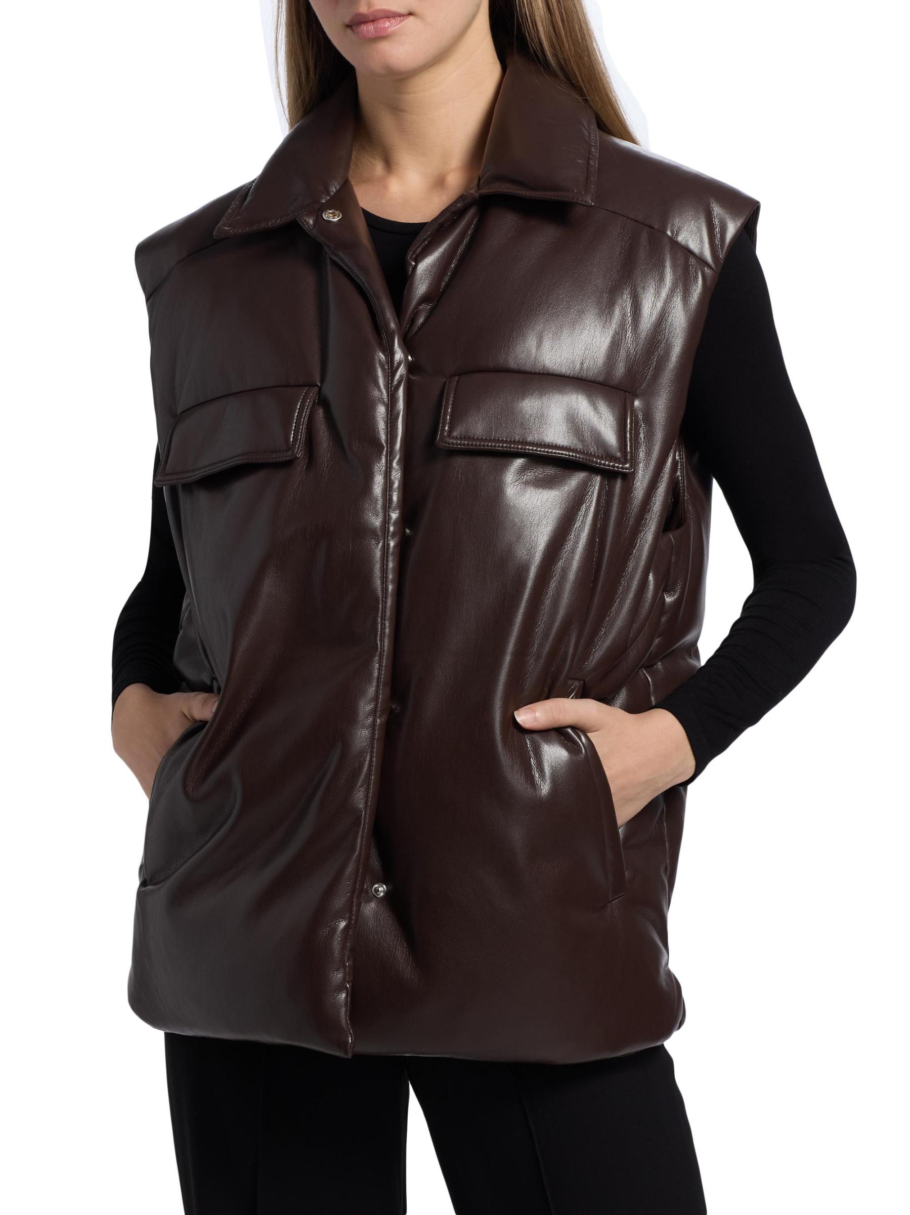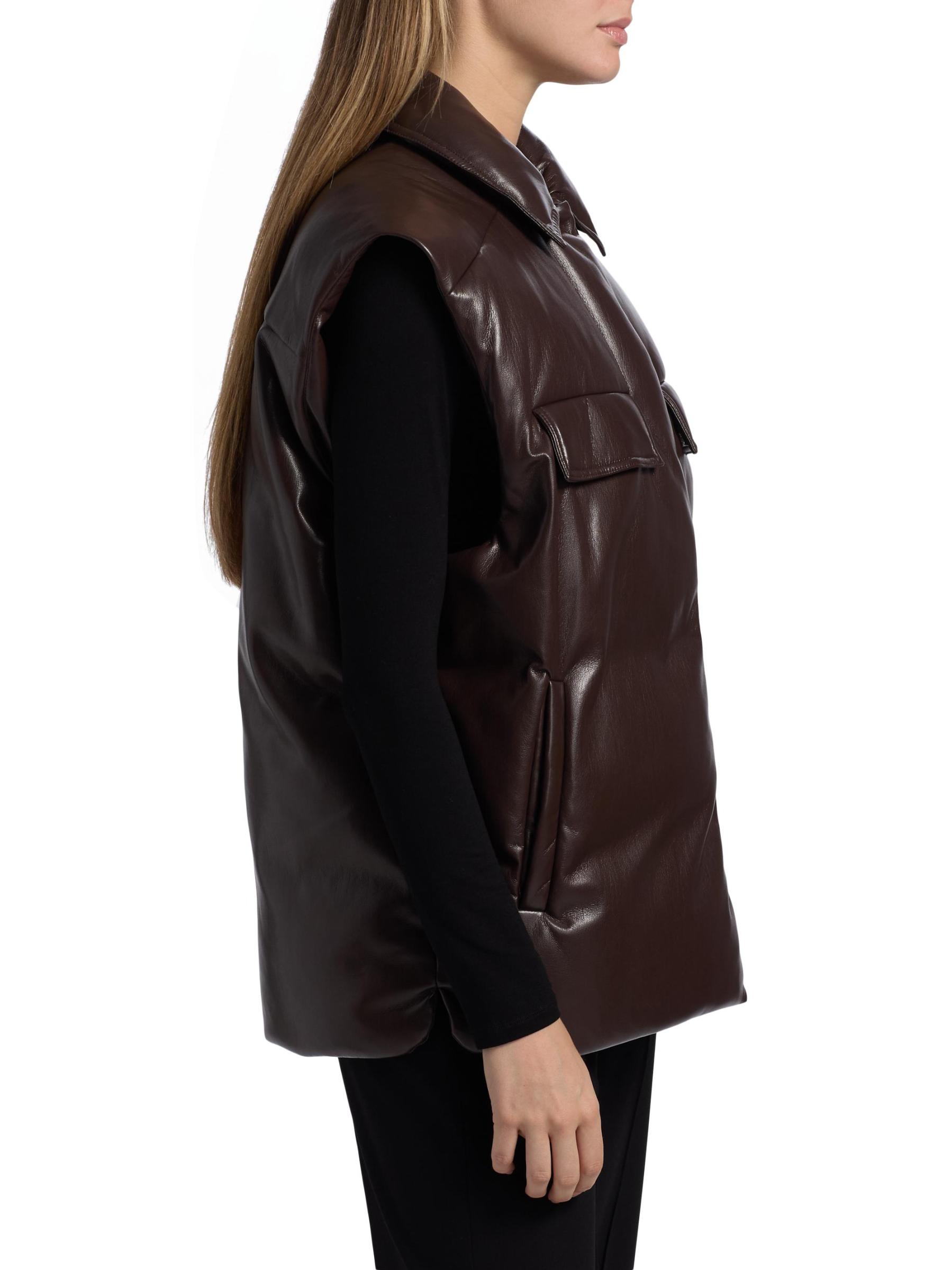 From the Grow Collection. Crafted of faux leather, this Karlene padded vest from Nanushka is styled with a spread collar, side flap pockets, and front snap closure.