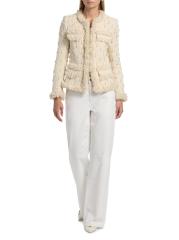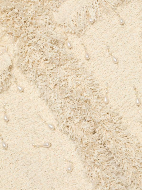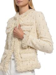 EXCLUSIVE. Kobi Halperin's Hana jacket is crafted of solid boucle tweed and embellished with faux pearl teardrop beading. Voluminous fringe details the collar, flap pockets, and trim of this style for a dramatic finish.Crewneck Long sleeves Chest and side flap pockets Fringe trim Concealed front hook-and-eye closure 100% polyester Dry clean Imported