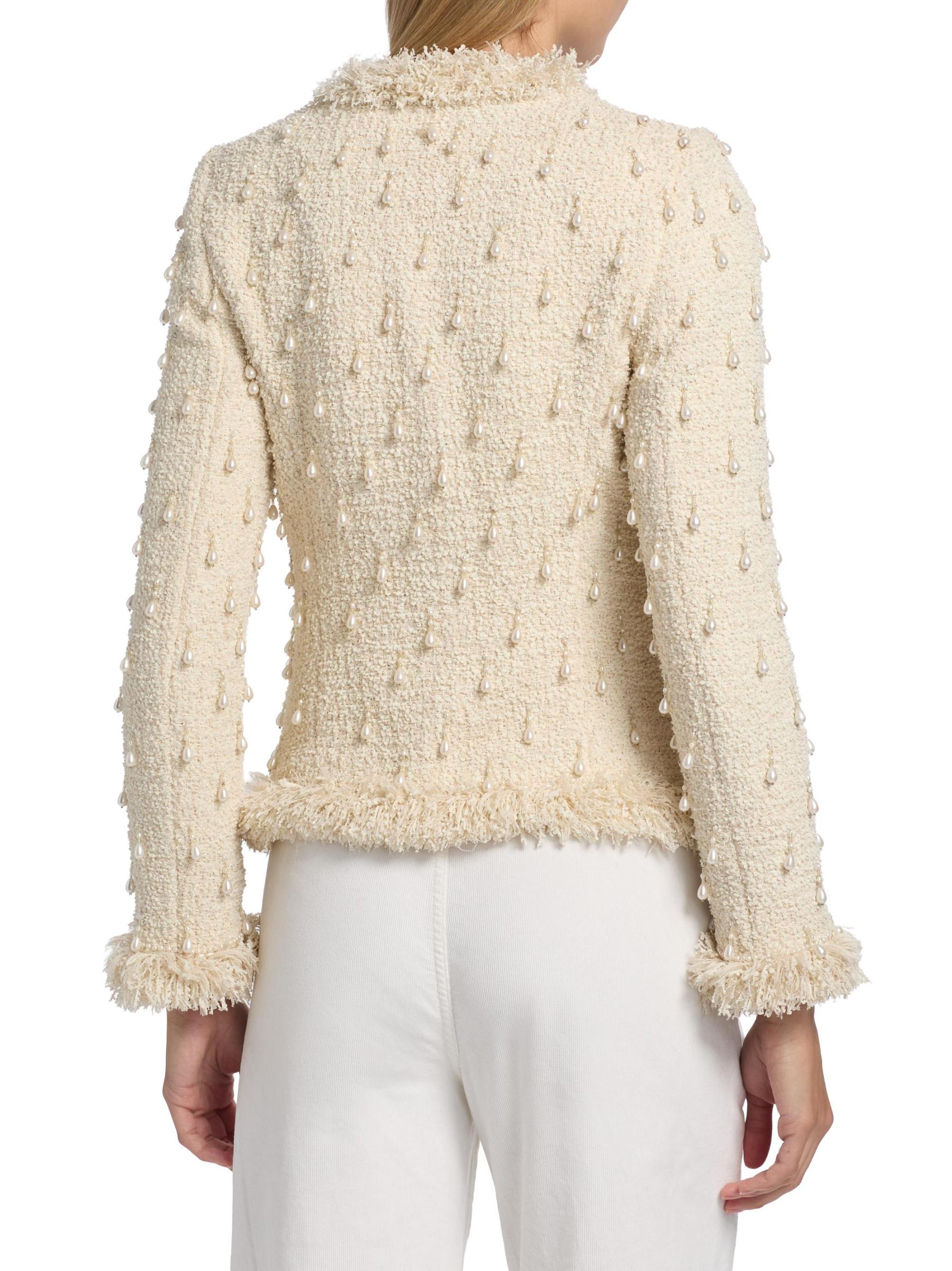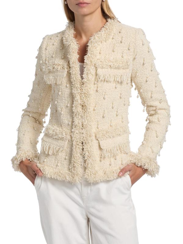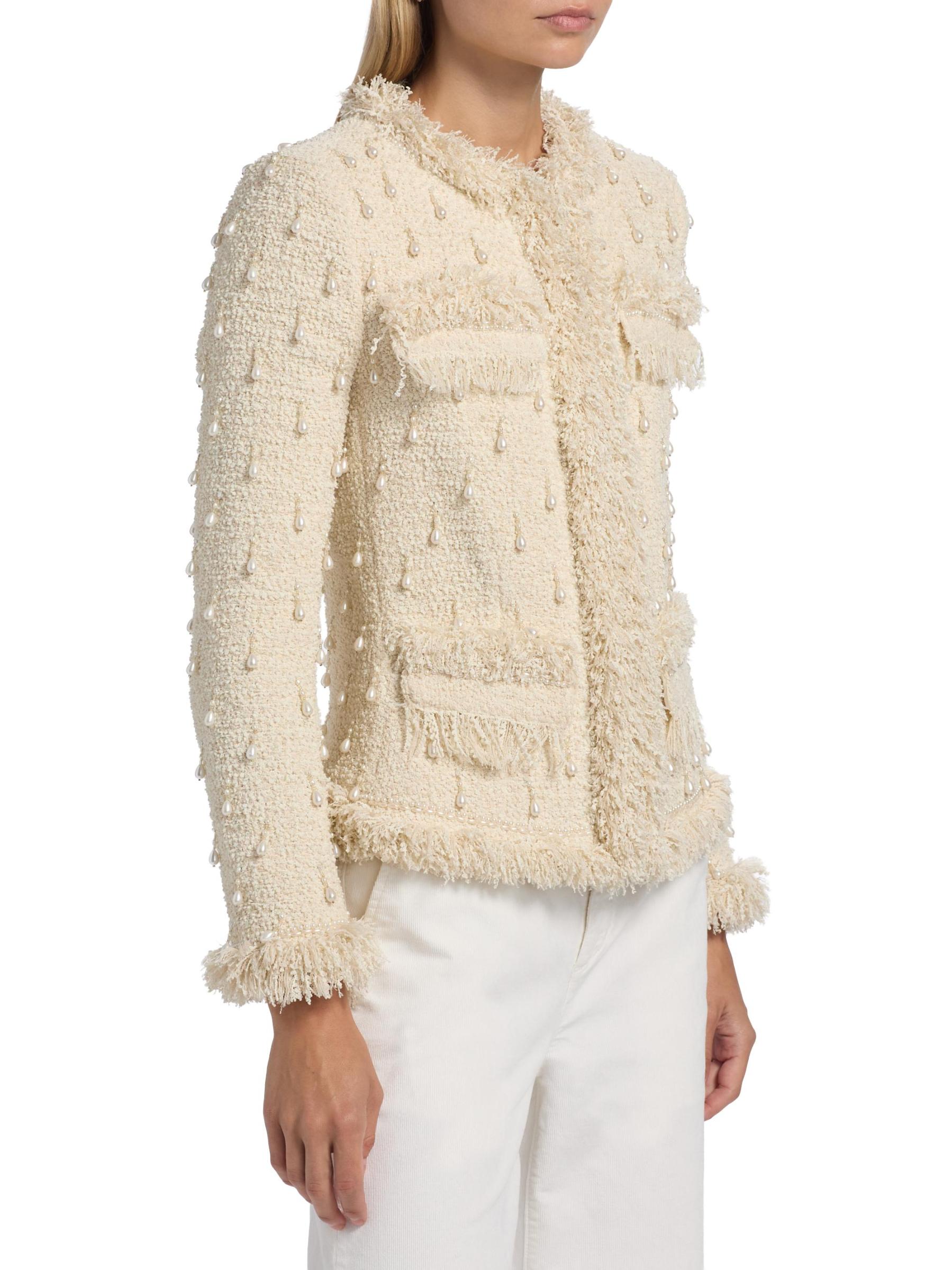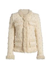 EXCLUSIVE. Kobi Halperin's Hana jacket is crafted of solid boucle tweed and embellished with faux pearl teardrop beading. Voluminous fringe details the collar, flap pockets, and trim of this style for a dramatic finish.