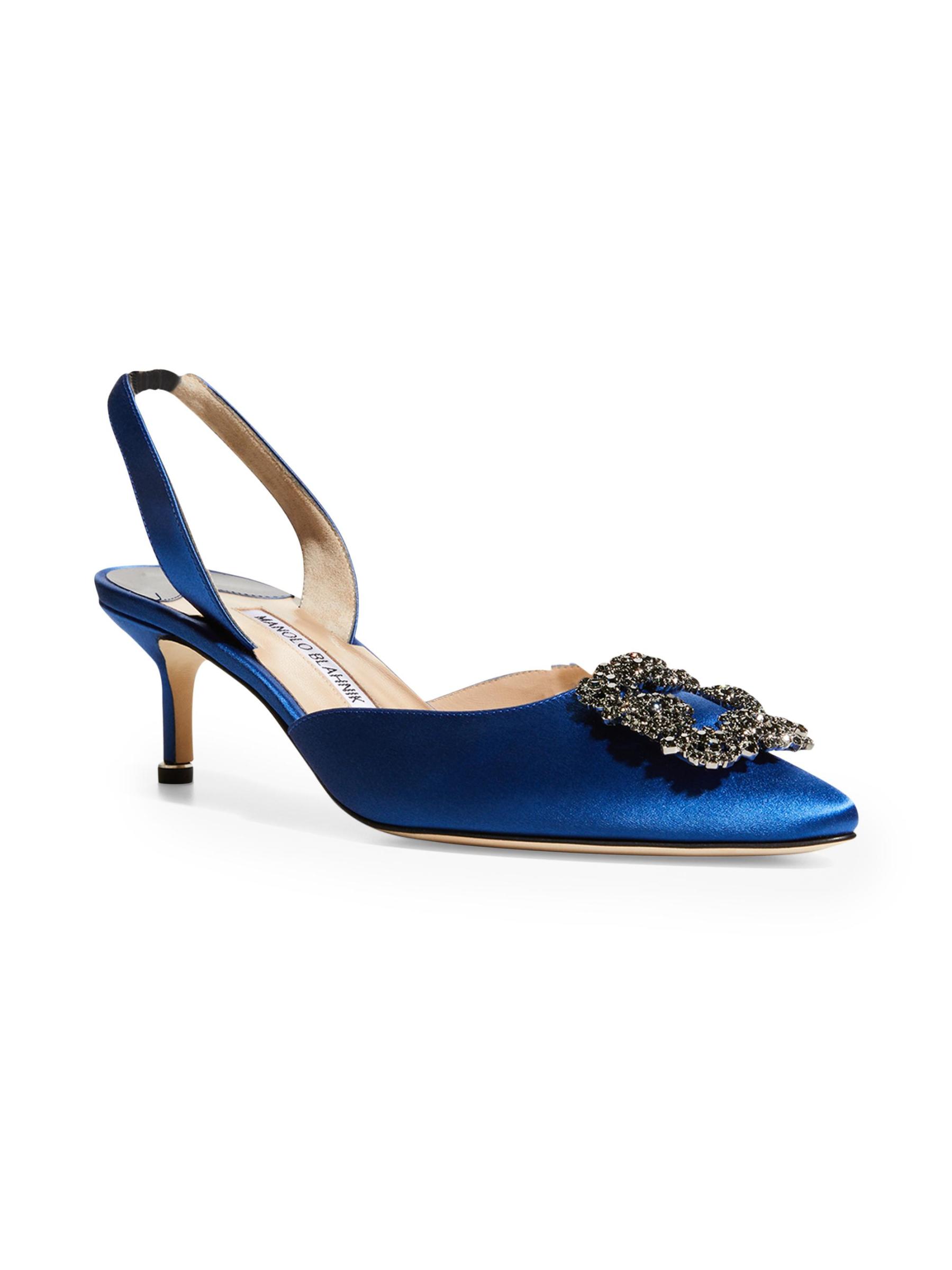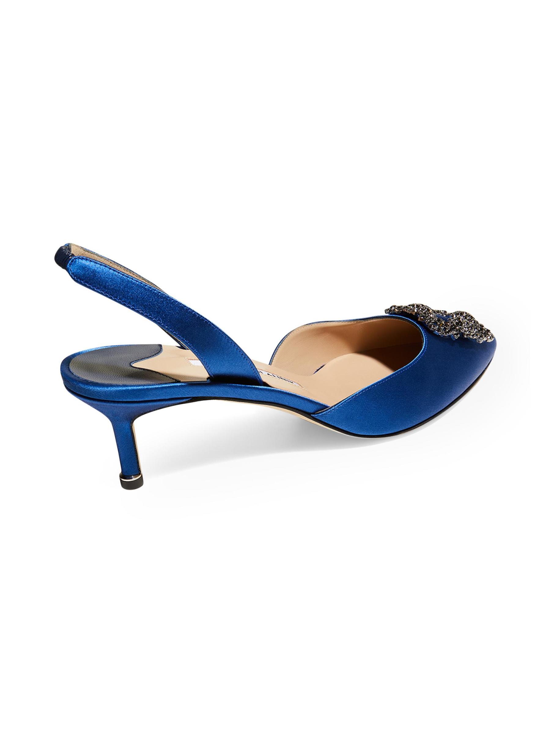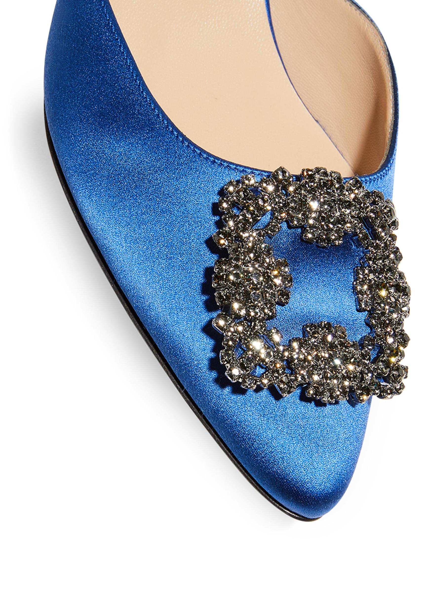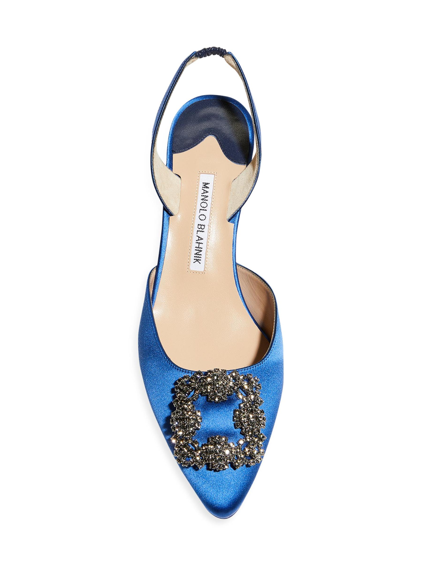 Manolo Blahnik’s signature Hangisi slingback pumps are crafted of satin with a glittering square crystal buckle at the toe.