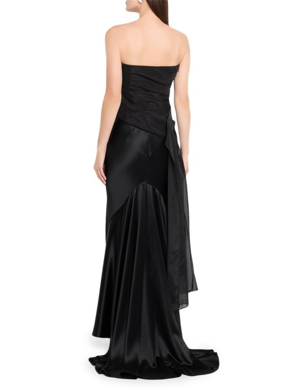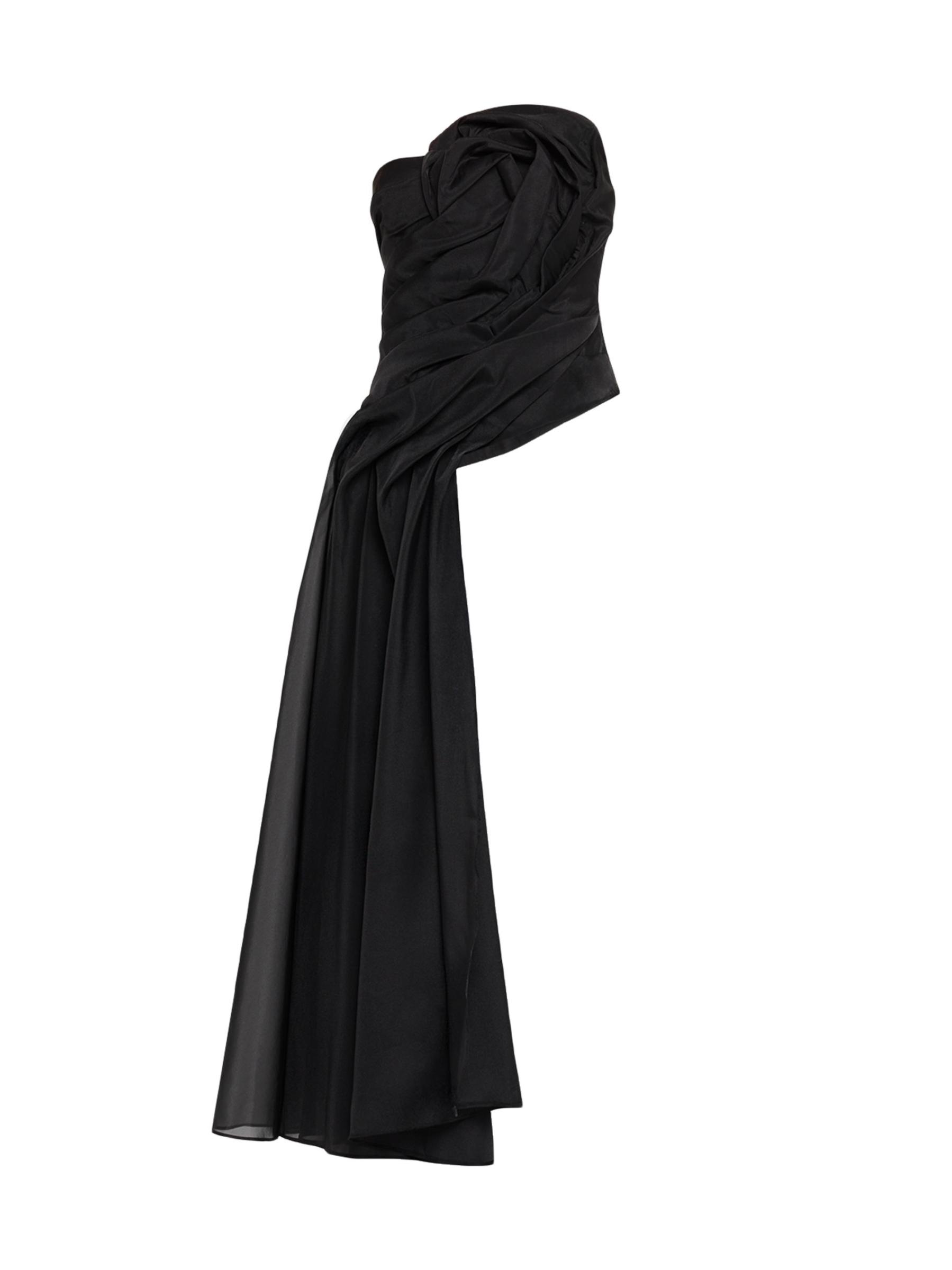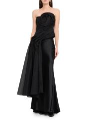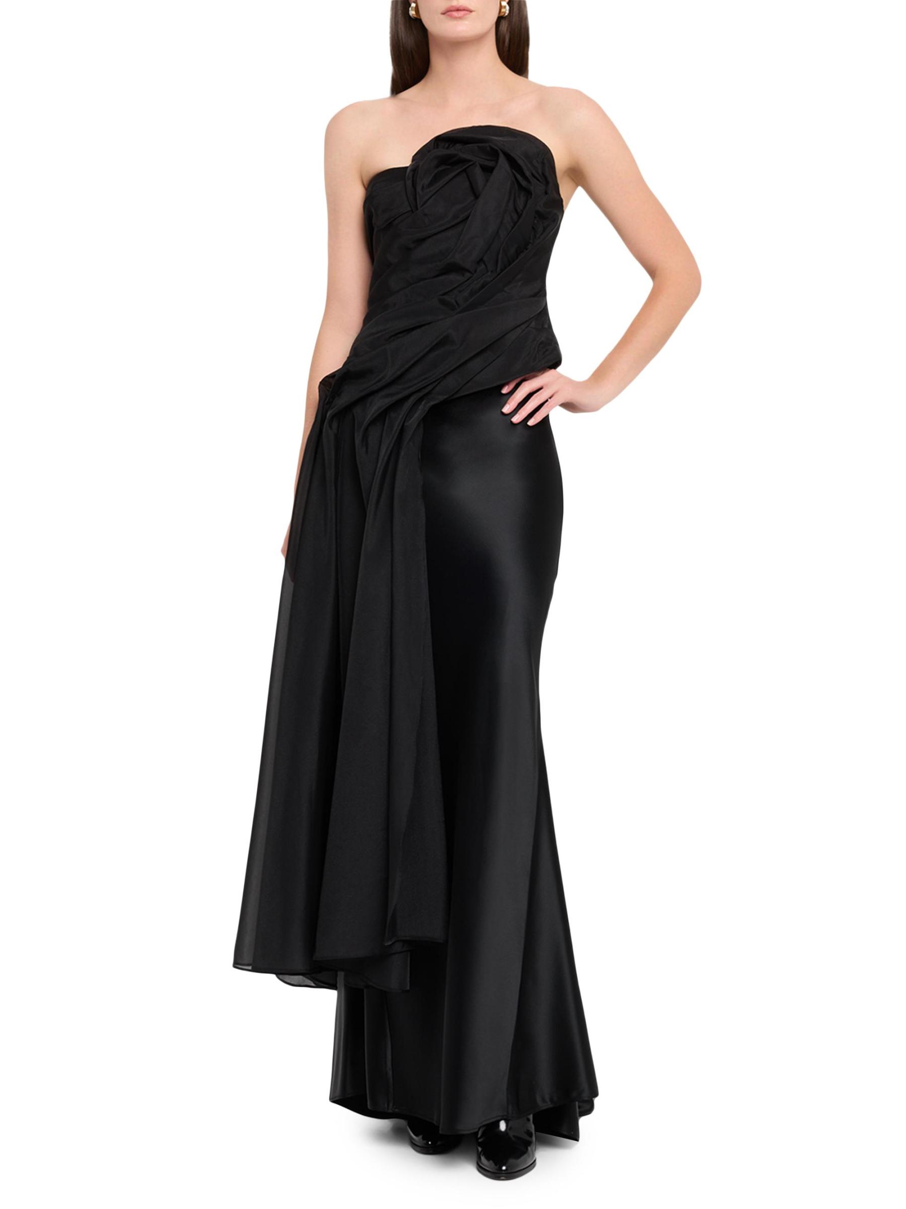 Adorned with elegant draping, the Hawford top from Acler elevates a classic strapless silhouette with a rosette-inspired detail and a long panel that flows down the figure.