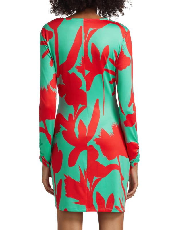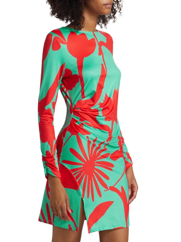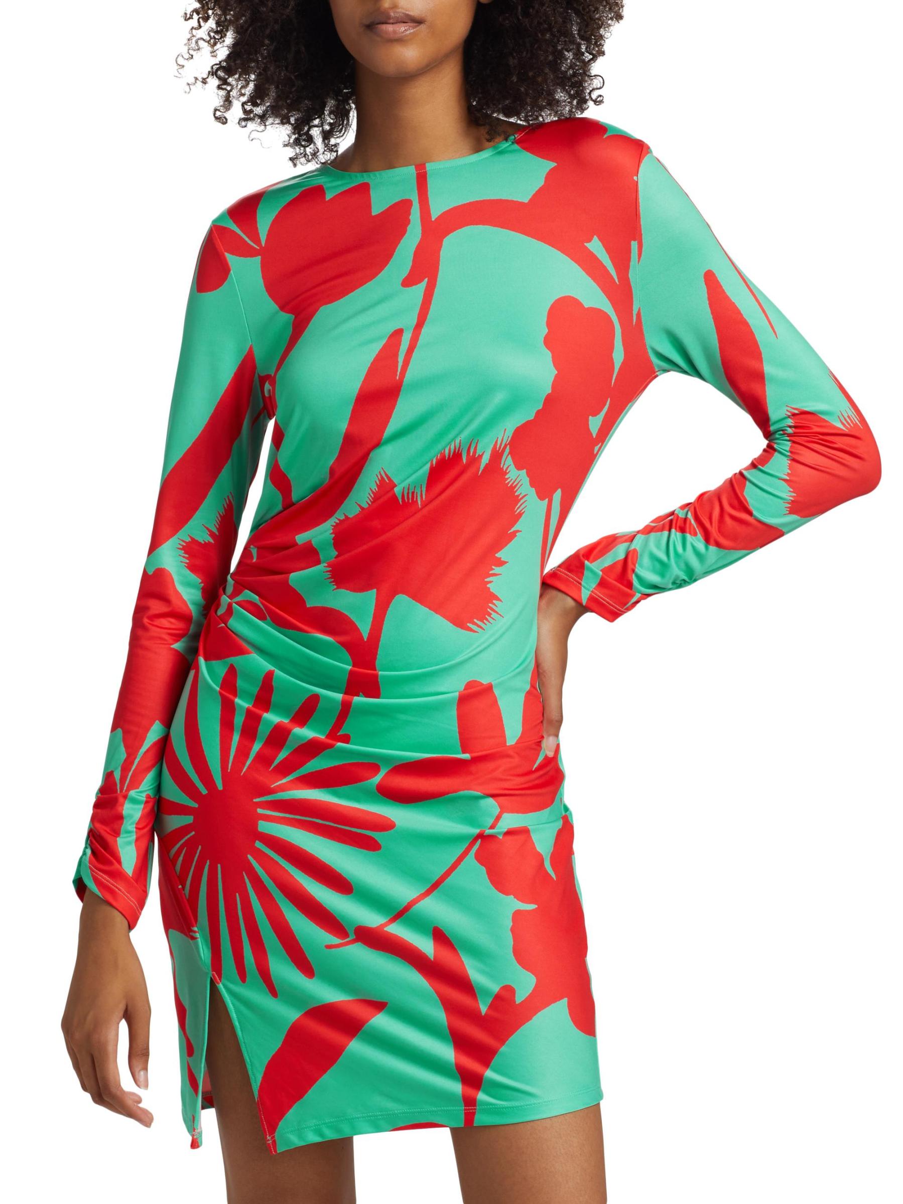 Crafted of stretch jersey, this Hazel minidress from Eywasouls Malibu flaunts a vibrant two-tone botanical print. The long-sleeve design is styled with gathers at the waist and cuffs for a draped effect.
