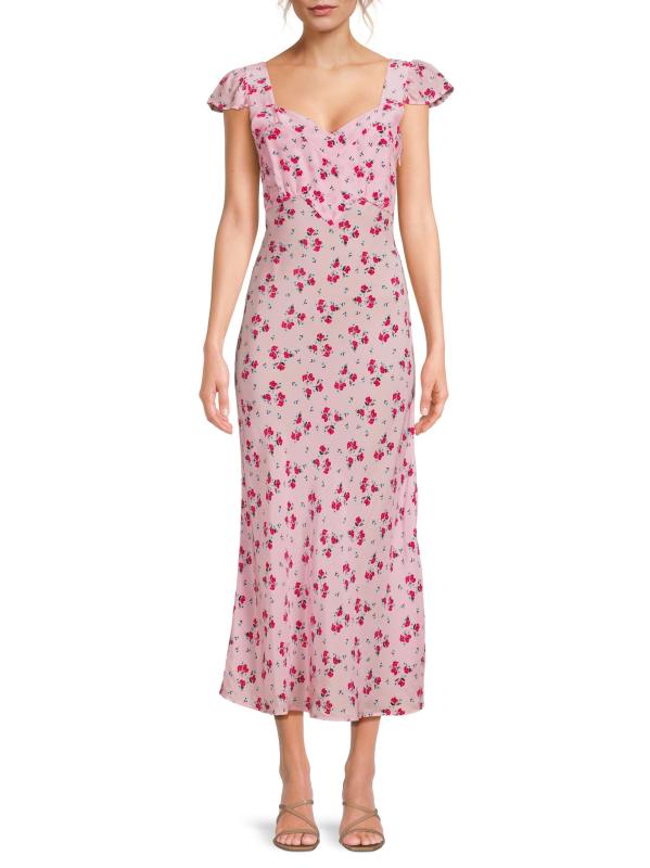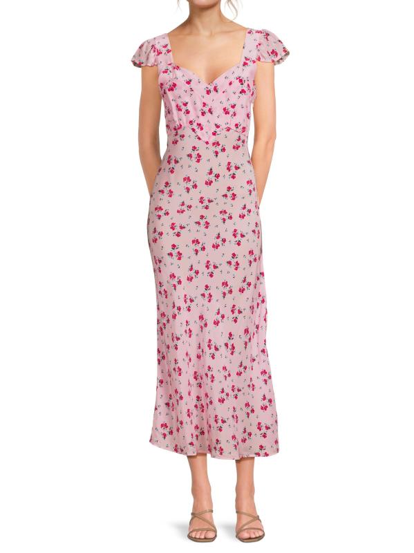 From the Hello Sunshine Collection. The Aurora slip midi-dress from Ciao Lucia blooms with a vibrant floral print and features an empire waist. Flutter cap sleeves add a whimsical touch.