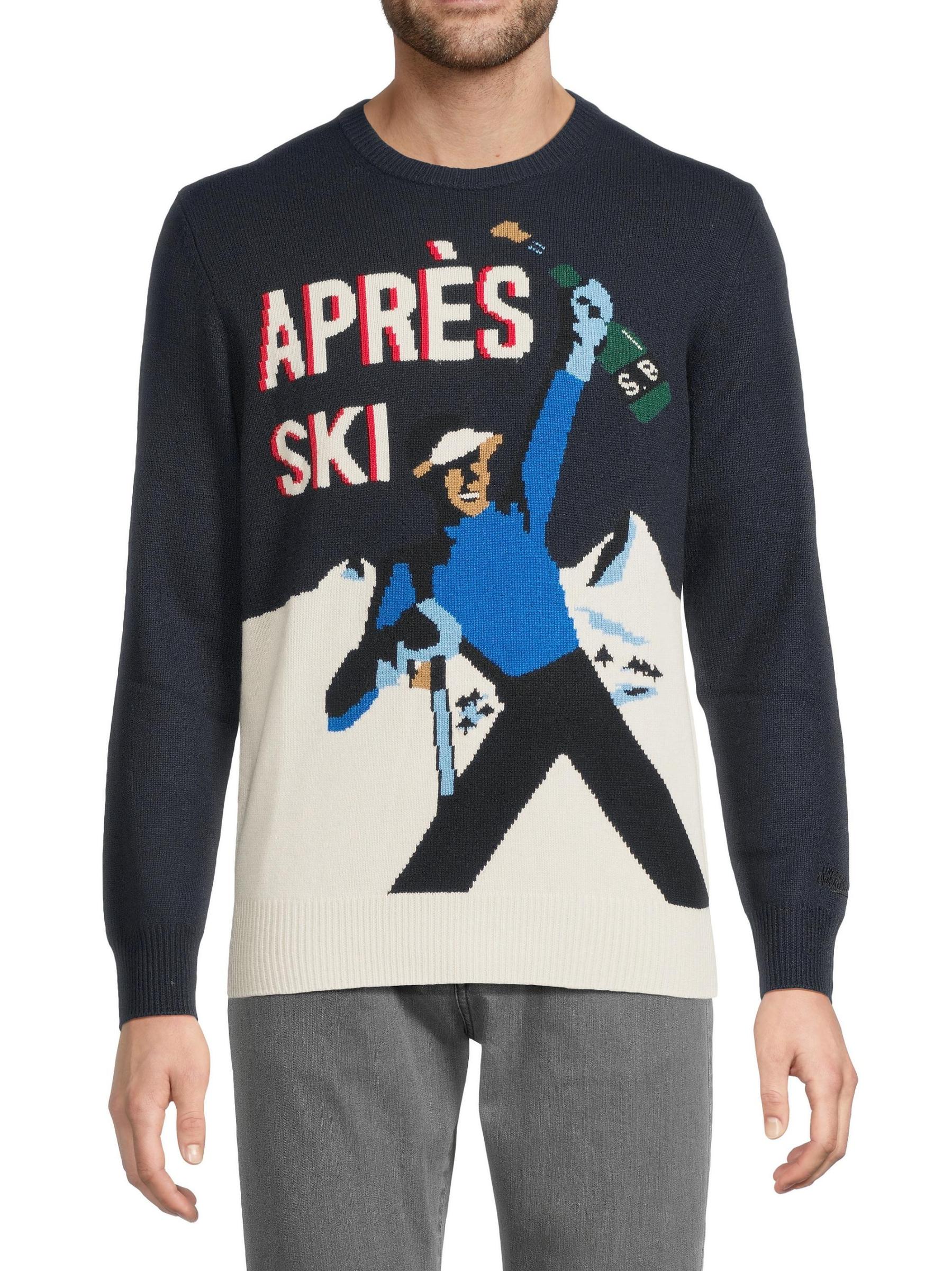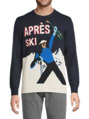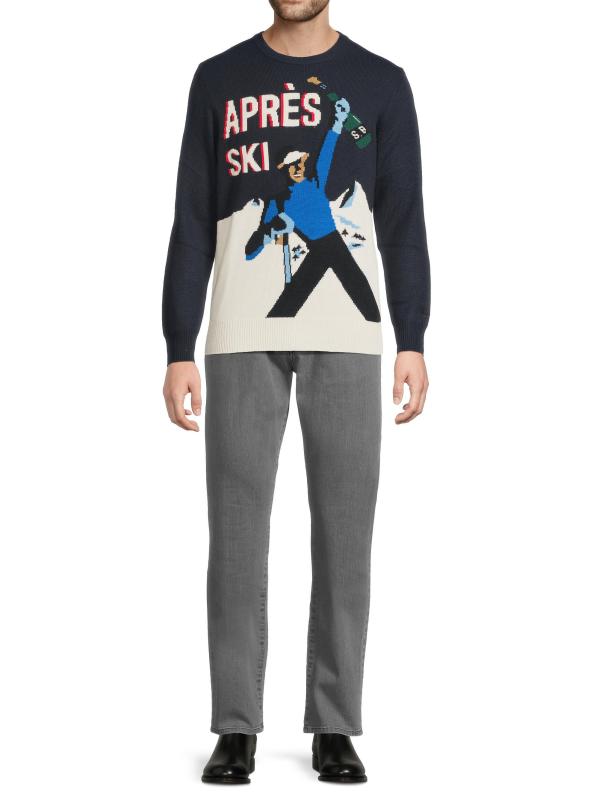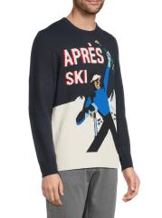 Knit from soft stretch wool, the Heron sweater embodies vintage Alpine glamour with a slim-fit, crewneck silhouette. The design is defined by a playful "Après Ski" jacquard pattern, recalling the charm of classic European ski resorts.