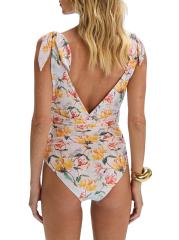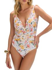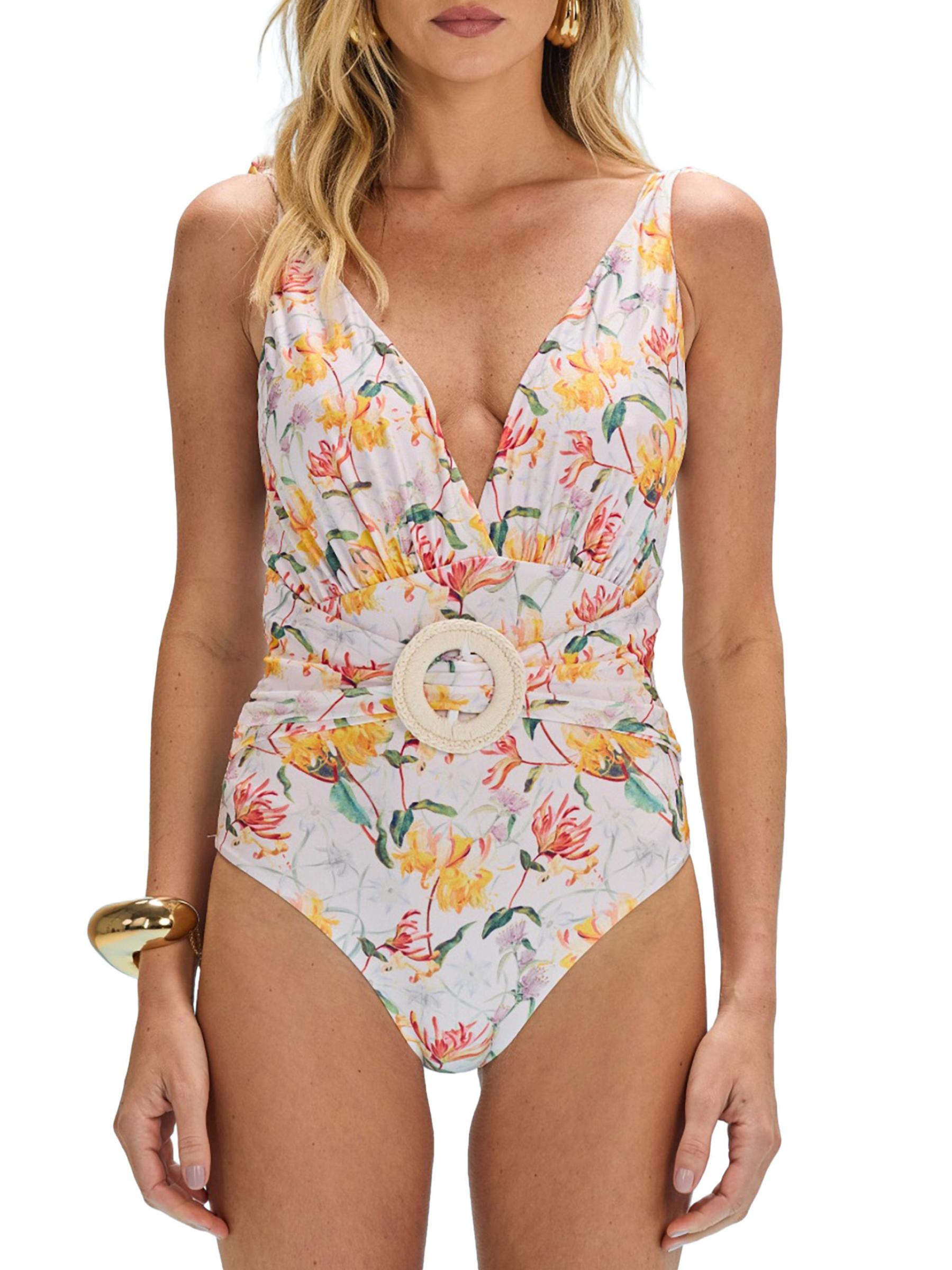 The Honey Flower one-piece swimsuit from PatBO blooms with a floral print and features a plunging neckline and gathered waist.