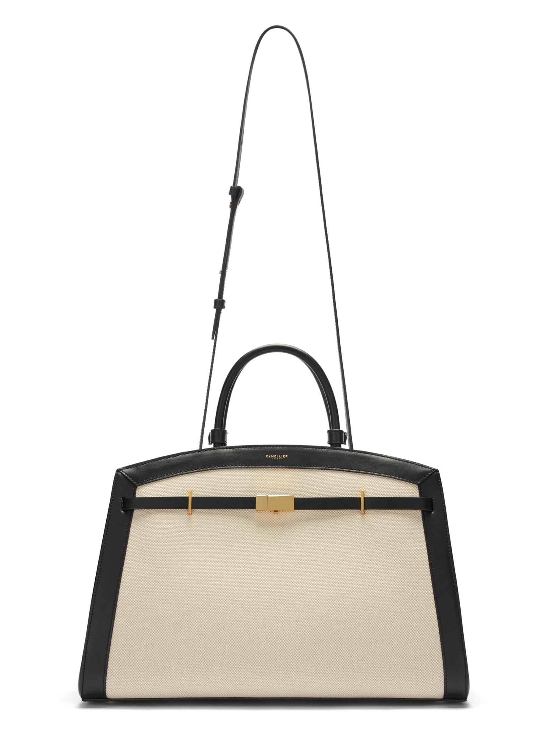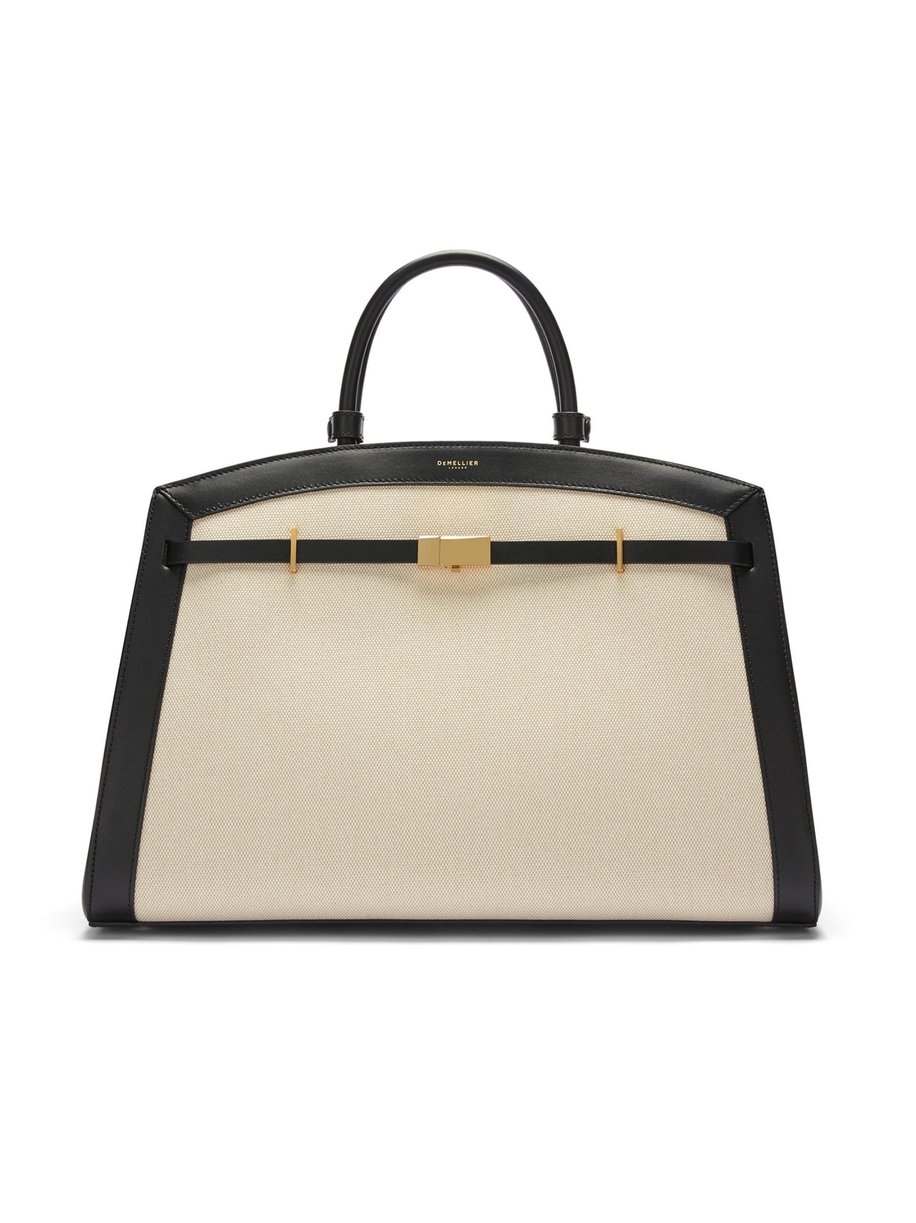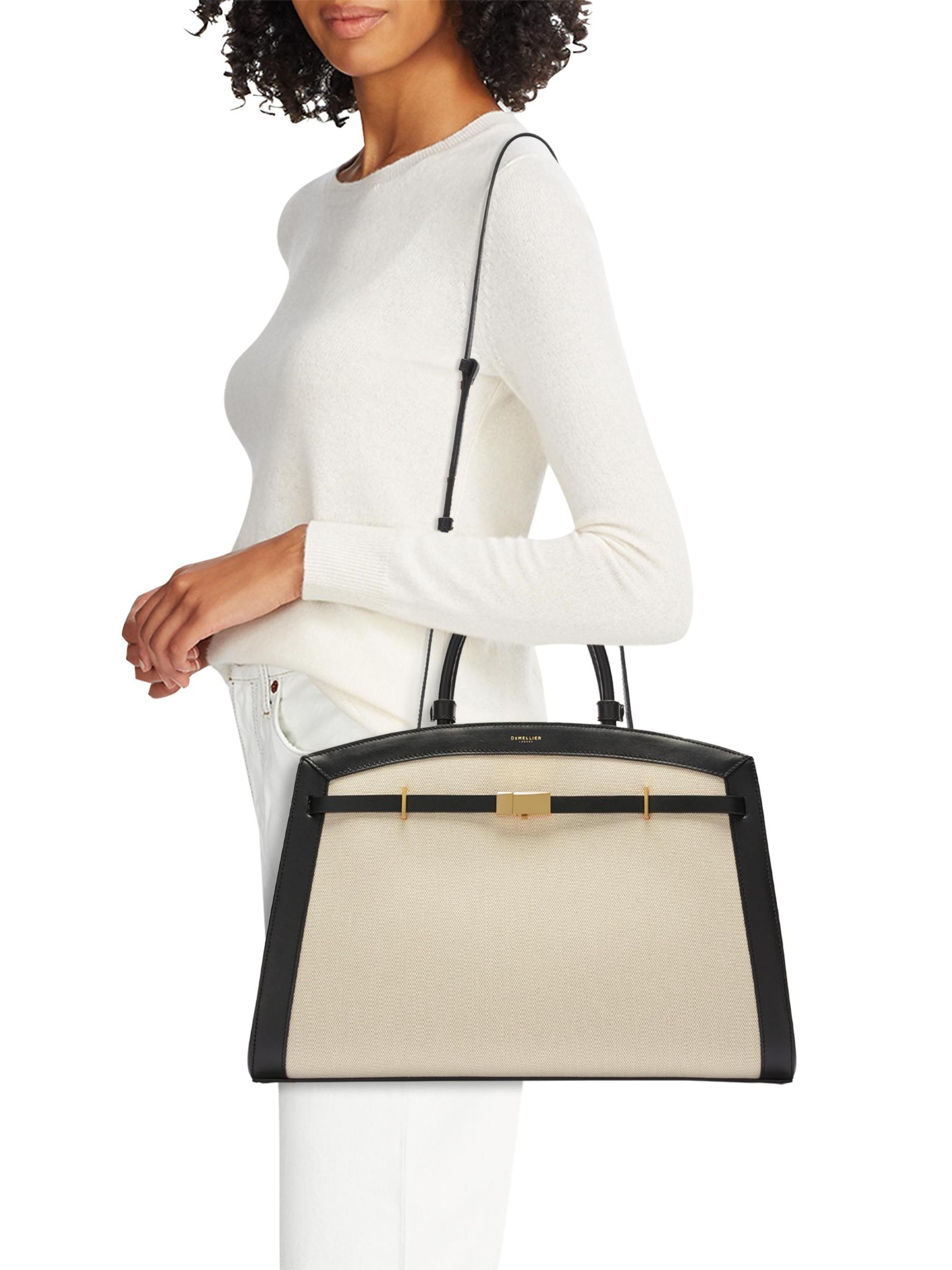 This Hudson top handle bag from DeMellier, crafted of leather and canvas, is designed with two top handles, and an adjustable, removable strap.Two top handles Adjustable, removable strap Interior: one zip pocket and two slip pockets Dust bag Top swivel clasp Leather/canvas Lining: cotton Made in Italy