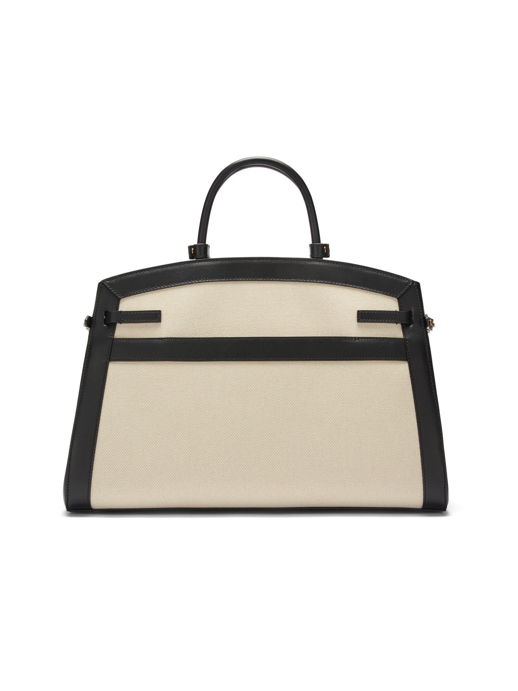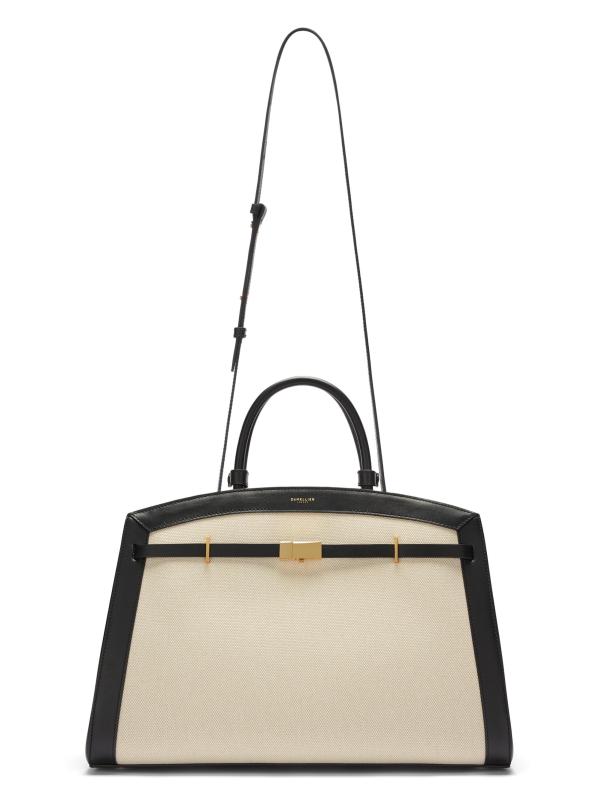 This Hudson top handle bag from DeMellier, crafted of leather and canvas, is designed with two top handles, and an adjustable, removable strap.