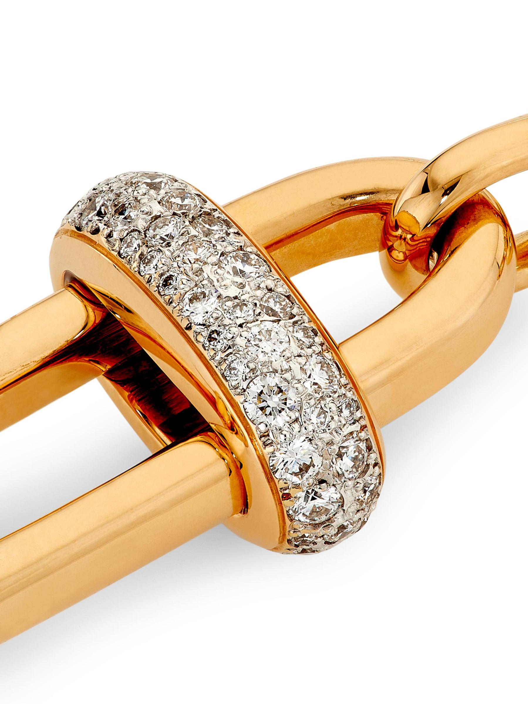 From the Iconica Collection. Pomellato’s bracelet is crafted of 18K rose gold chain and embellished with glittering diamonds.