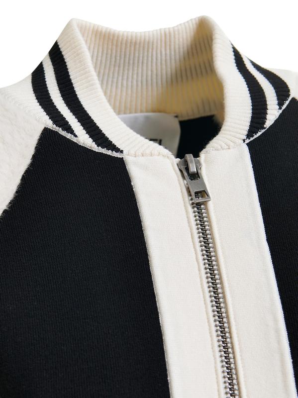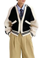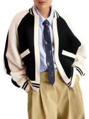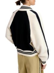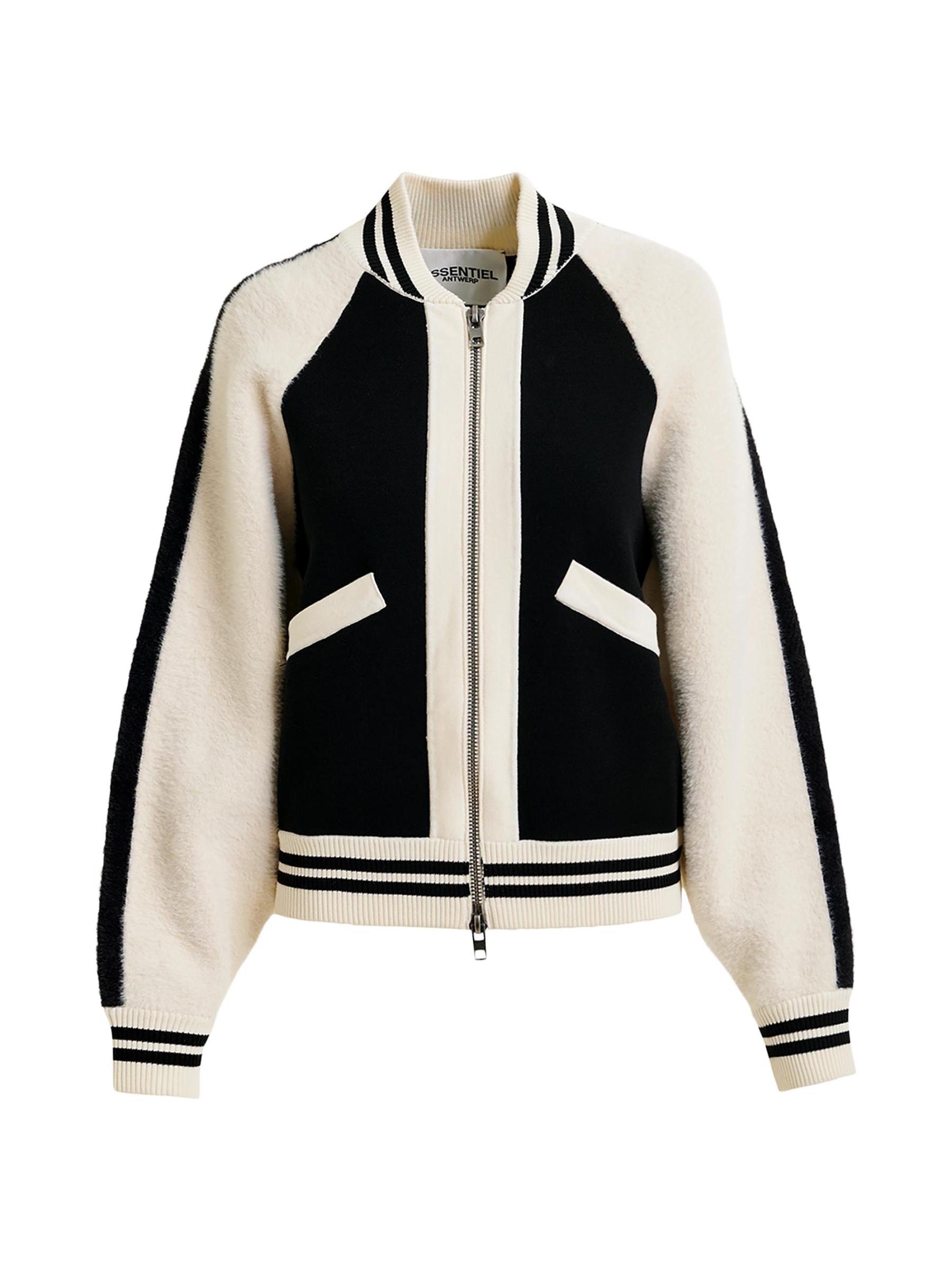The Idol bomber jacket from Essentiel Antwerp is knit with colorblocked styling and a varsity-inspired look.