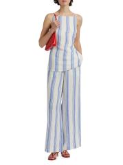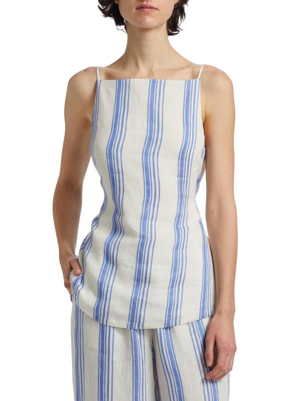 Kivari’s sleeveless Isabelle top is crafted of striped linen and is styled with spaghetti straps, a self-tie belt, and a boatneck.