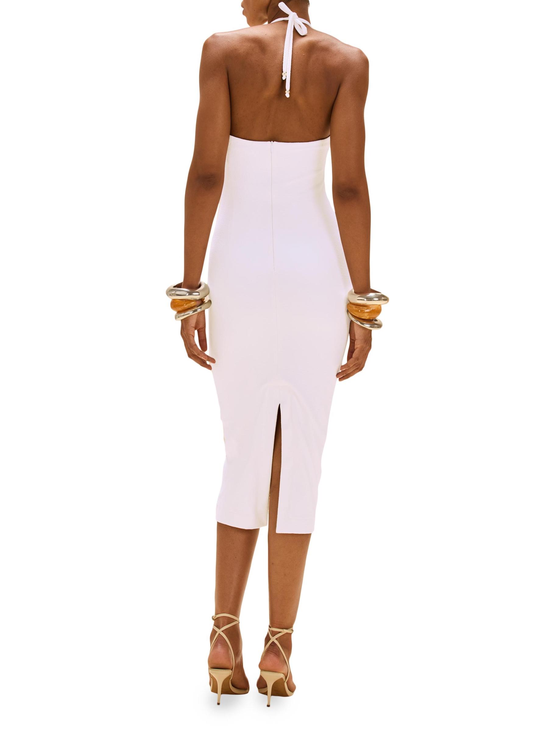 This Jade knit midi-dress from PatBO features a body-con silhouette with a halterneck and intricately embellished front cut outs.