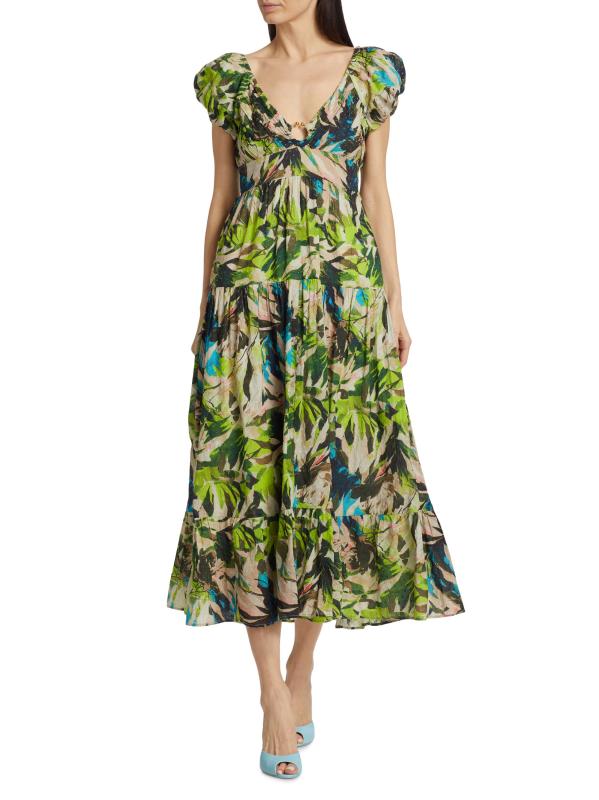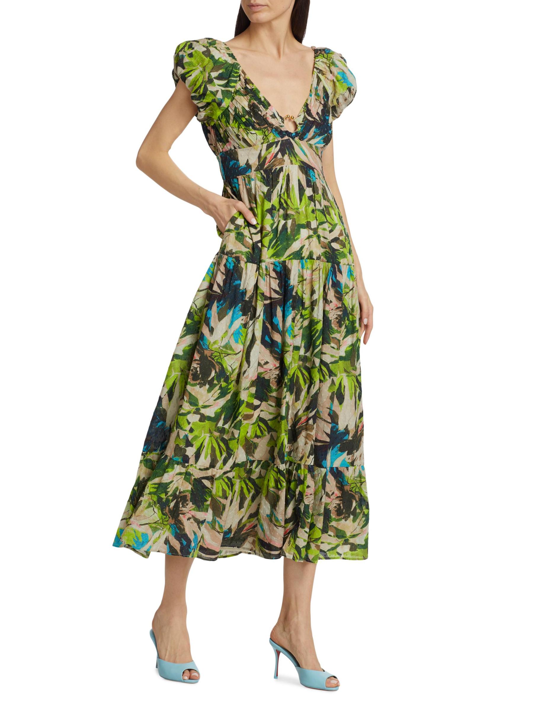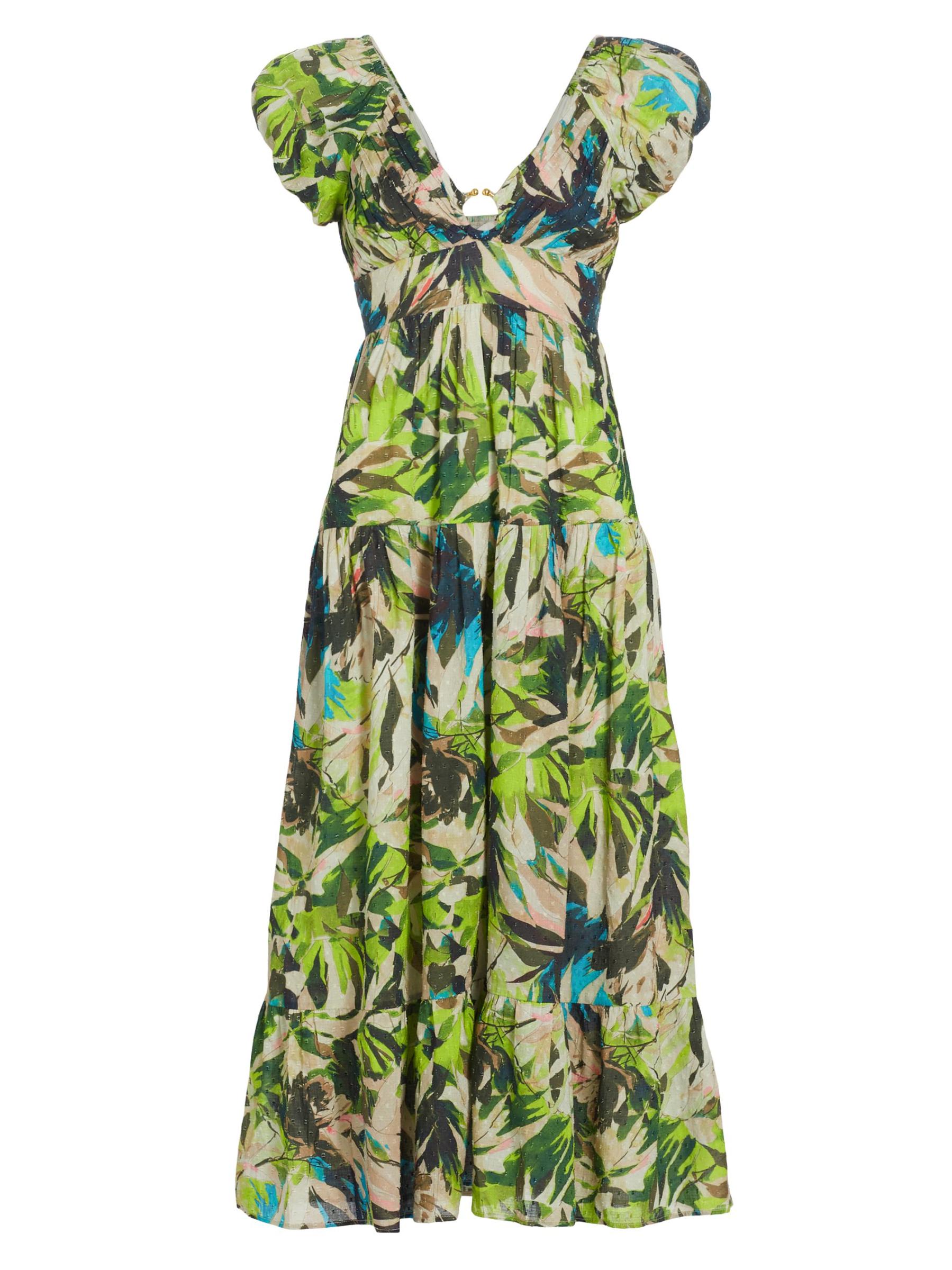 Crafted of lightweight cotton, Love the Label's Jane midi dress flaunts a bright floral motif and O-ring accent.V-neck Short puff sleeves, elasticized cuffs Pulls over 100% Cotton Hand wash Imported