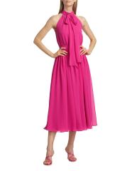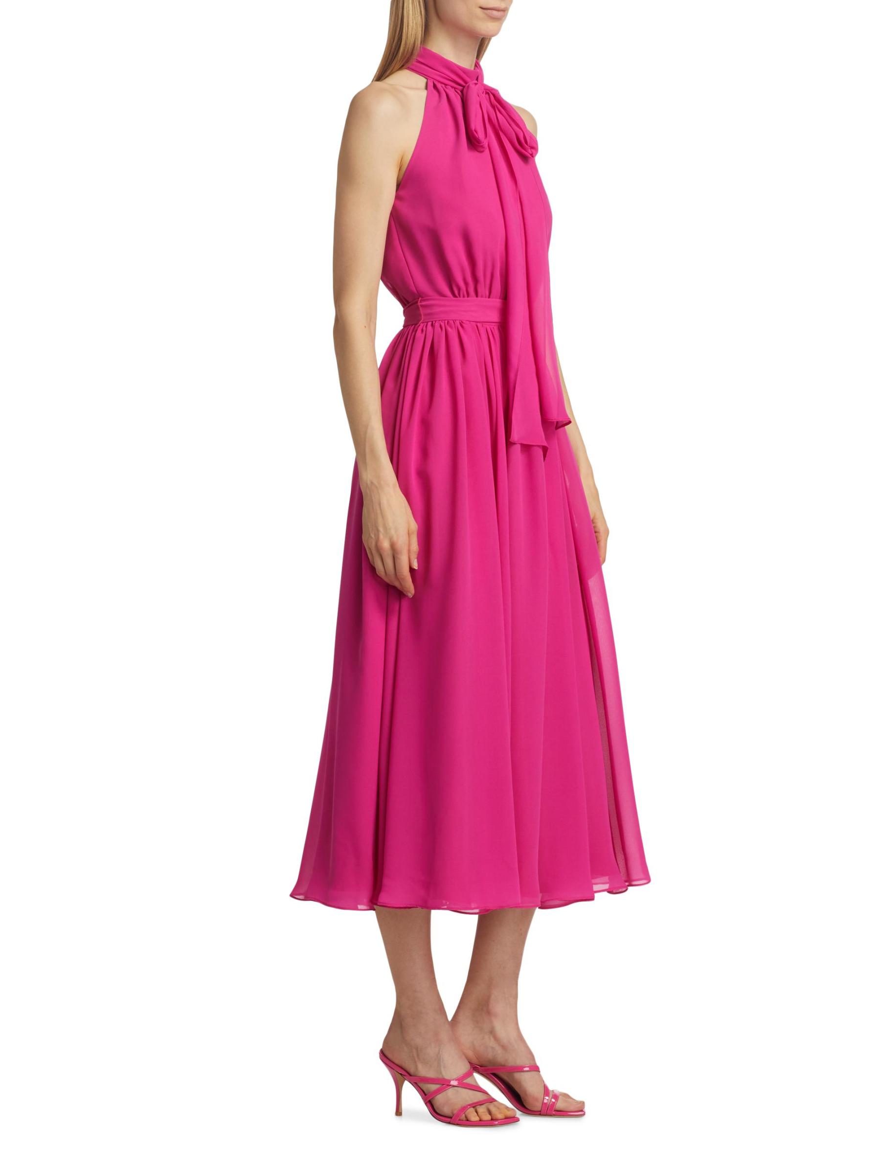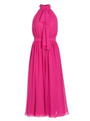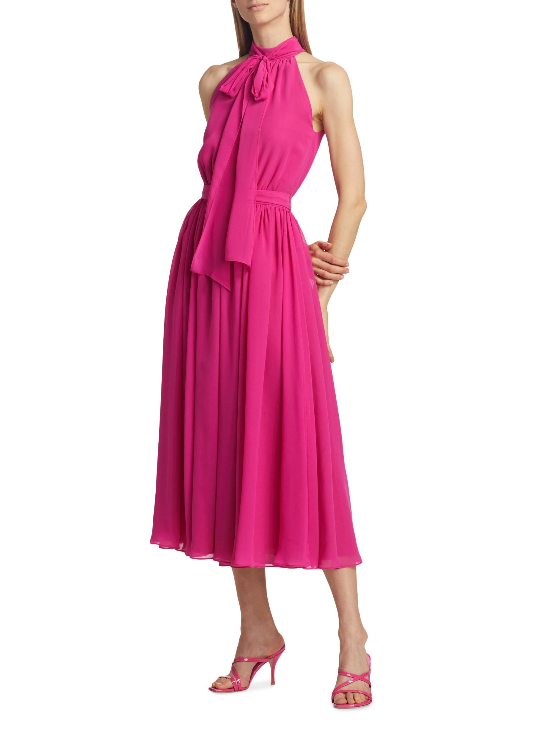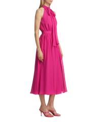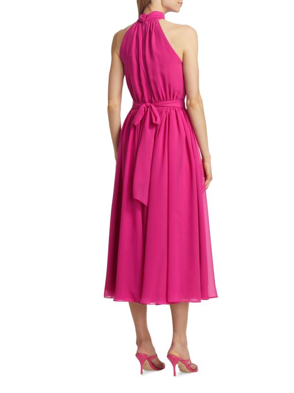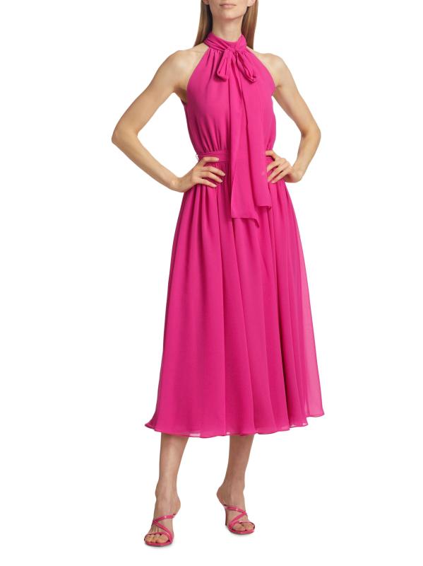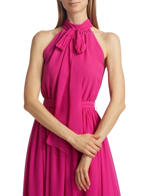 Made in Canada, Catherine Regehr’s Jasmine pleated georgette sleeveless midi-dress is styled with a tieneck, self-tie belt, and flowing skirt.