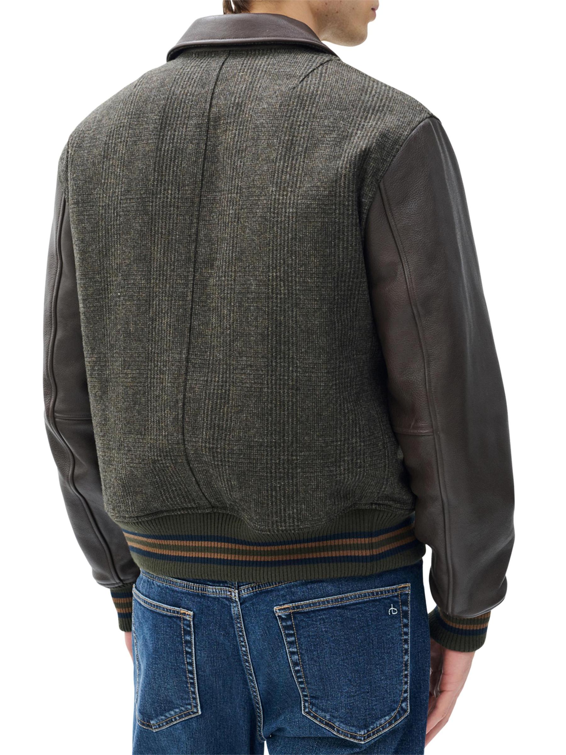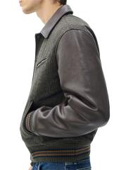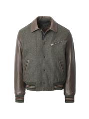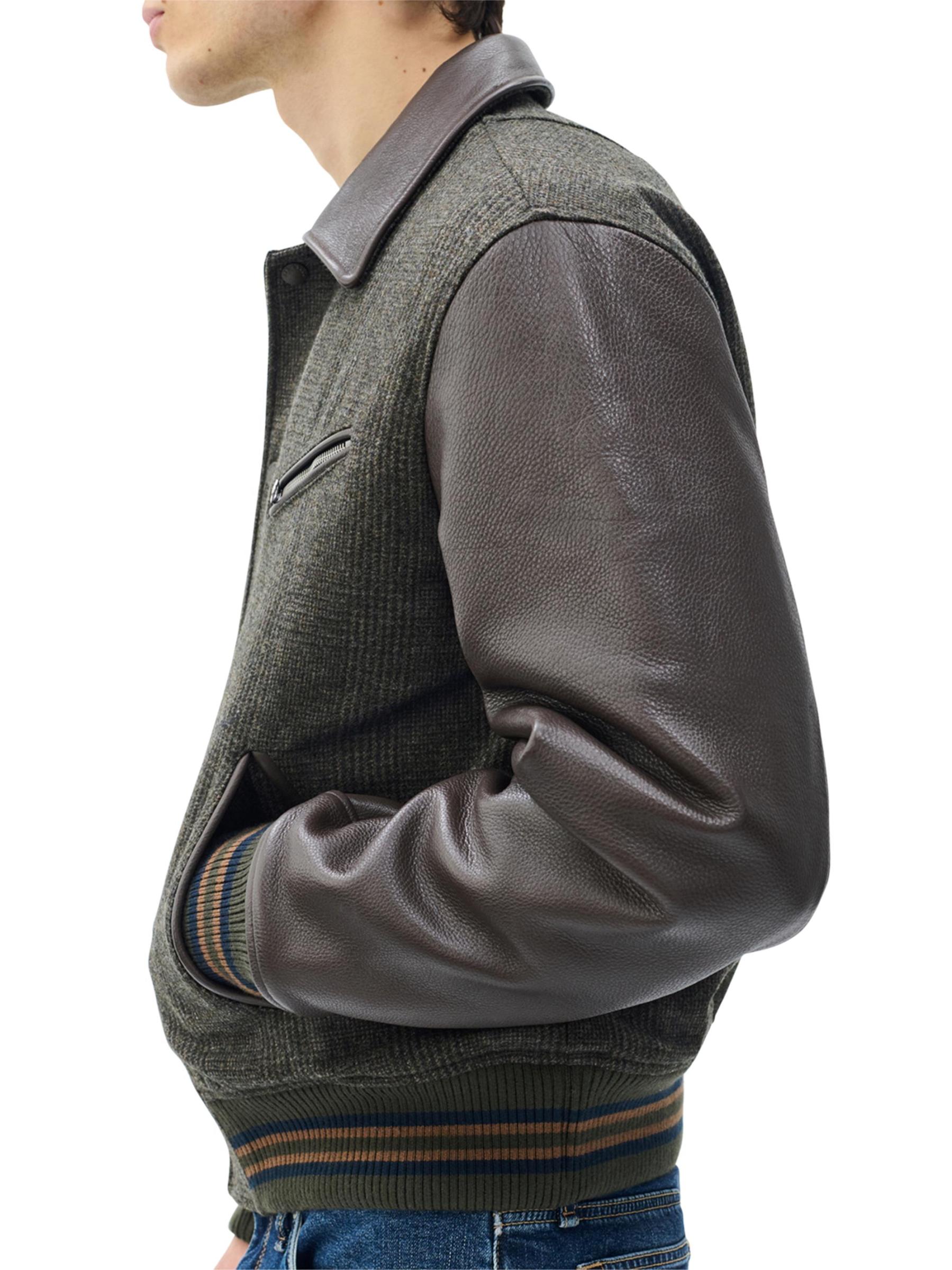 bone, crafted of wool, features a leather collar and sleeves. This piece is outfitted with pockets at the chest and sides and boasts a subtle plaid pattern.Spread collar Long sleeves, rib-knit cuffs Chest zip pocket Side slip pockets Rib-knit hem Front snap closure 100% wool Collar and sleeves: 100% leather Dry clean Imported