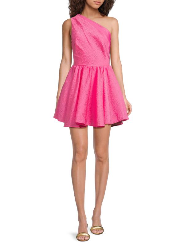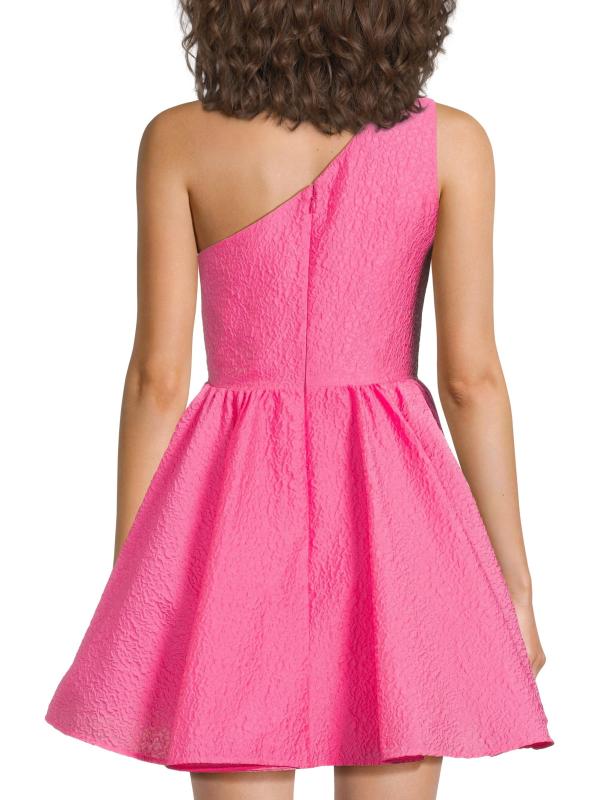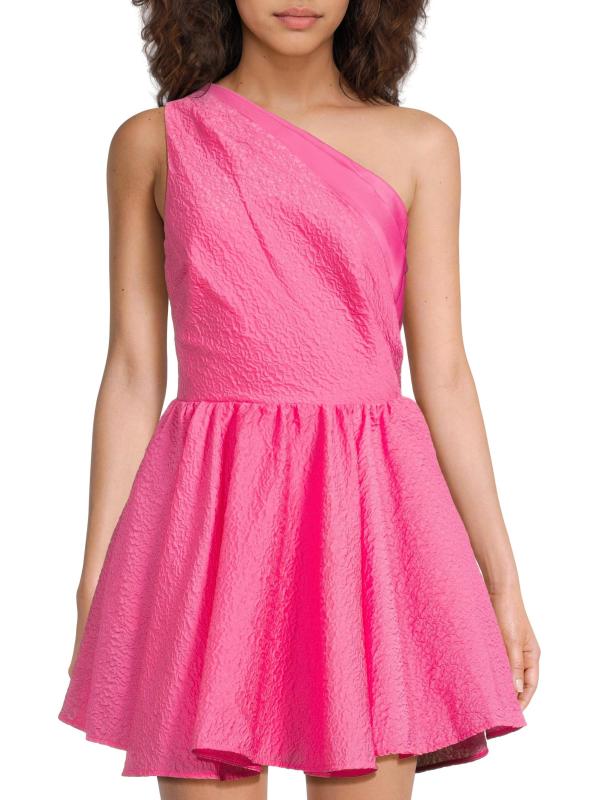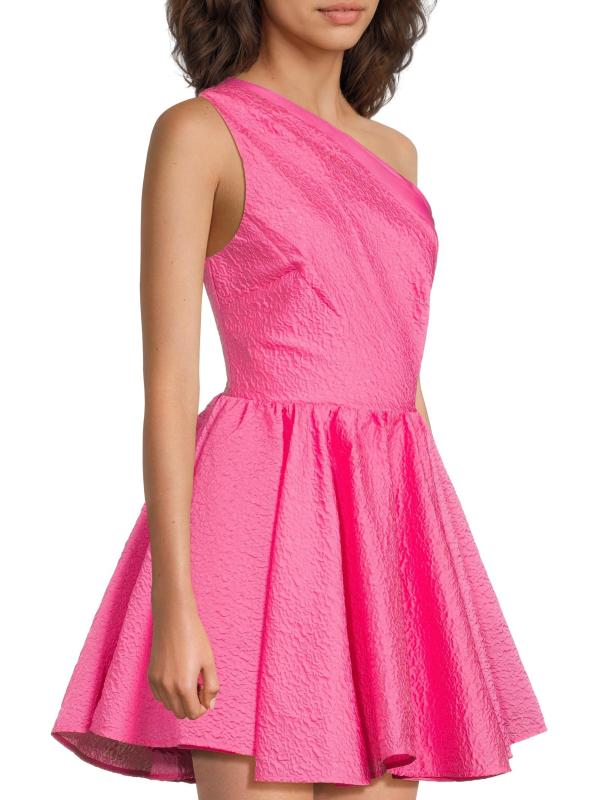 Finished in a textured cloqué jacquard, Sau Lee's Jo minidress highlights the one-shoulder neckline with a satin trim. This playful fit-and-flare silhouette features a sleeveless cut and shirred natural waist.